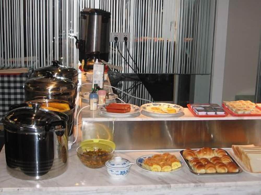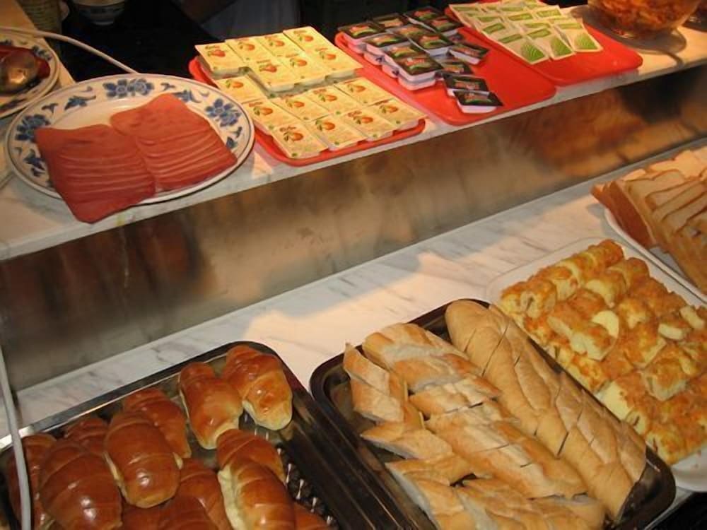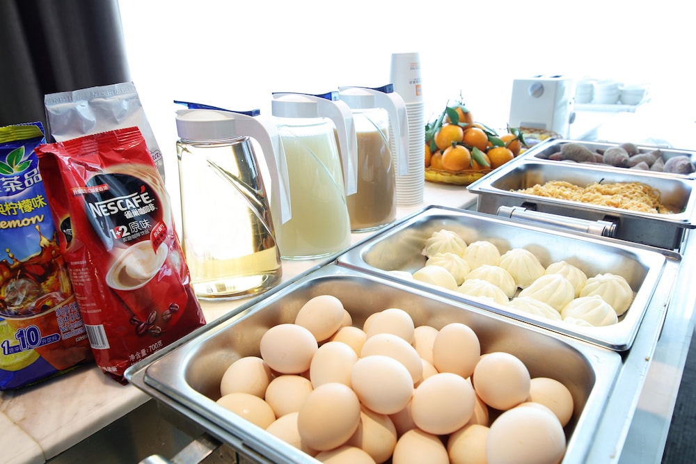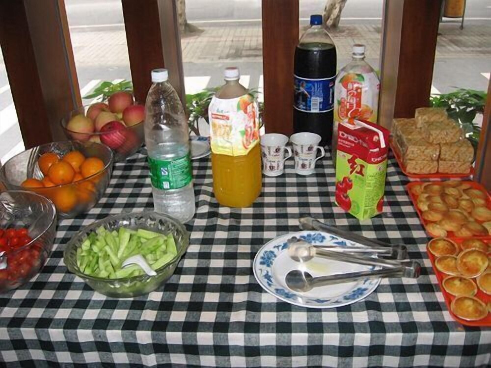 朝食は10元で、米粥、焼きそば、饅頭、ゆで卵、パンなど数品の軽食、飲み物は甘い牛乳だけでコーヒーなどはなし。近所に朝食を出す店はありません。
