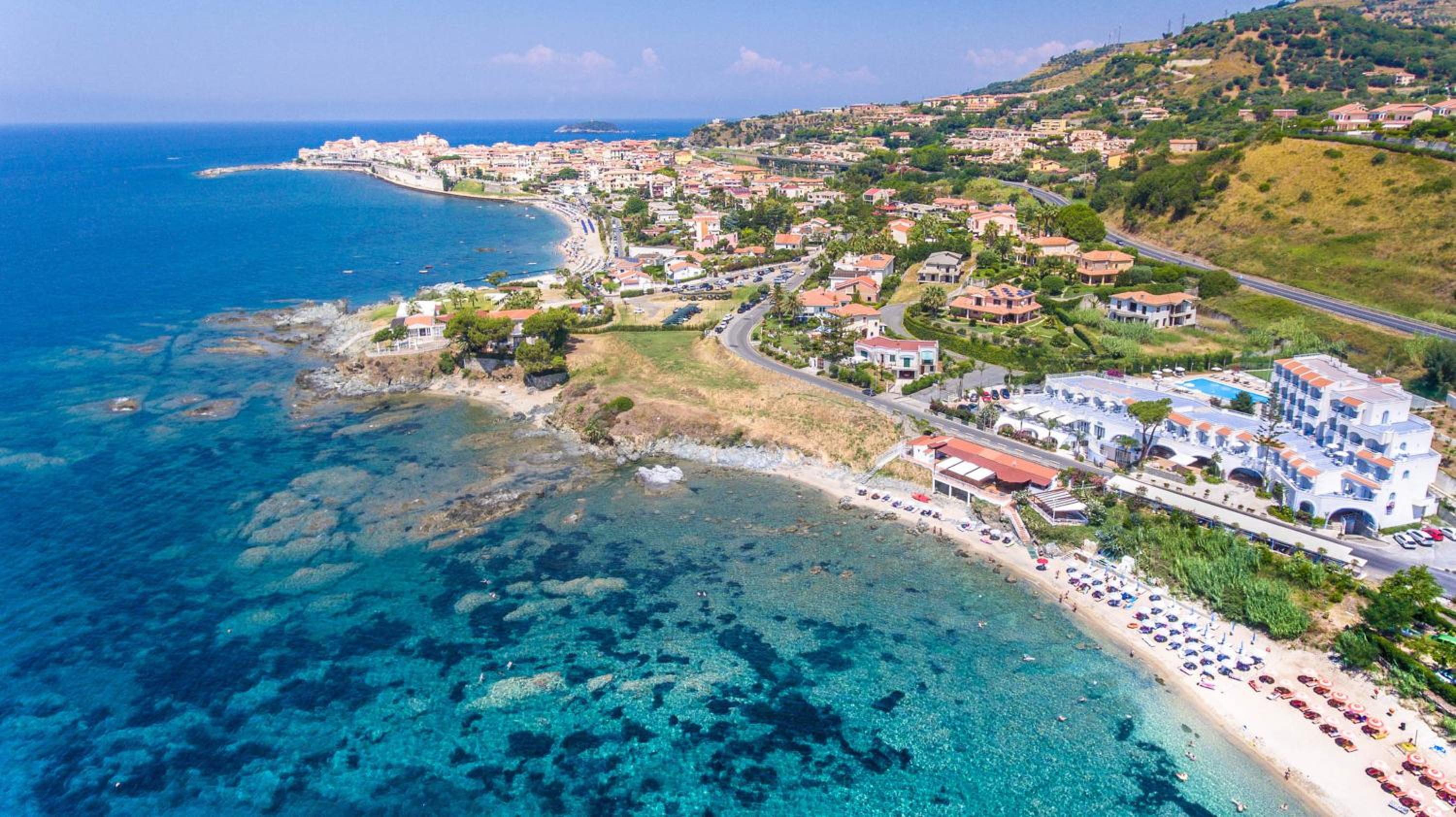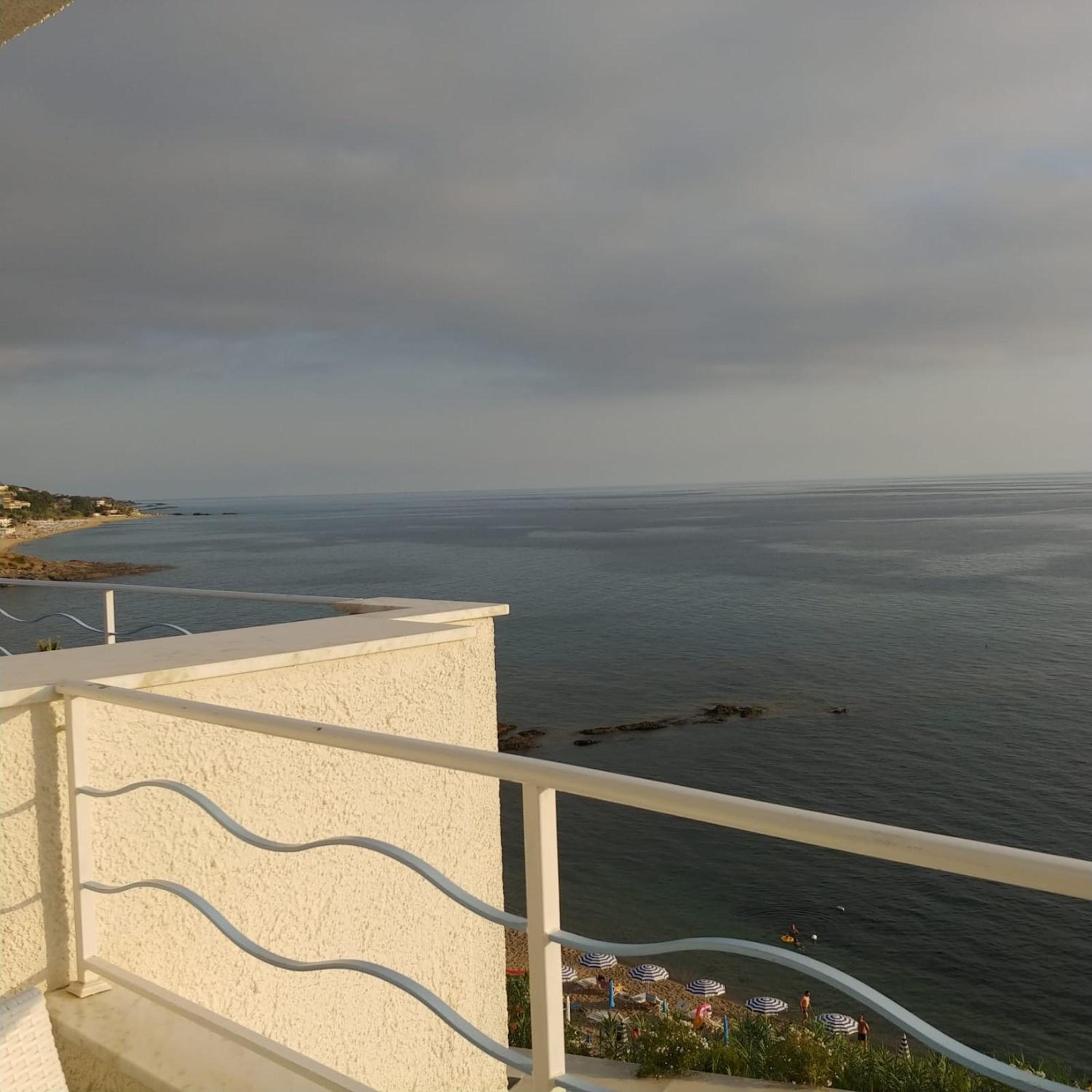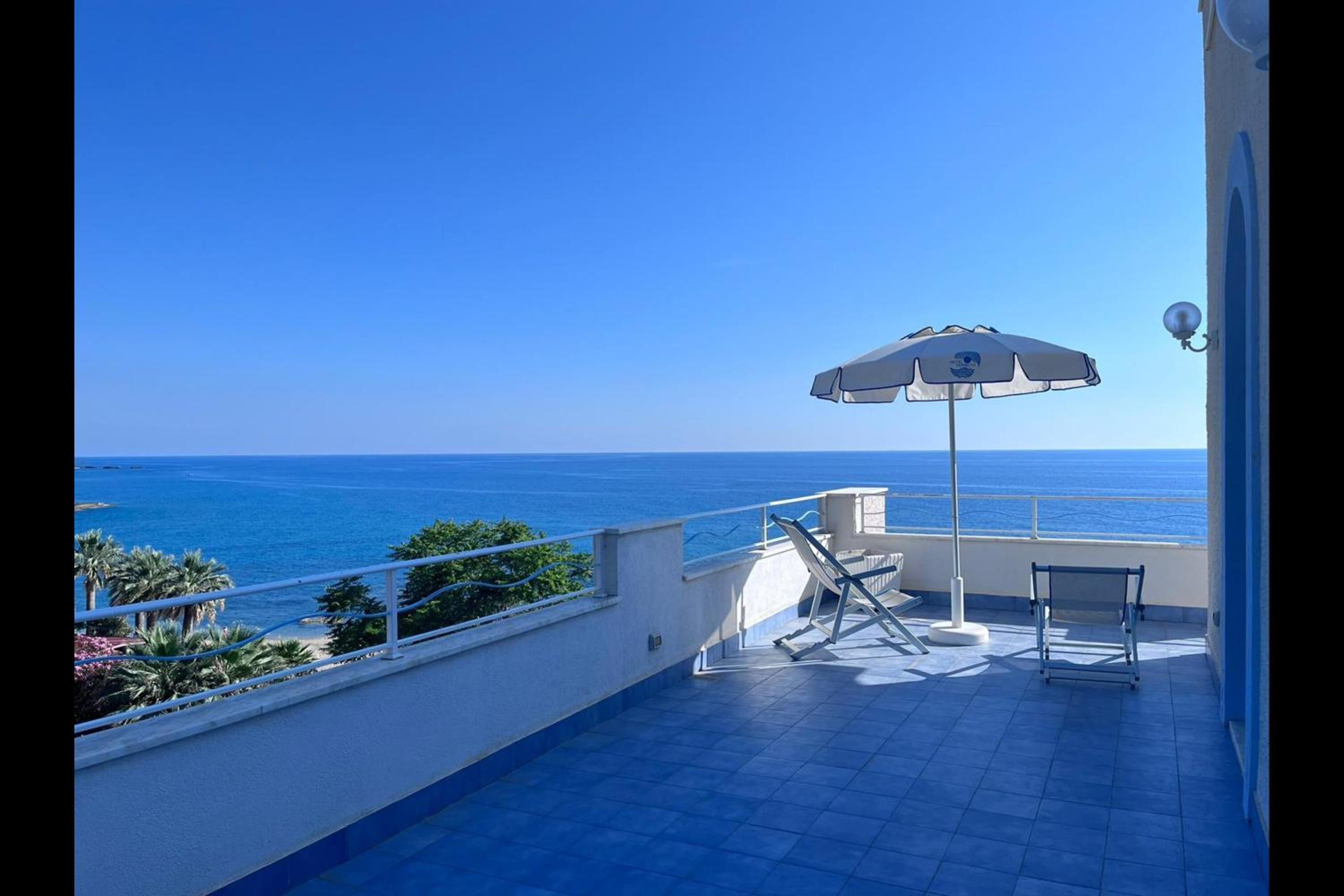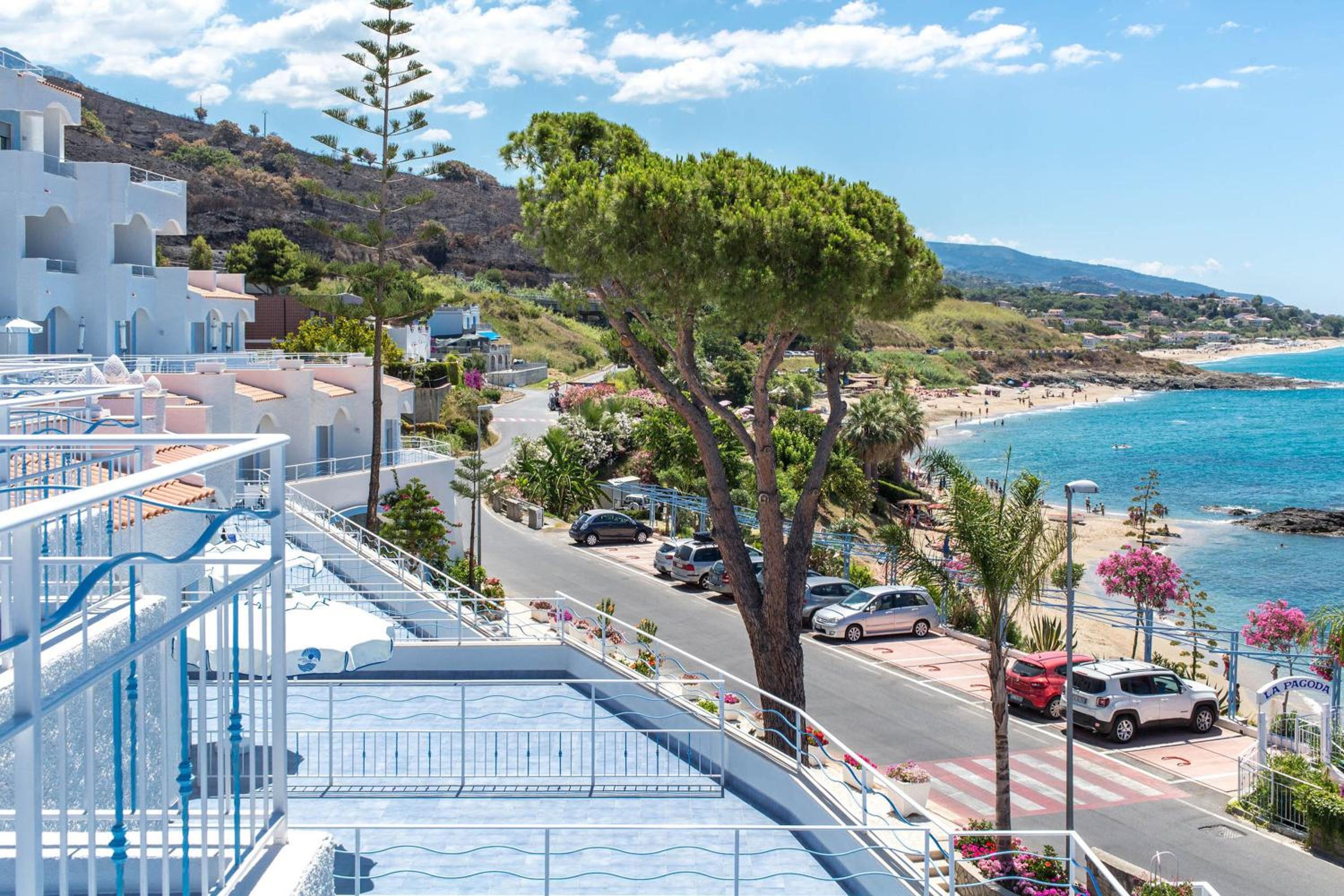 Plage privée avec transats et douche et restaurant surplombant la mer.l’hotel est très propre et bien entretenu et le personnel très sympathique et souriant.la ville de Diamante est a 10mn a pied.