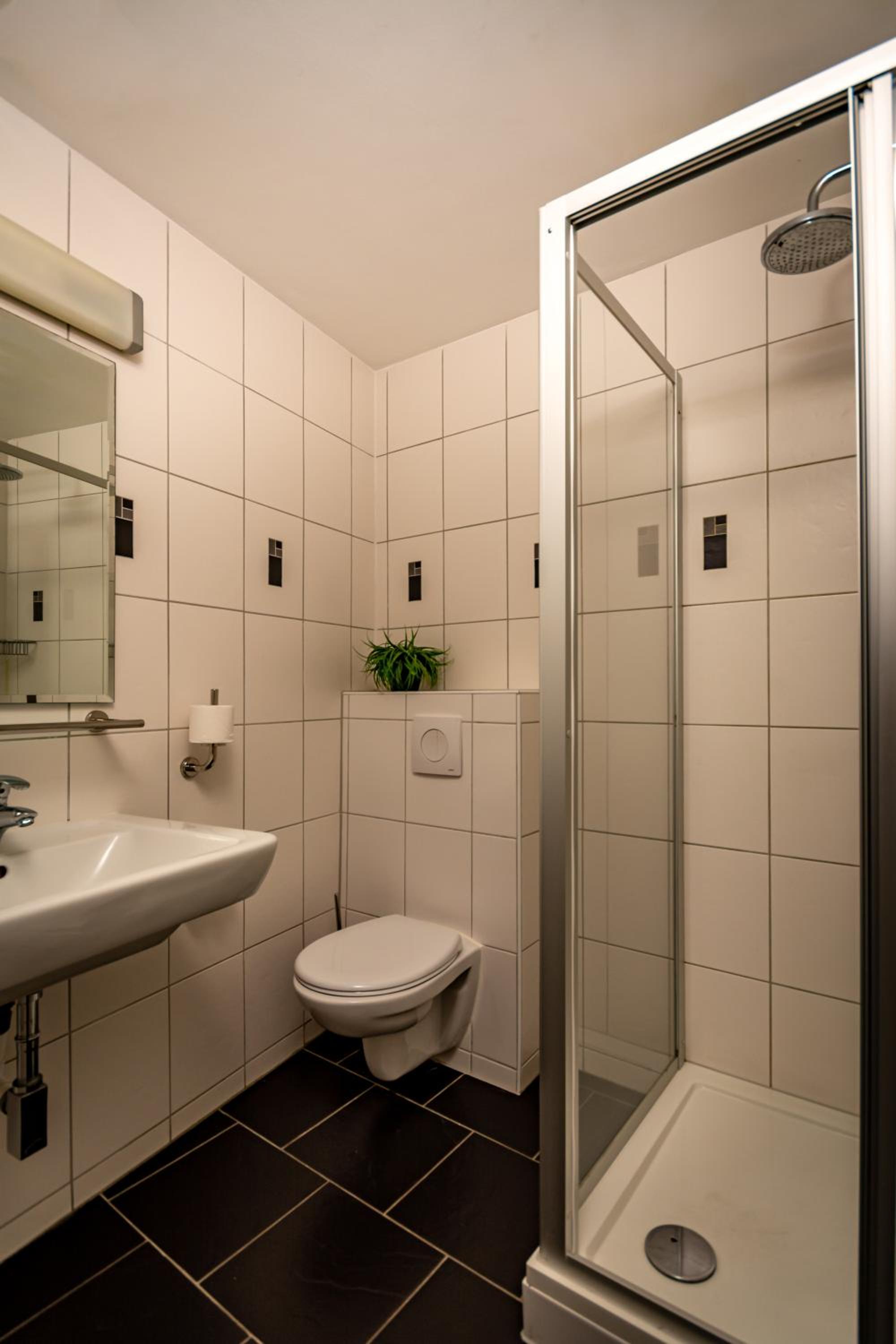 Das Badezimmer ist für große Personen sehr beengt.