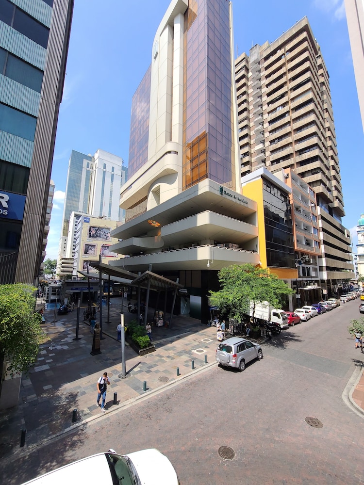 This is a nice budget place to stay. Very hot showers, along with good AC, and the room was very clean. There was no microwave or safe in my room, so you may want to check on that if you care. You are two blocks from Malecon 2000 and there's a bus stop right outside the front door. Everything is 2nd floor or higher, also, with an empanada shop on the first floor outside. Outside does get a bit noisy if you have the window open. Again, I had a nice stay and the people at the desk know some English to help you out if needed, as most people in town don't speak any English. Bring small bills, 1's, 5's and coins, as there's not much change to go around when shopping and taxi's.
