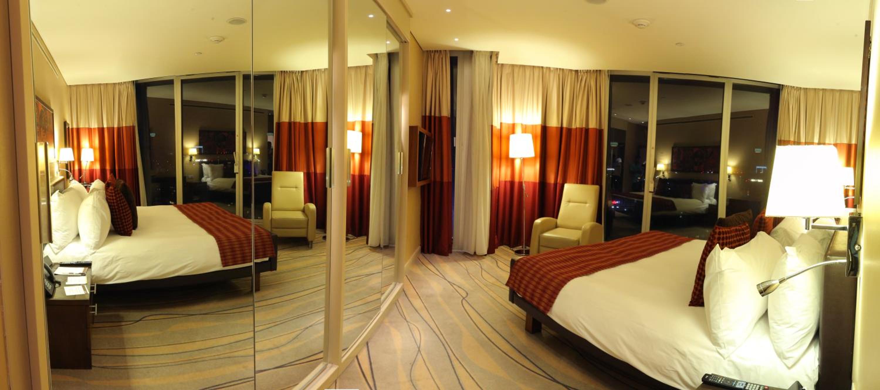 The air-conditioned suites feature a blend of tiled and carpeted floors, a cozy living area with a flat-screen TV, and a private balcony with city views. Each suite includes a well-equipped kitchenette with tea/coffee facilities, perfect for a comfortable stay. Interconnecting rooms are also available for larger groups or families.
