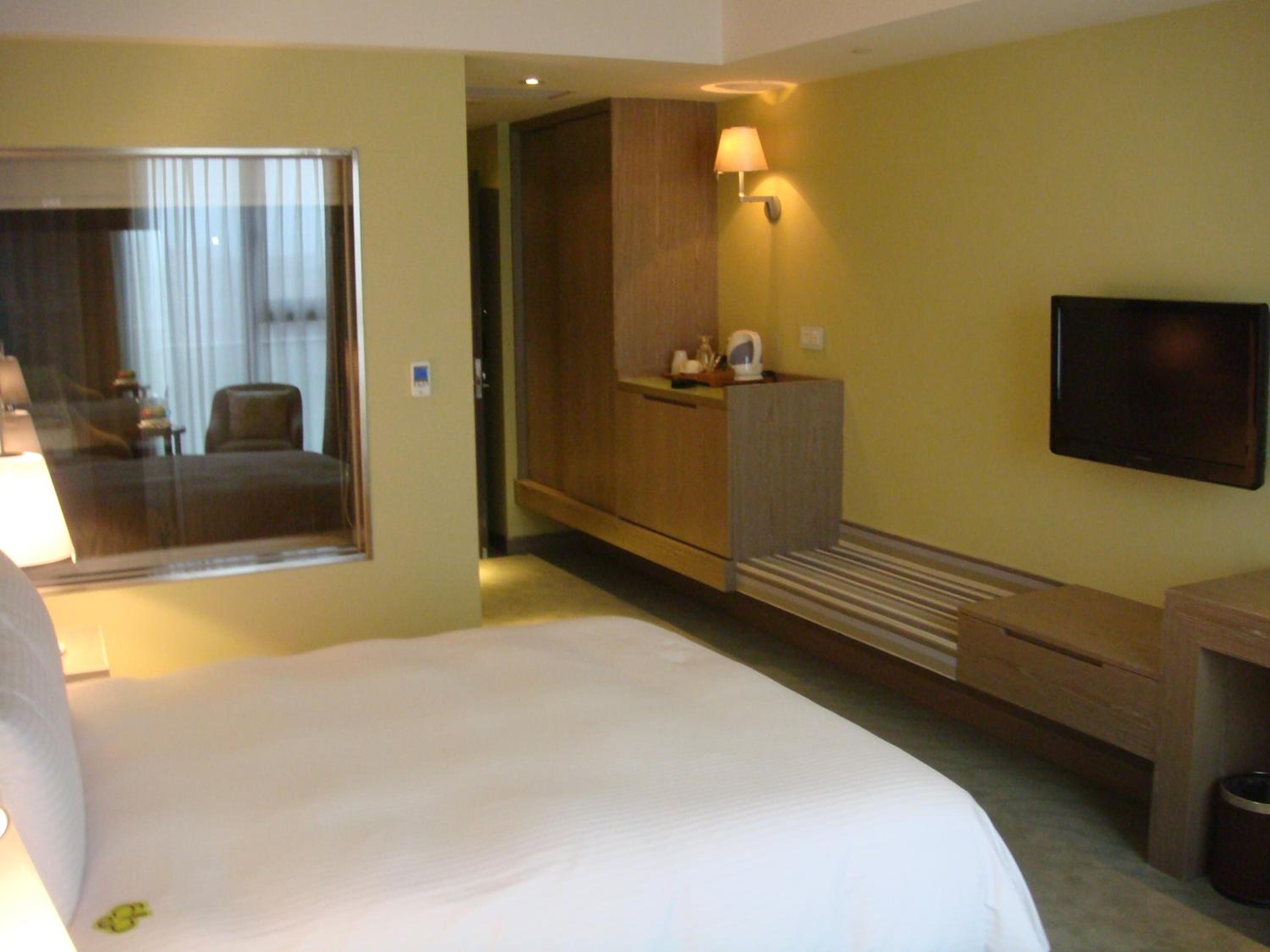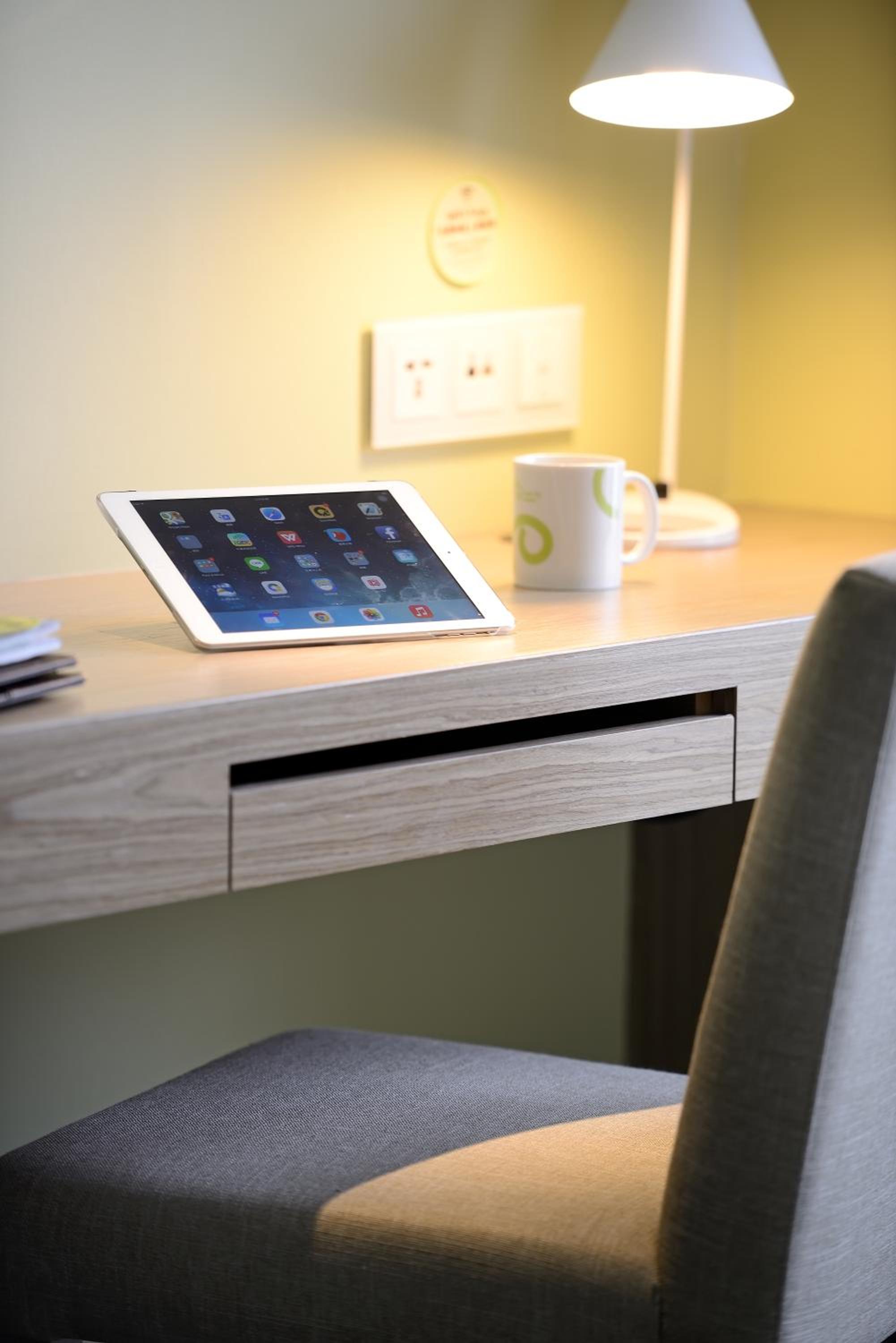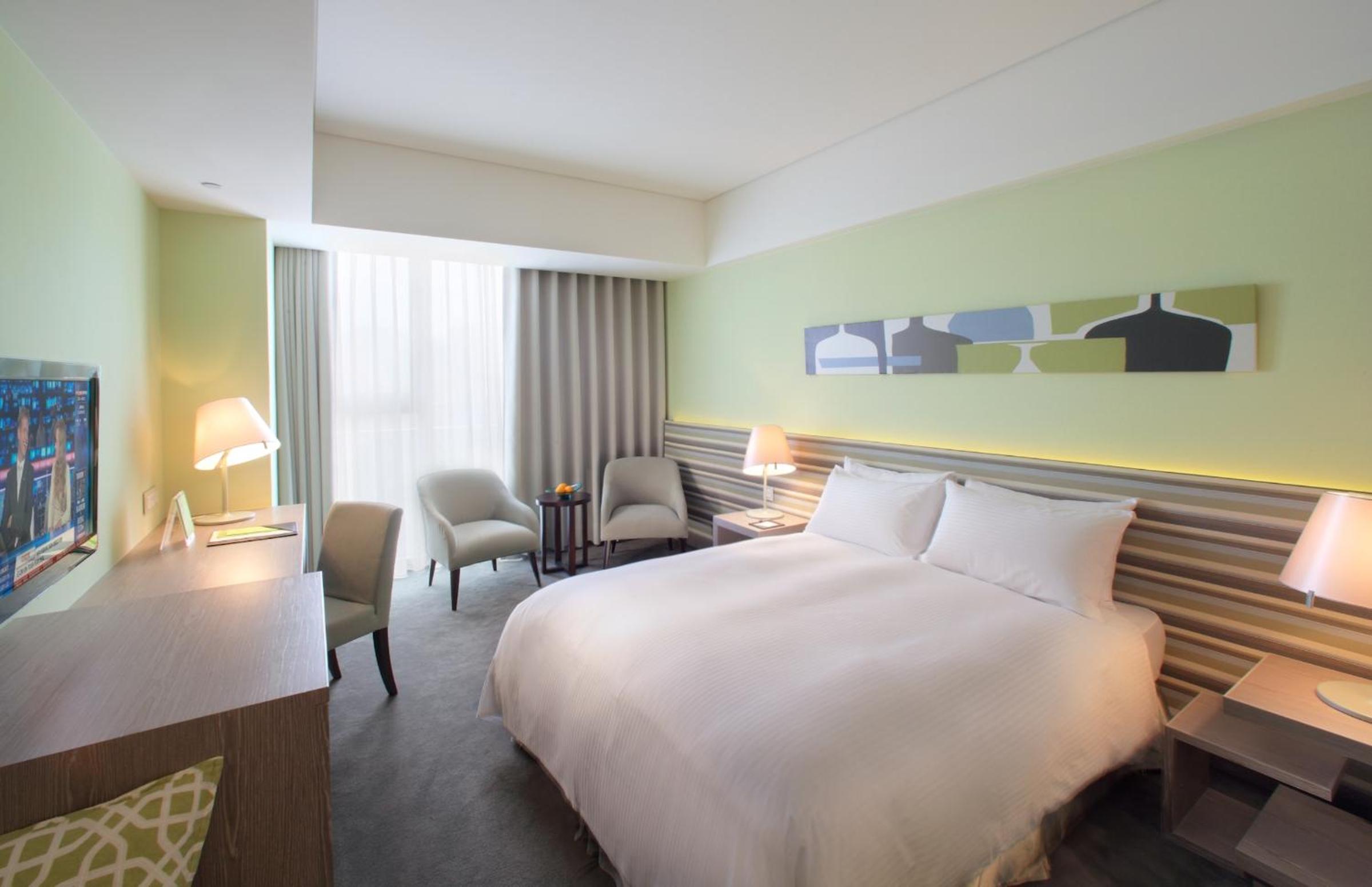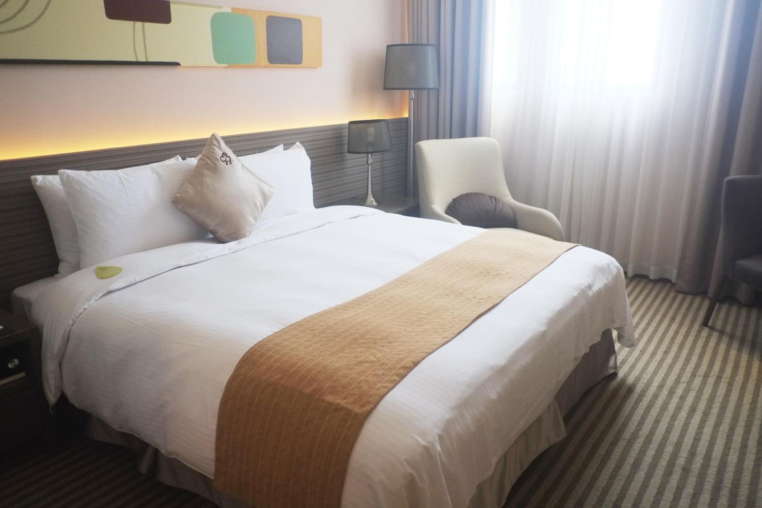 Indulge in the tastefully decorated rooms at Park City Hotel Luzhou featuring modern interiors and soothing wall colors, creating a relaxing ambiance for your stay.