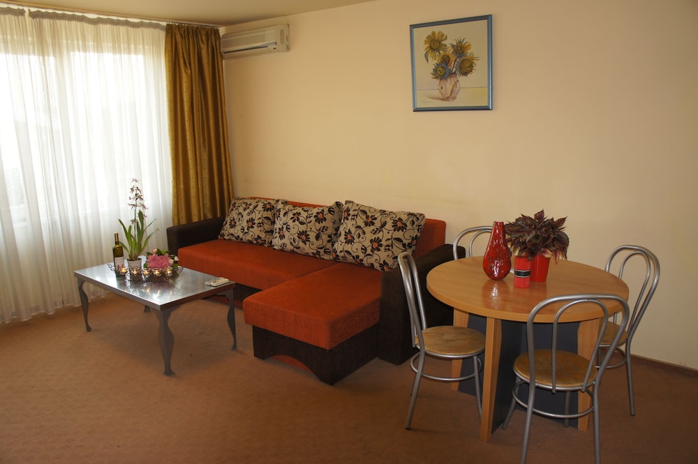 On arrival we thought "what on earth are we entering" . The guy on the desk was a bit grumpy but it was Sunday evening and he had to come in to let us in . The lobby part smelt and needed a lick of paint . On entering the appartment we could smell cigarette smoke. We opened the windiws and it went after a while . We had a double bedroom with TV ,bed and wardrobes . There was a large bathroom but door didn't close but we learnt how to prop it closed. The living room had a TV, table,and chairs, coffee table and a large sofa bed that was comfortabe. The bonus was having a kitchen with a cooker hob, microwave , fridge ,also cutlery and plates ect.