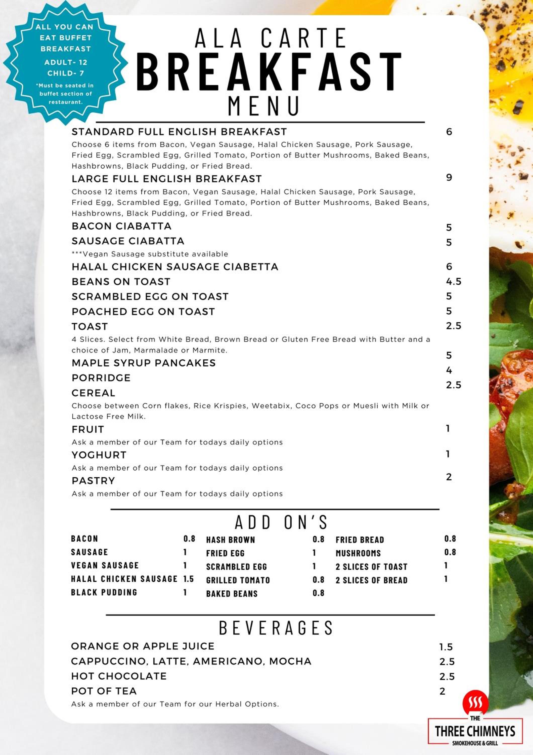is served as a Buffet and consists of Toast, Cereals, Juice, Hot Drinks, Pastries, Fruit and Yogurts, Bacon, Sausages, Fried Eggs or Scrambled Egg, Tomatoes, and Beans. Hashed Browns, Mushrooms, and Fried Bread. We also have Gluten Free and Vegan options. (Occasionally Breakfast may be cooked to order instead of the Buffet, but you will still be able to choose to have whatever you want).
