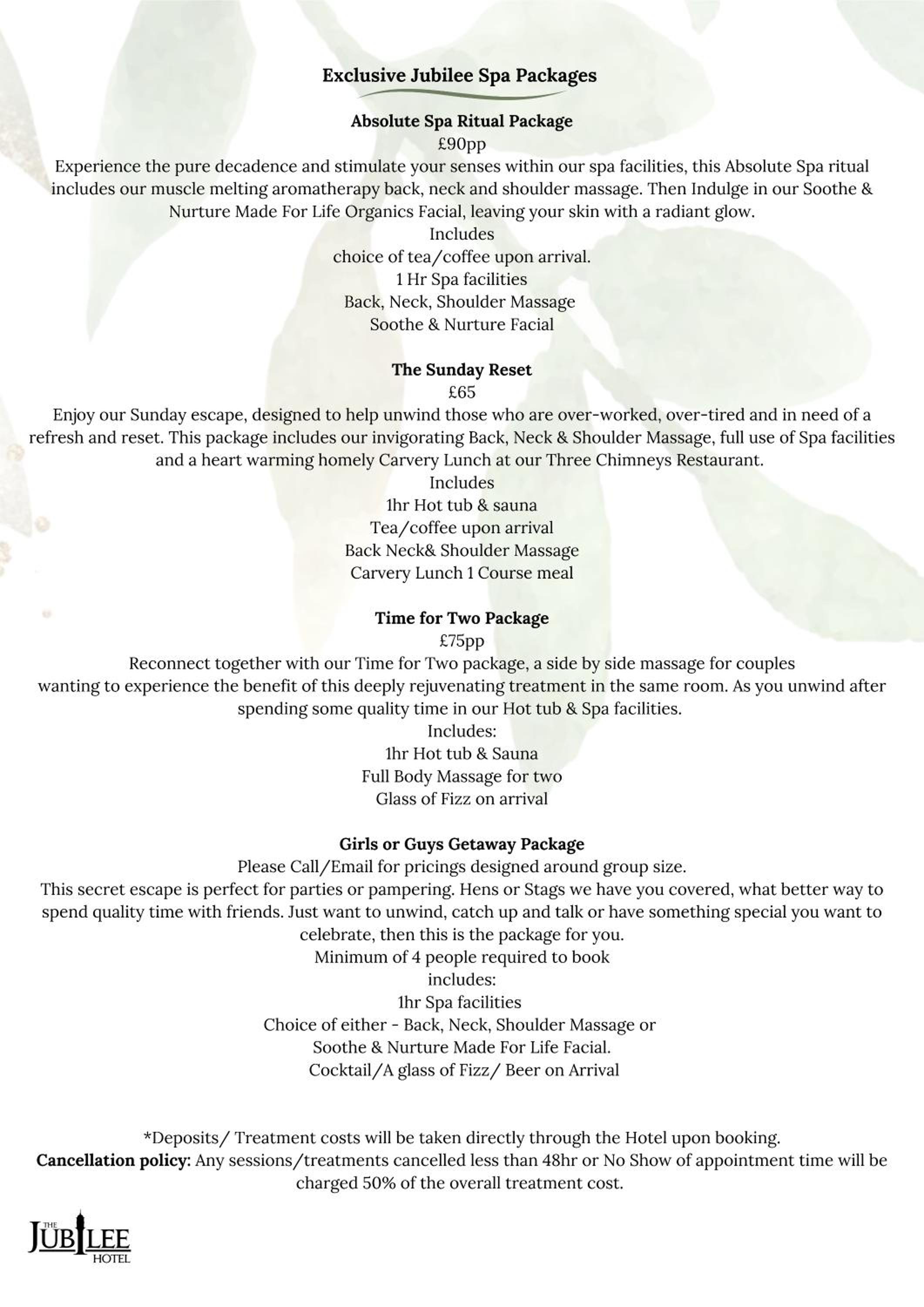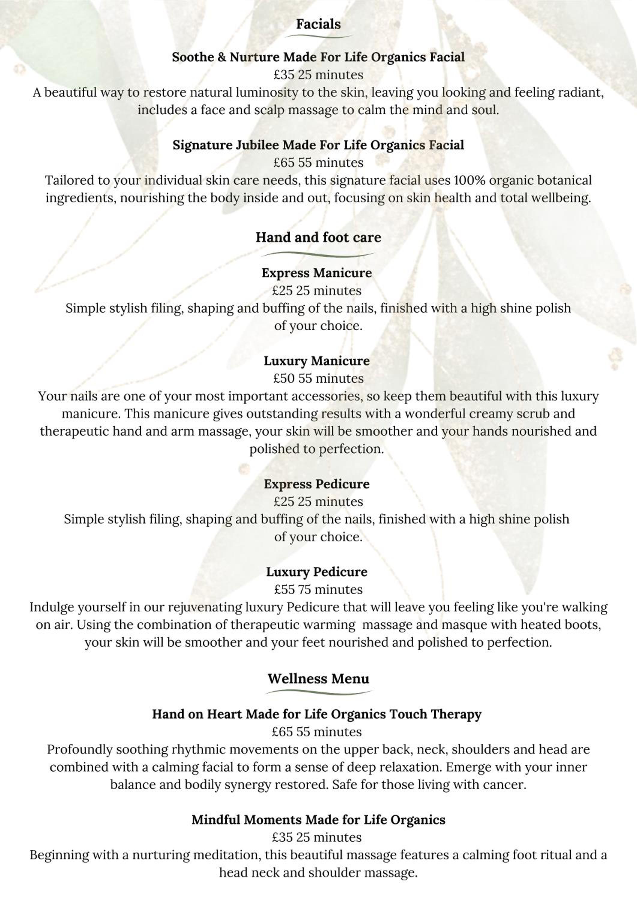 Paid for package inc spa. The hot tub was nice, small relaxation room was comfy. Seemed a little disorganised as I had my treatment, a pedicure in the reception area at a desk that was set up for manicures. Not a comfortable experience. But staff were pleasant.