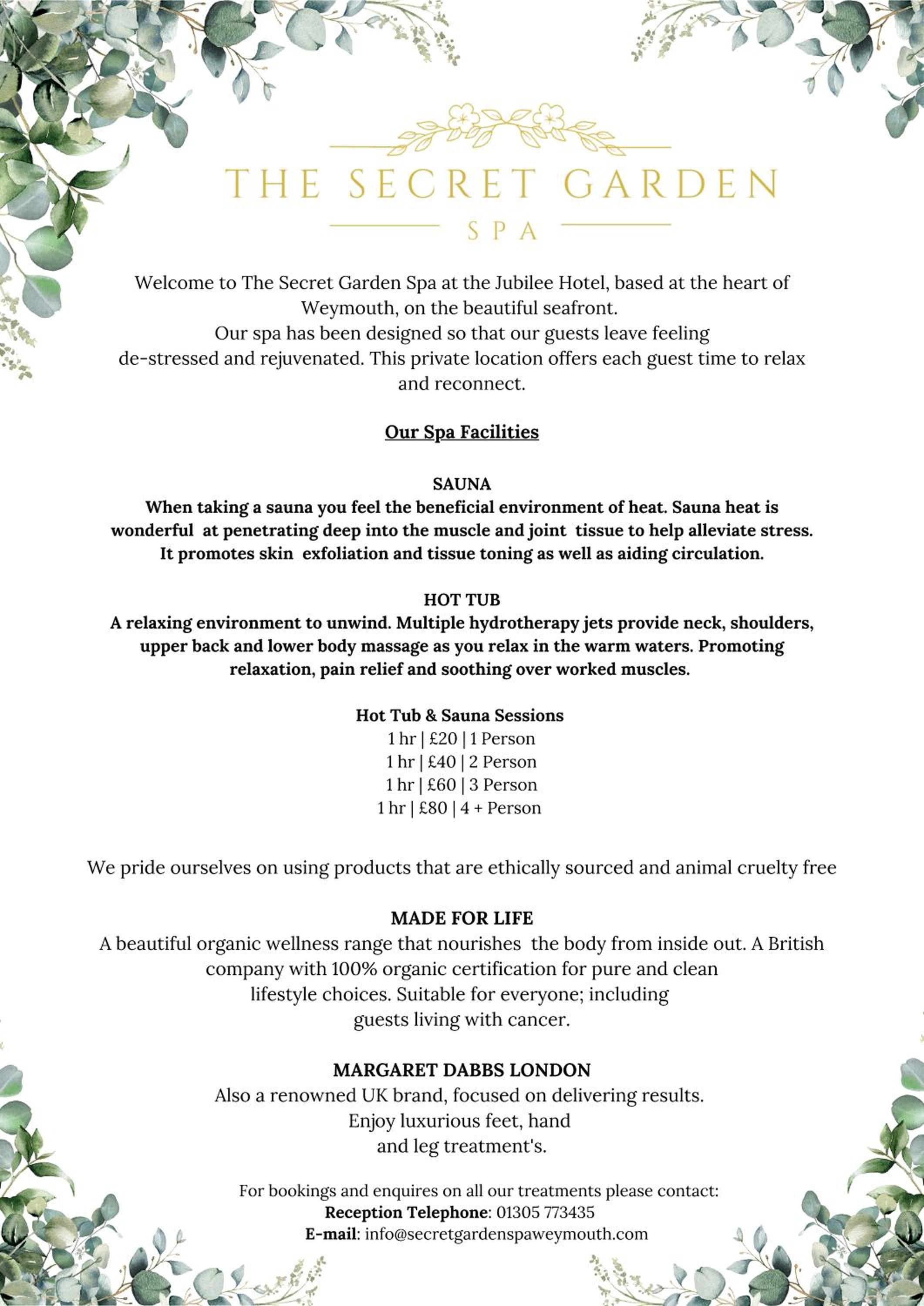 Indulge in relaxation at The Secret Garden Spa with a variety of treatments, including massages, facials, and nail treatments. Unwind in the Secret Garden with a hot tub, sauna, and sun loungers for the ultimate pampering experience.