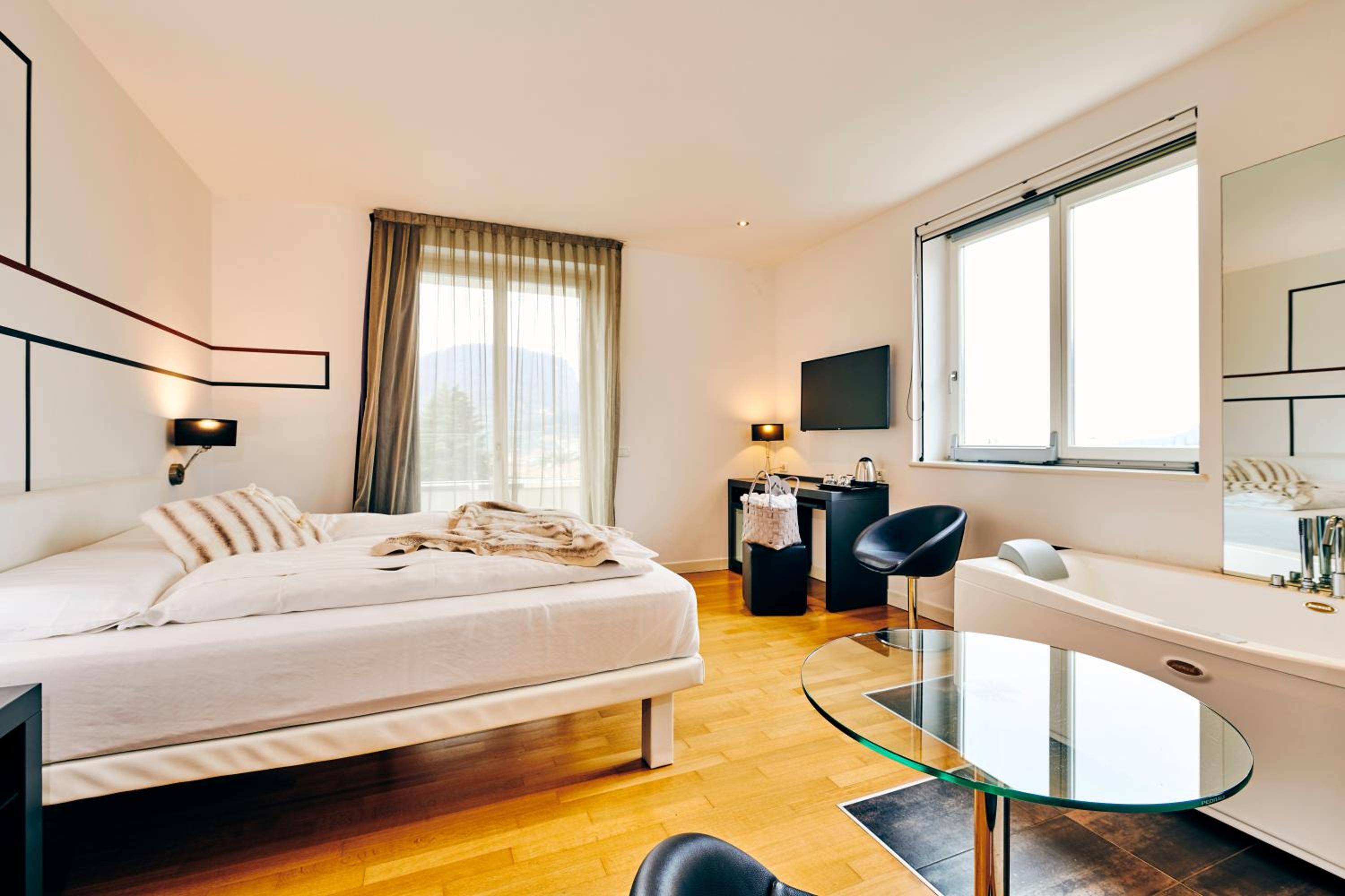 Vista lago bella, la vasca confortevole e la buonissima colazione godute entrambe comodamente in camera. Cibo ottimo anche al ristorante (specialità di pesce)