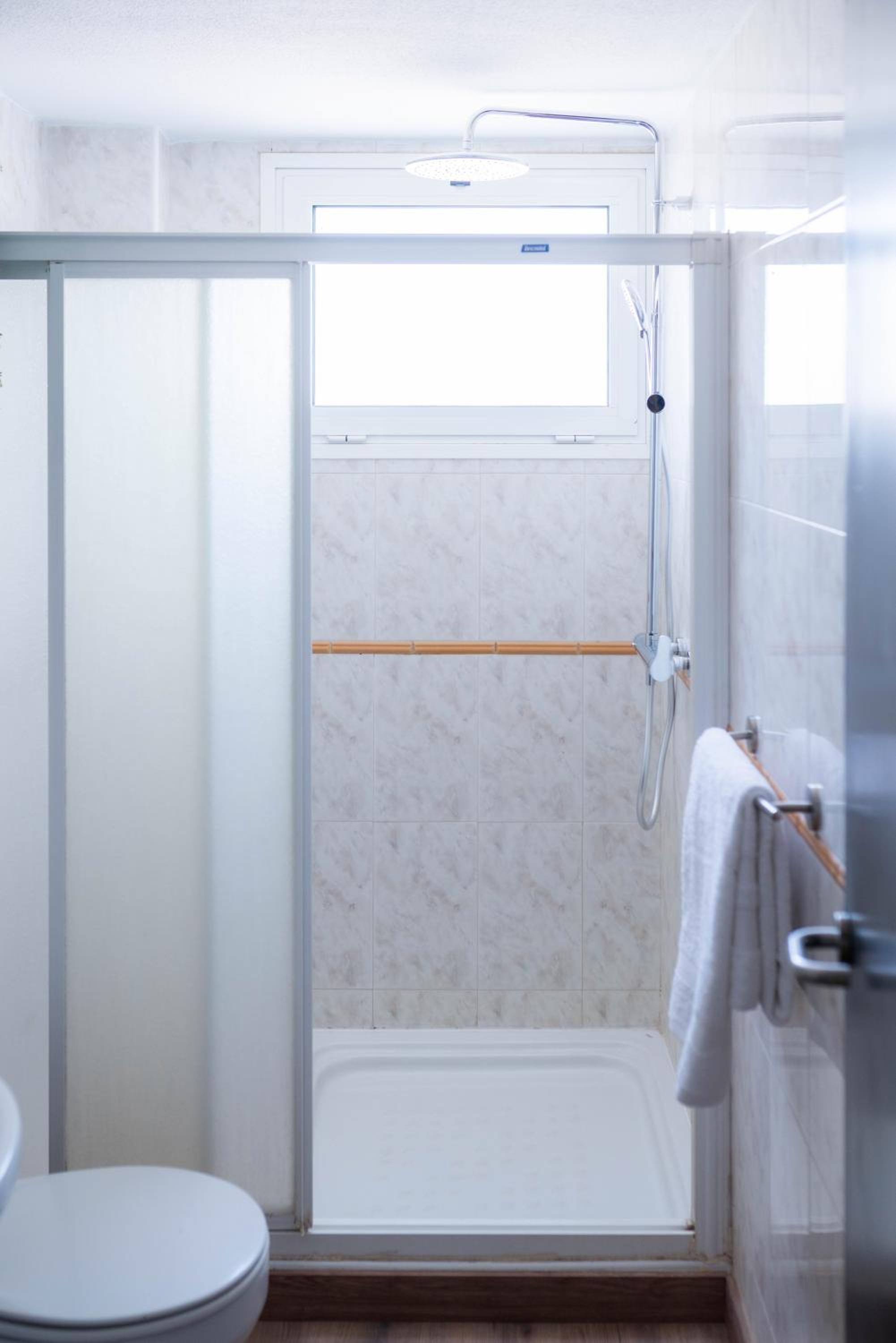 Der Sanitärbereich, Wasser lauwarm, Duscharmatur defekt, duschbrausen, veraltet und nicht mehr voll funktionsfähig. Kein TV im Aufenthaltsbereich.