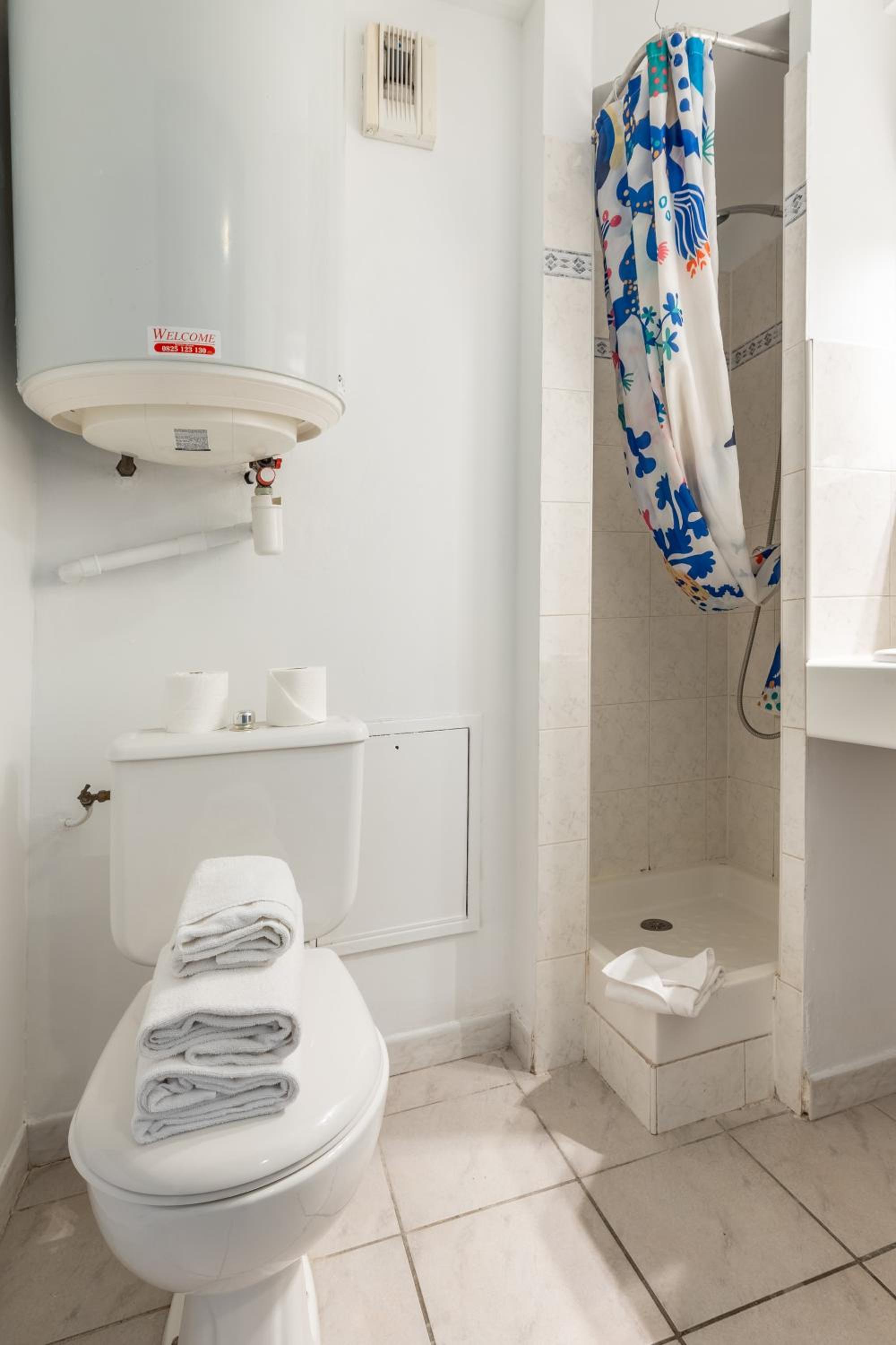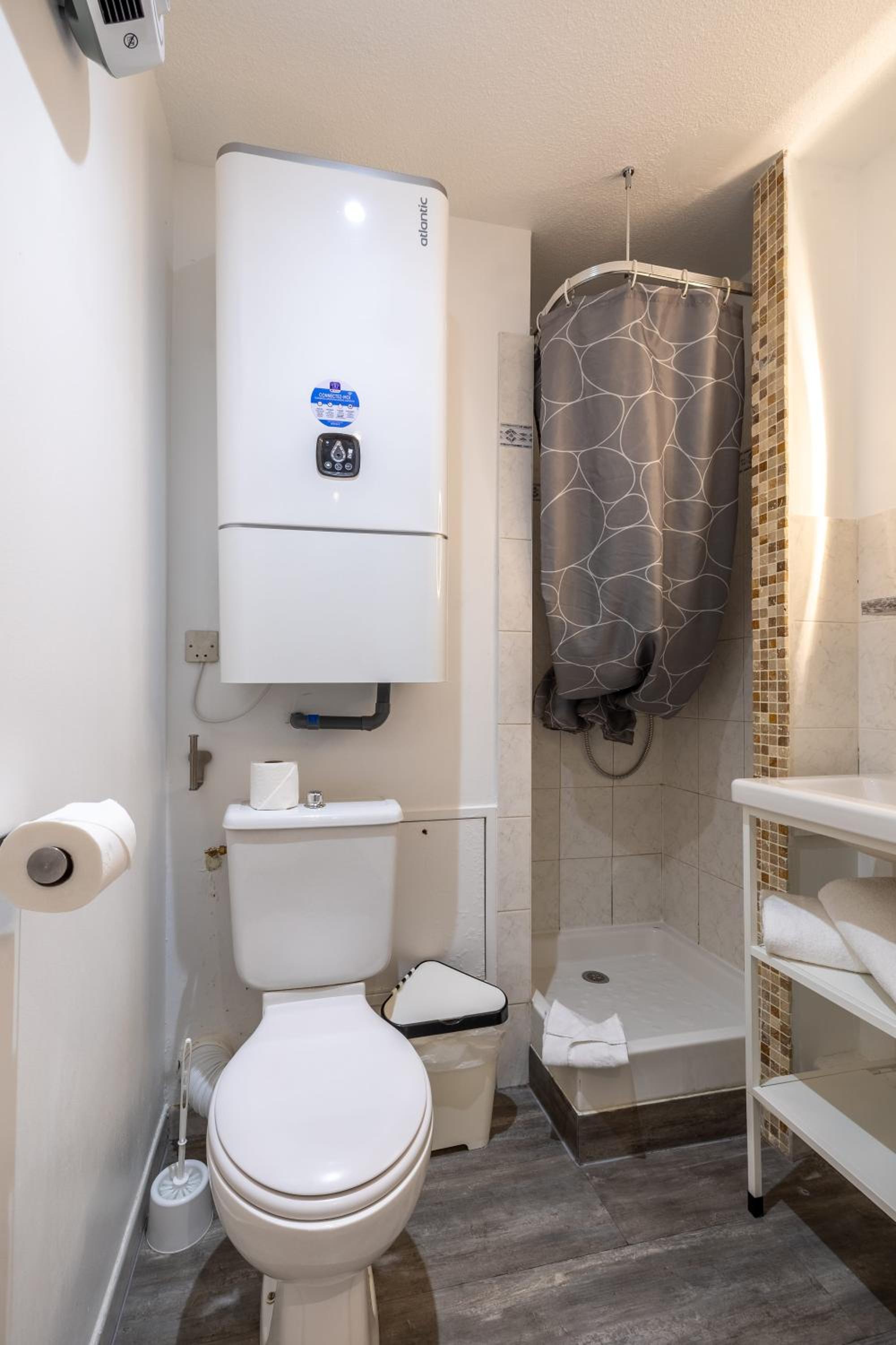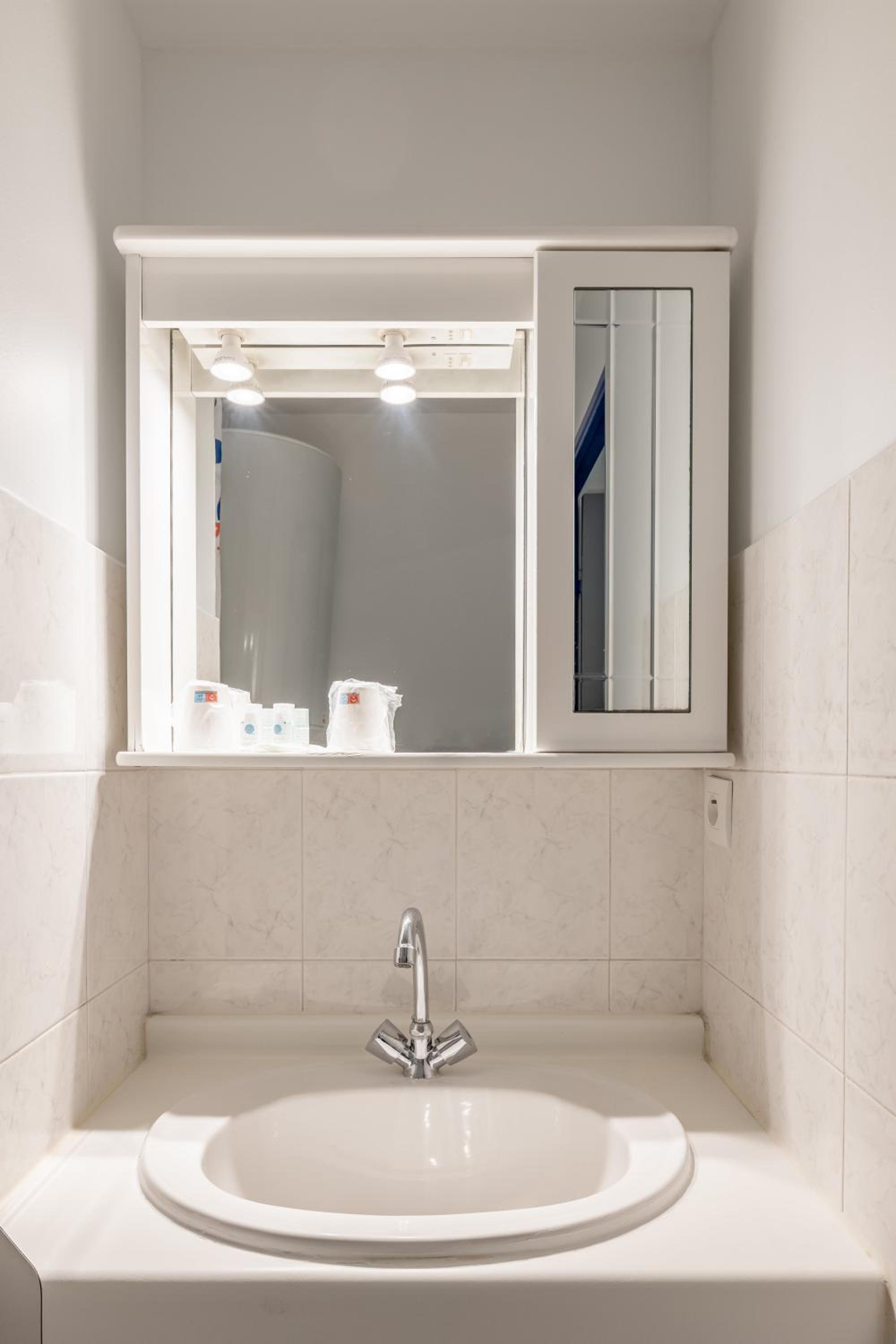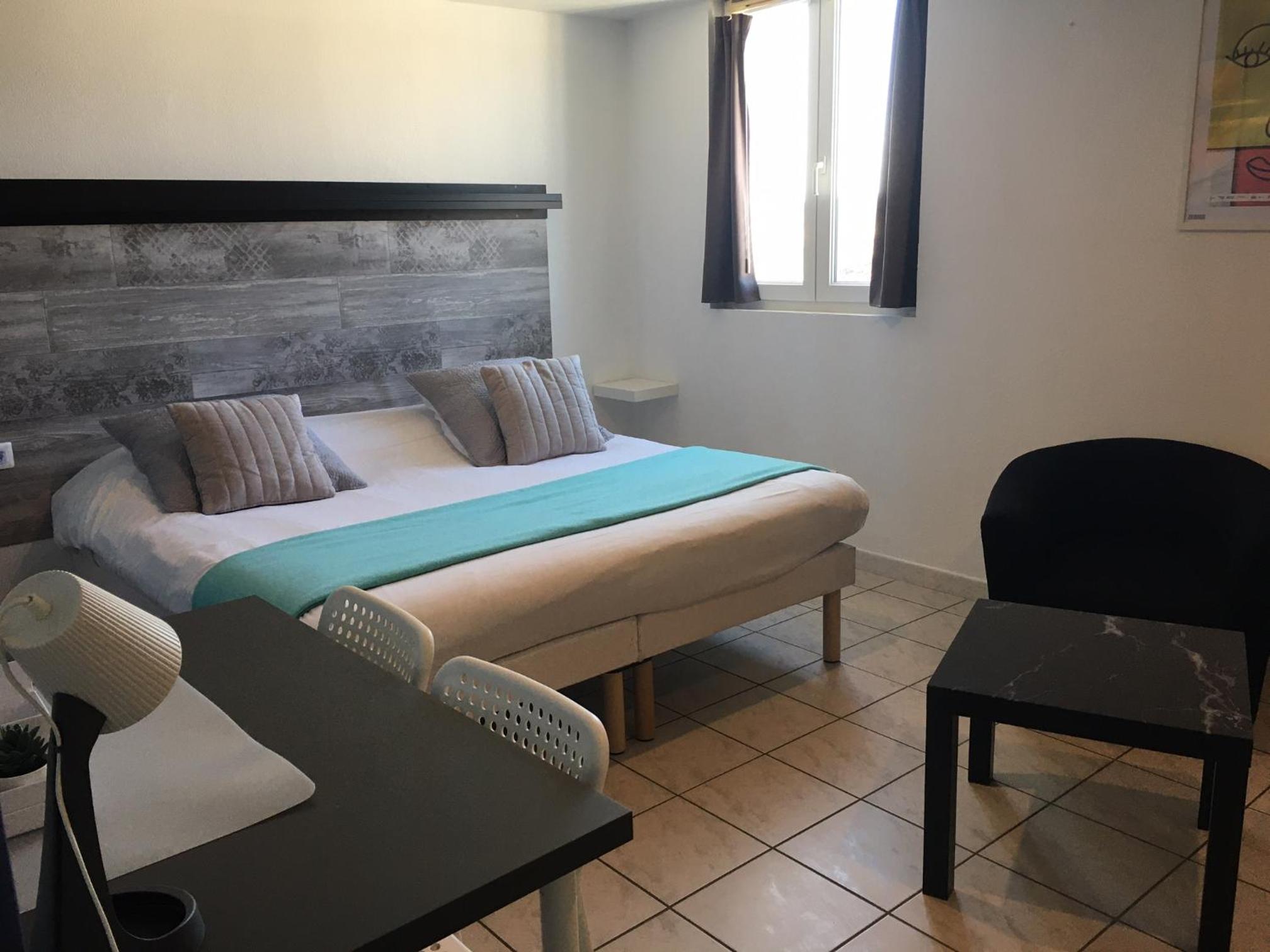 chambre studio avec kitchenette, micro-ondes frigo plaque chauffante hotte, la sdb douche un peu petite avec rideau de douche trop long on se prenez les pieds dedans(peut-être à raccourcir) par contre le radiateur de sdb touche les jambes quand on est sur les toilettes vraiment pas pratique alors l'hiver quand il fonctionne cela doit brûler les mollets à rectifier le déplacer au dessus de la porte? climatisation super! rideaux occultant mériterais un volet roulant. super hôtel très calme situé dans une rue ou le passage est raisonnable mais bien insonorisé. il faut faire de la marche pour trouver un resto 1 kms . parking payant 10 euros la journée à recommander vivement pas de places autour sinon payants