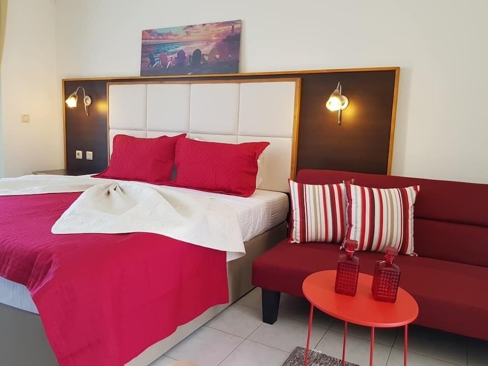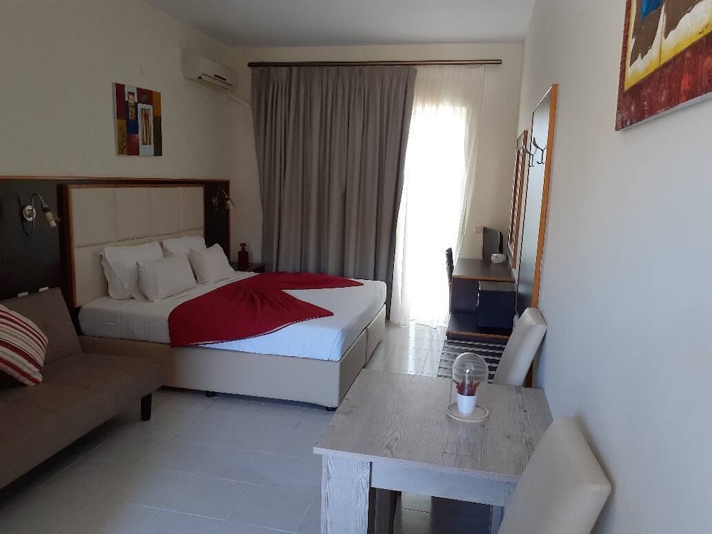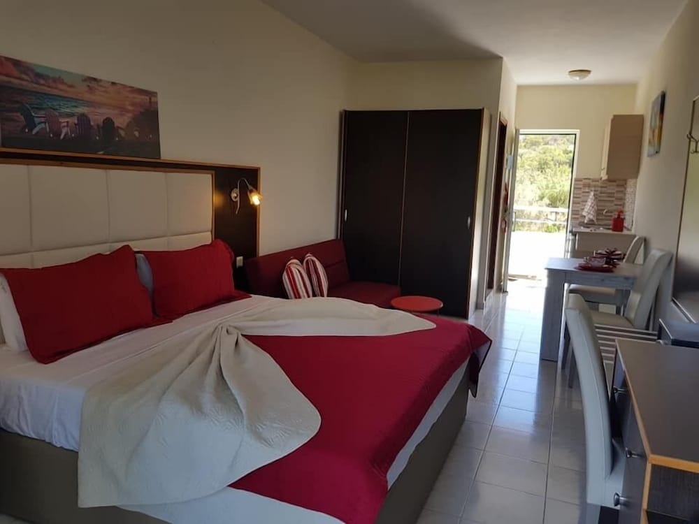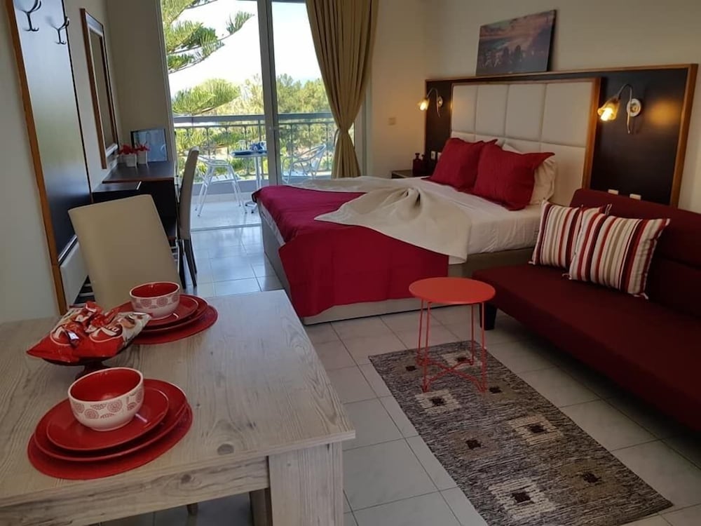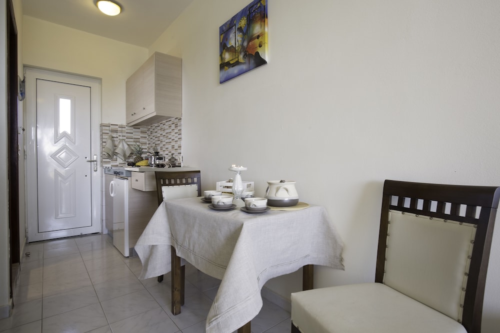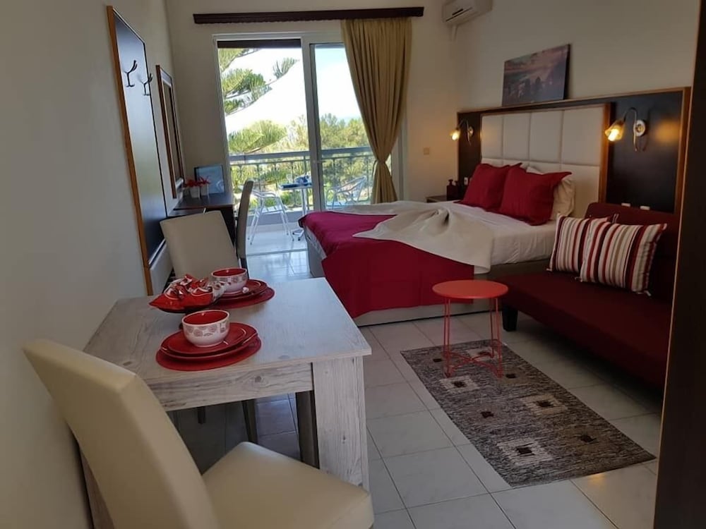 Wir hatten ein Studio mit Balkon u Meerblick gebucht. Vor Anreise hatte ich mehrmals die Unterkunft kontaktiert um genauere Wegbeschreibung zu erbitten, doch keine Antwort erhalten. Wir haben uns aus GoogleMaps selbst den Weg zusammengesucht. Wir sind zum Check-In Zeitpunkt angekommen, doch mussten ca. 1 Std warten, bis unser Studio fertig war. In dieser Zeit hat uns George mit Reisetips versorgt. Auch erfuhren wir, d Nutzung d Klimaanlage 7 EUR / Tag extra kostet, u. schließl wurde uns ein Studio im EG mit Terrasse - OHNE Balkon und Meerblick zugewiesen. Auf unsere Anmerkung, dass dies nicht gem. der Buchungsbestätigung ist, wurde uns gesagt, dass sonst kein Studio frei ist u sie Besucher immer erst in ein freies Studio im EG einziehen lassen u ein Umzug nach einigen Nächten in ein anderes Studio möglich ist. Wir waren darüber sehr enttäuscht, denn wir hatten uns bei unseren Recherchen genau auf einen Meerblick ausgerichtet u in unsere Preisvergleiche die Nutzung einer Klima einbezogen. Hätten wir dies gewusst, hätten wir letztendlich auch eine andere, günstigere Unterkunft buchen können. Schließl entschieden wir, NICHT umzuziehen, um die Tage ohne zwischenzeitliches zusätzliches Packen u "auf-den-Umzug-Warten" frei verbringen zu können. Diese Umstände geben leider einen dicken Punktabzug. Sonst war d Studio für Nutzung von 2 Pers gut. Der Weg zum Strand ist aber länger als beschrieben-zw. 15 (kleiner Strand) und 30 Min (Hauptstrand).