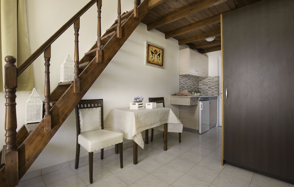 Our studio was well equipped and extremely clean. Our balcony had a great view out to sea and the whole place was so relaxing and easy. It is very easy to reach both the main beach (5 min walk) as well as a the smaller Kavos beach (which we preferred) and there is a supermarket and taverna a few minutes walk away. It's about 10 minutes to the main strip of Pefkos which was perfect as you're far enough away to be out of the hustle and bustle.