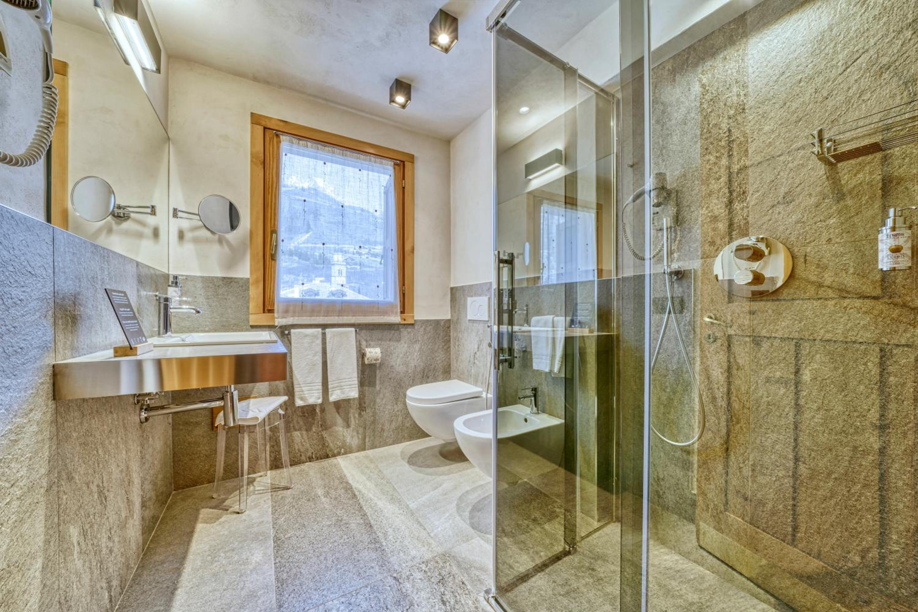 Posizione comodissima sulle piste per principianti e nel cuore del paese, grande vetrata in camera sul complesso del Gran Paradiso, più di una sauna, ottima colazione.