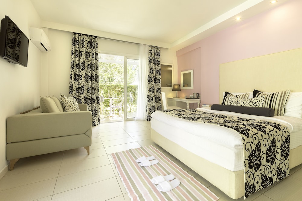 This hotel is set in beautifully kept garden with 5 seperate buildings with 6 rooms in each with a central pool, reception, bar, restaurant area. All very clean and well looked after. The staff are all very friendly and really made you feek at home. Breakfast ran to 11 and it was all very relaxed...No one rushed for sun beds, no one put towels down early there were always many free all day.