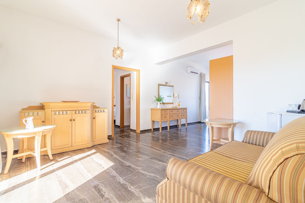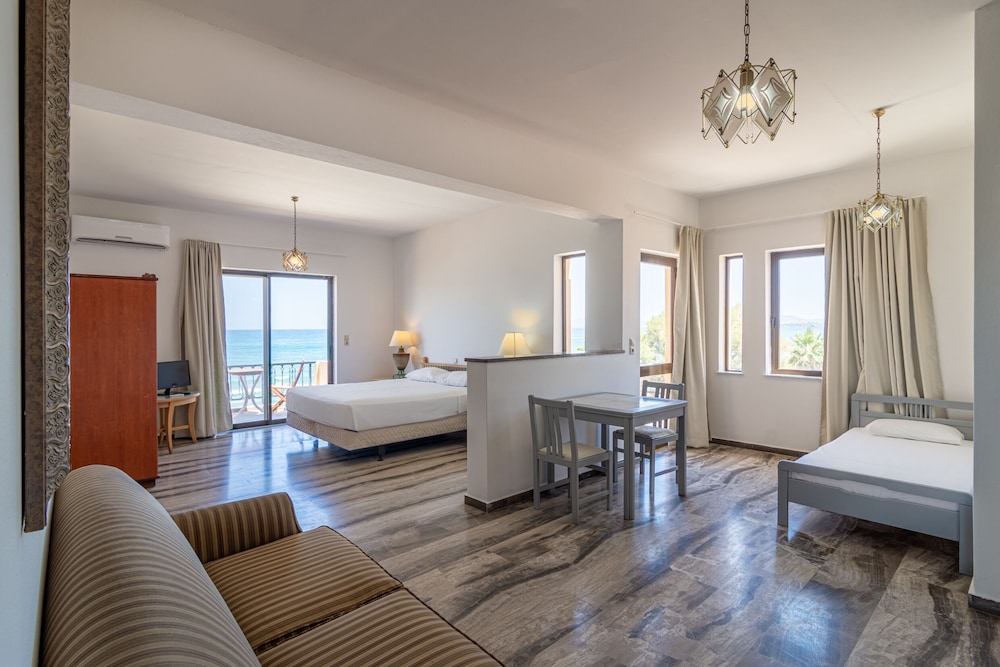My wife and I stayed there for one week in a large suite facing the sea and absolutely loved it! The hotel location is excellent, right on the beach (we left the balcony door half-open in the evening to both fall in sleep and wake up with the relaxing sound of the waves -- wonderful). The suite was large, air-conditioned, and was kept very clean. The WiFi was OK for the most part, but could be shaky during peak hours. There is no swimming pool, but that didn't bother us at all being right on the beach front where hotel guests had access to free benches. We did not eat at the hotel restaurant, but instead visited different restaurants in Agia Marina or Chania town (short convenient bus-ride away). A wonderful stay!