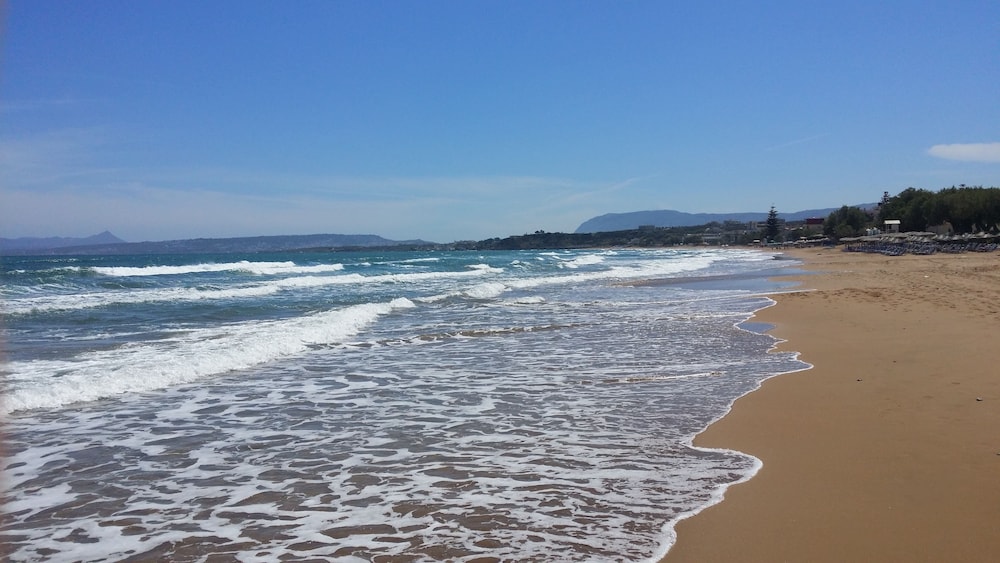 Perfect location for a relaxing beach holiday. Close to good local bus route to Chania if you want to explore the area further. Own private beach, free sunbeds, fabulous location. Great local restaurants. Our room was really clean and clearly recently decorated, good air conditioning, three balcony areas to dry clothes and to sit out, very comfortable beds, only giving four stars because the shower really needed attention, dripping showerhead and shower curtain did not contain overspills, tiles pretty murky, out of character with the rest of the apartment. The apartment could also do with a bit more delph and cutlery, only two cups, two glasses and two teaspoons to go with a fridge, kettle and coffee maker. The staff were very helpful and friendly. Overall, we were very happy with our stay and would not hesitate to return. Wifi was not great in the apartment but was quite good in the bar/restaurant area.