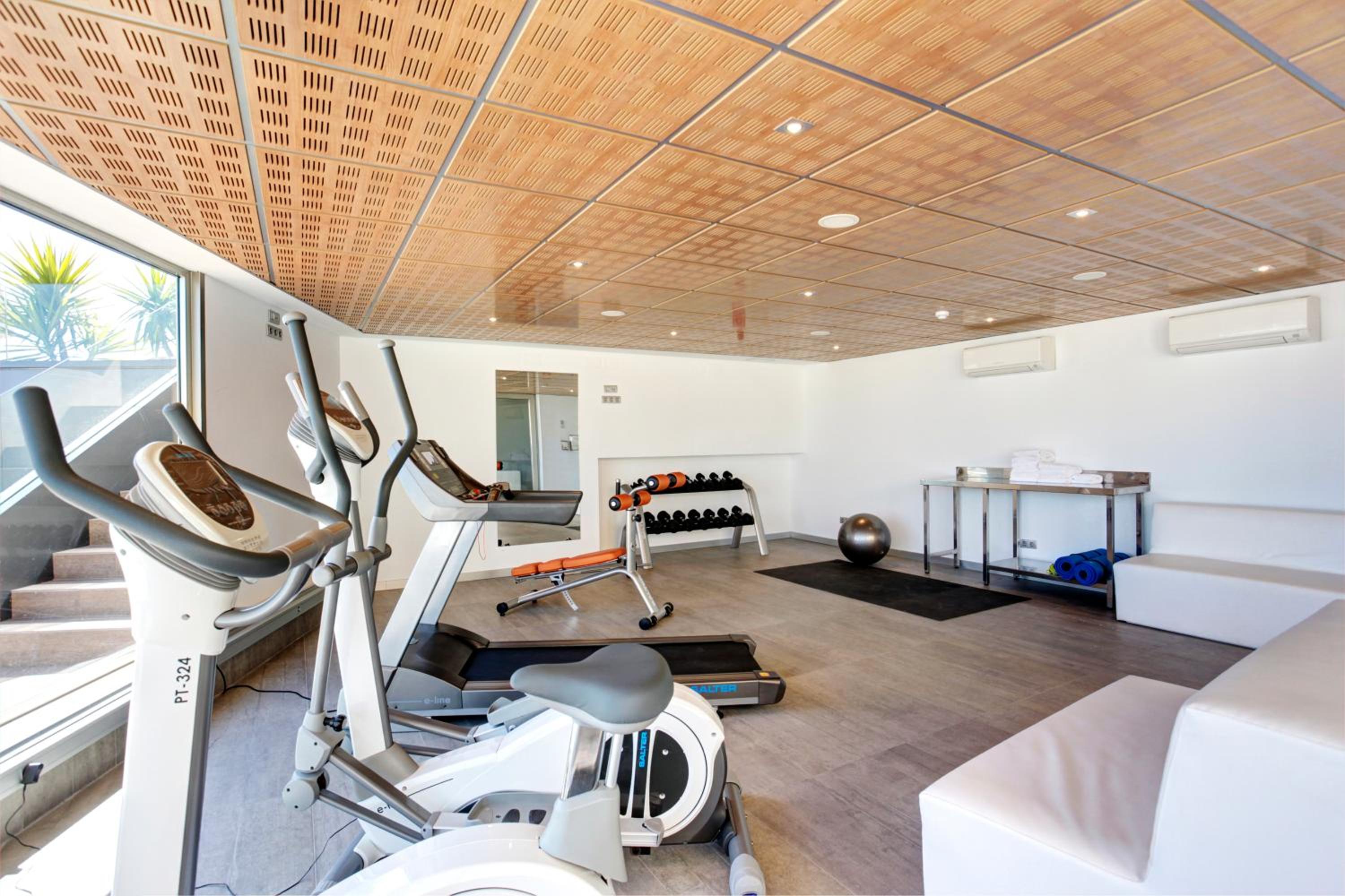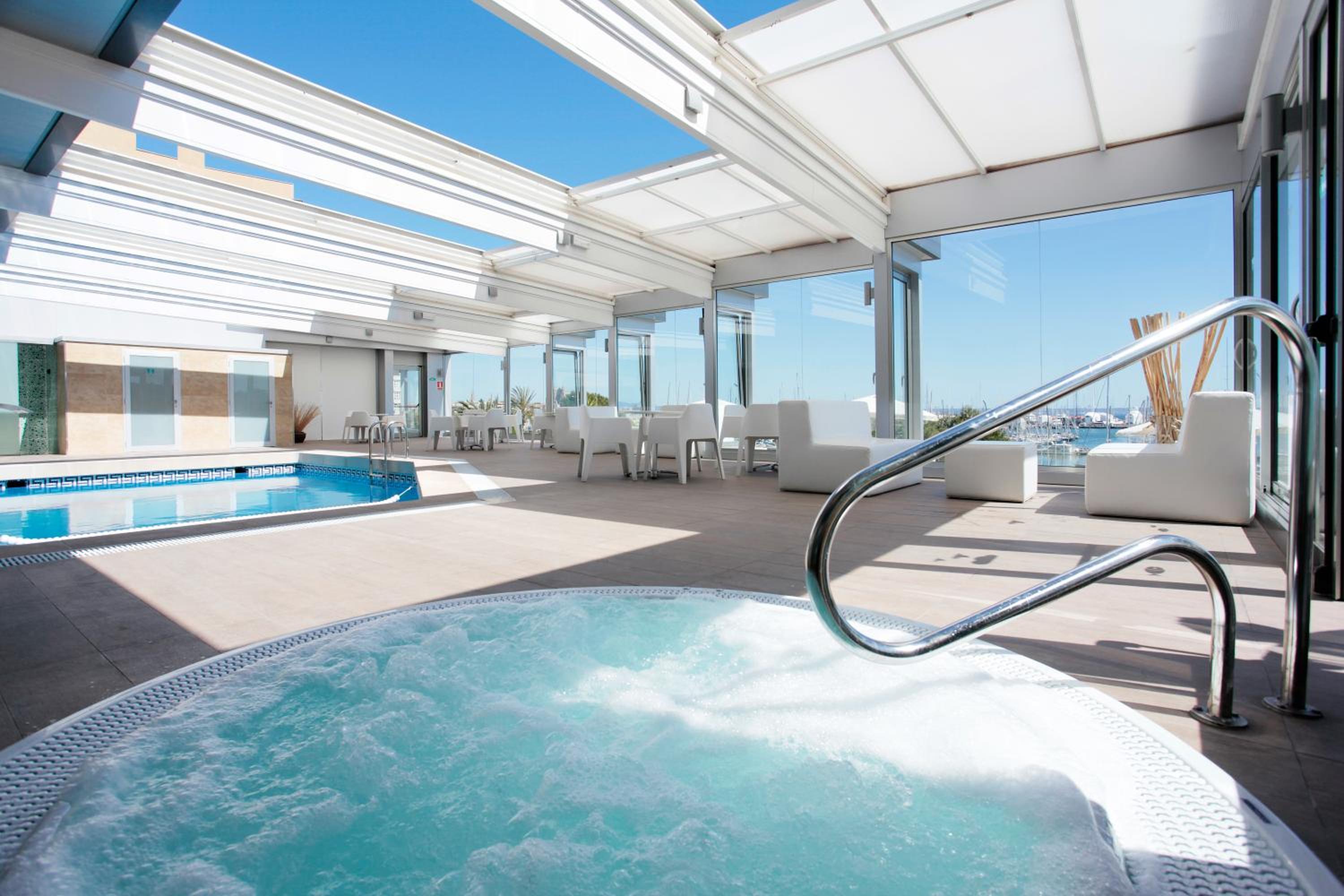 Indulge in the fully equipped gym overlooking Palma Bay, a covered swimming pool for year-round enjoyment, and a relaxing sauna. The hotel's modern café, terrace, and restaurant all offer stunning sea views.