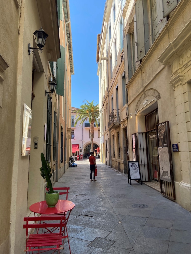 Right in the middle of everything in Nimes. So many excellent choices were within a 5 to 10 min walk. No elevator but the staff took our luggage up and down for us. Did not have breakfast (which looked great) because we went to a different cafe every day to take in the world. I would stay here again.
