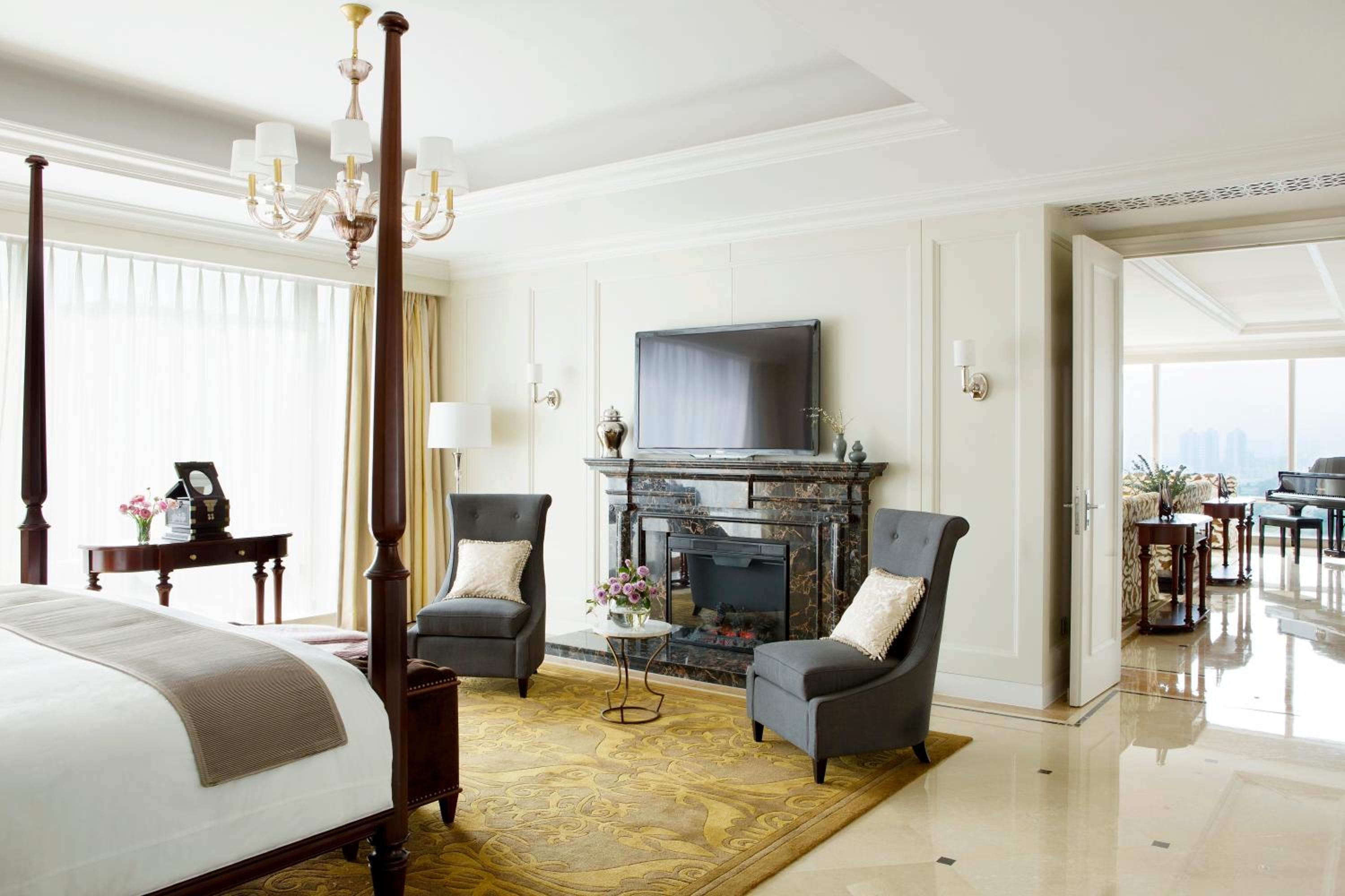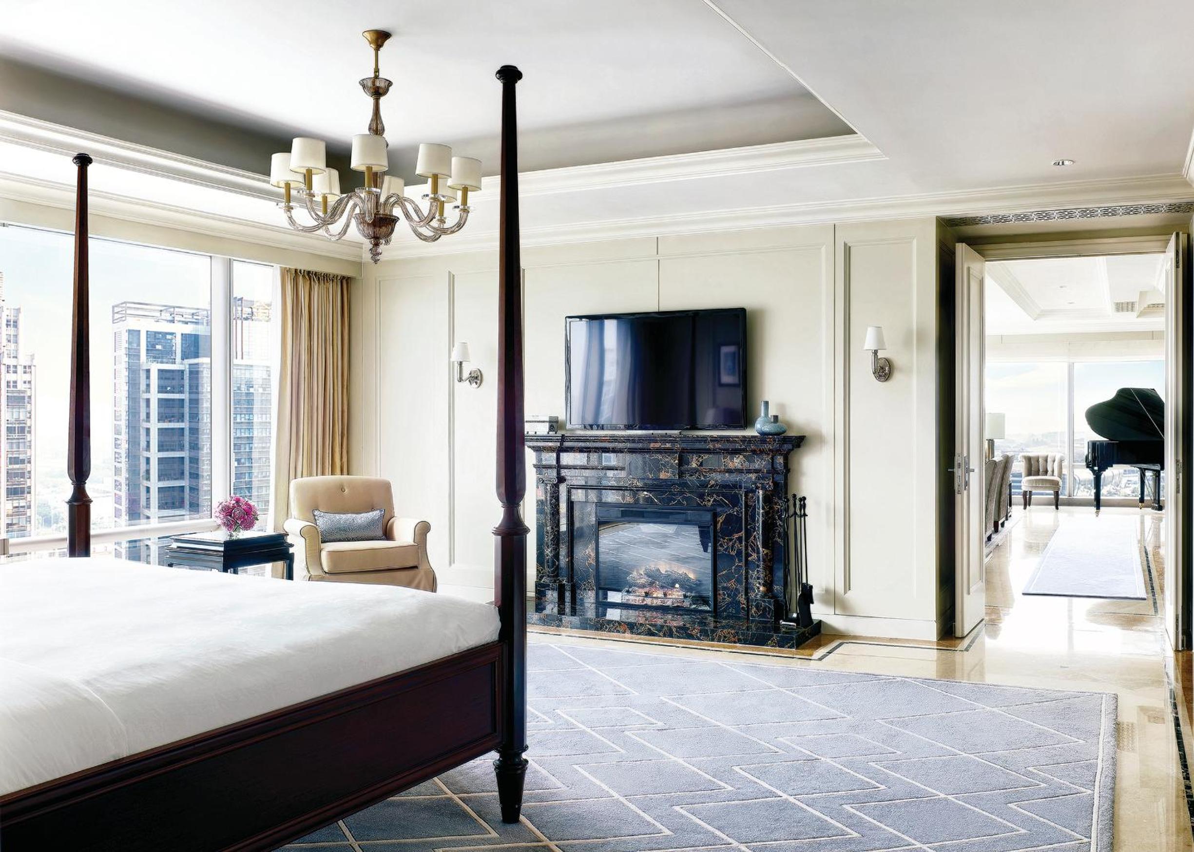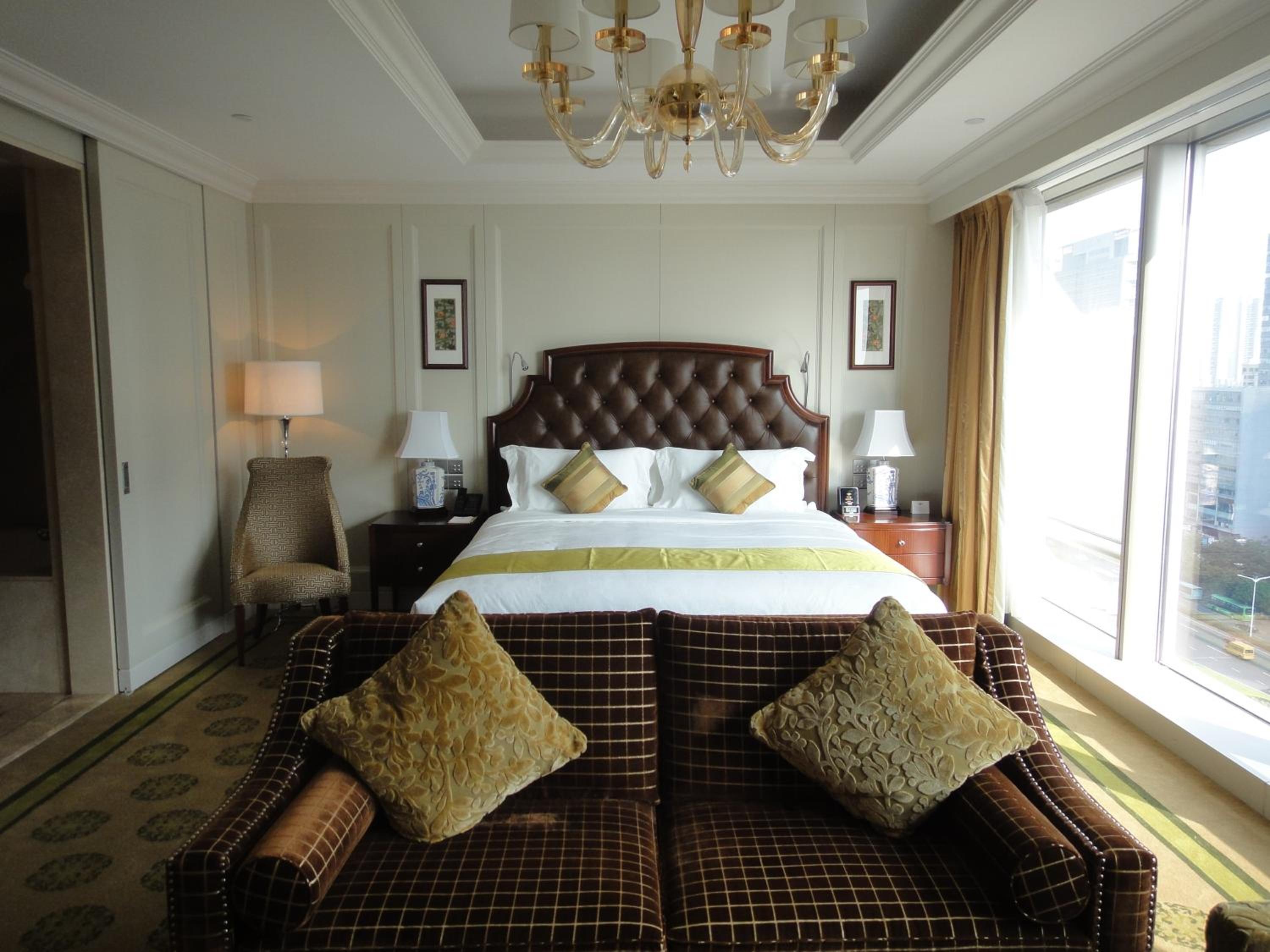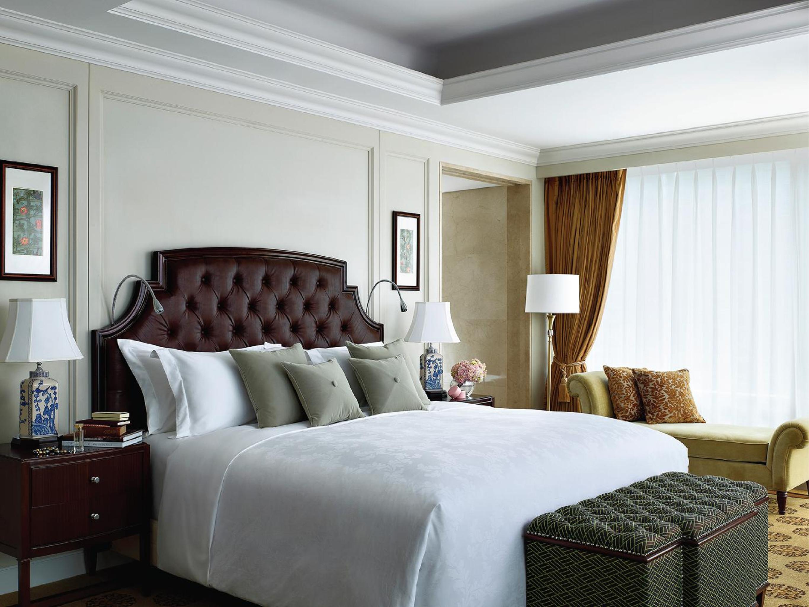 The Langham, Shenzhen offers a blend of tradition and luxury in the heart of Futian. The guestrooms, decorated in ivory tones with oriental artworks, provide a serene retreat with modern amenities like a 46-inch LCD TV, signature Blissful Bed, and en suite rain showers and bathtubs.