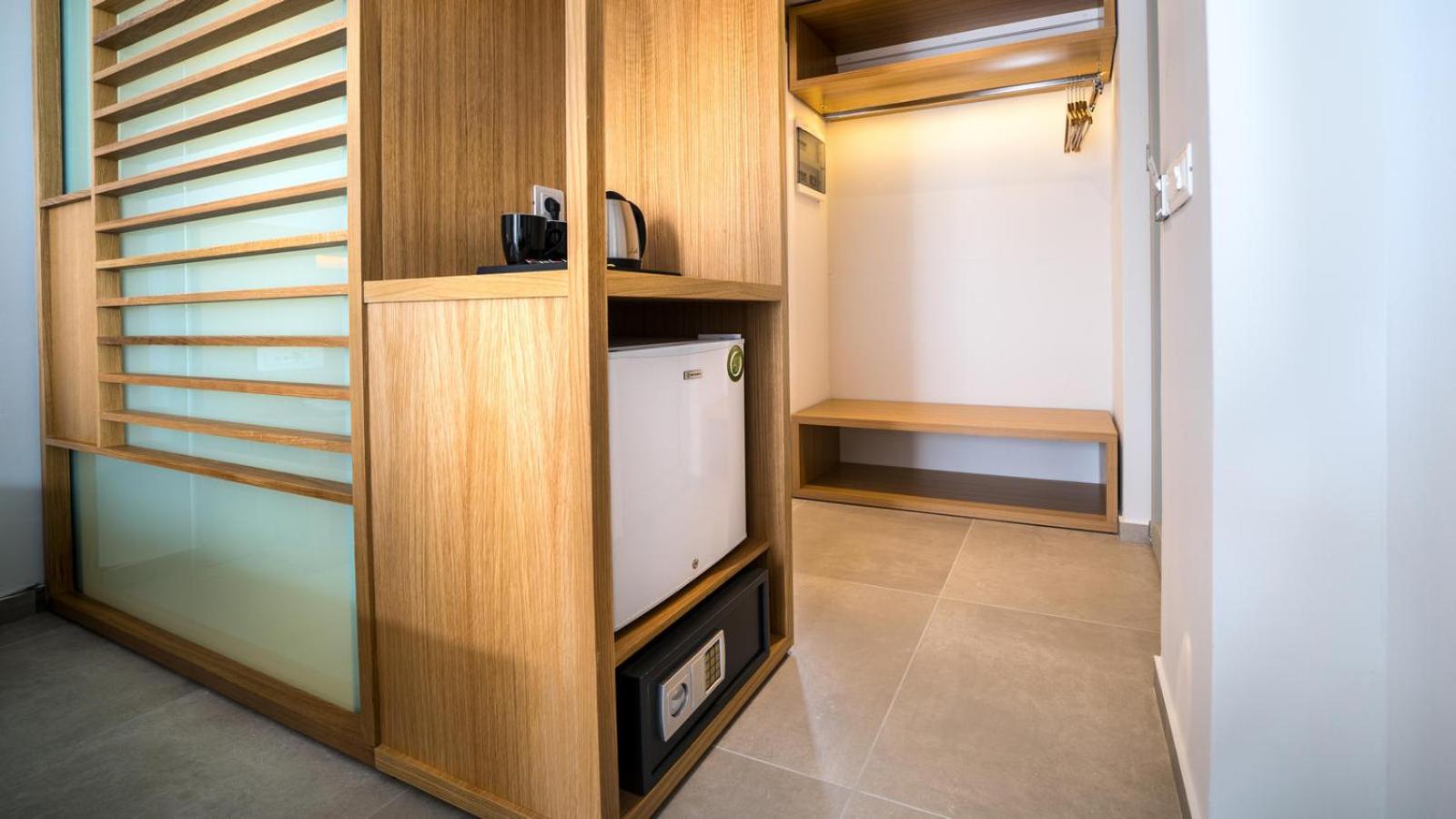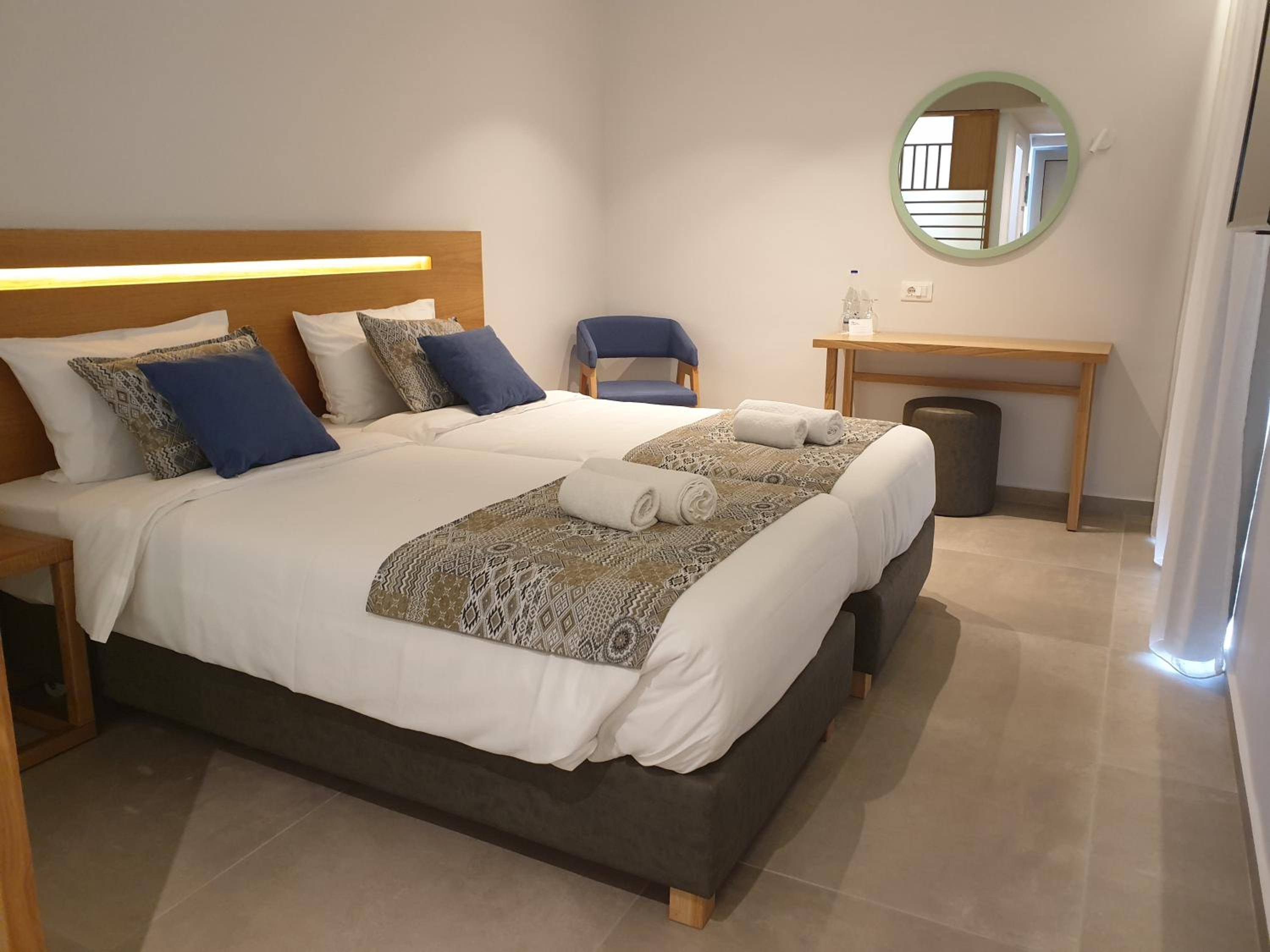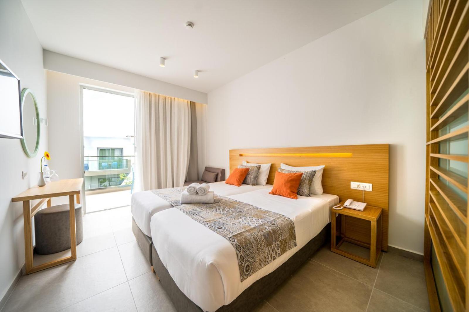 Relax in our bright, air-conditioned rooms adorned in calming shades of blue. Unwind on your private balcony or patio with views of the Cretan Sea. Some rooms even come with a mini fridge for added convenience.