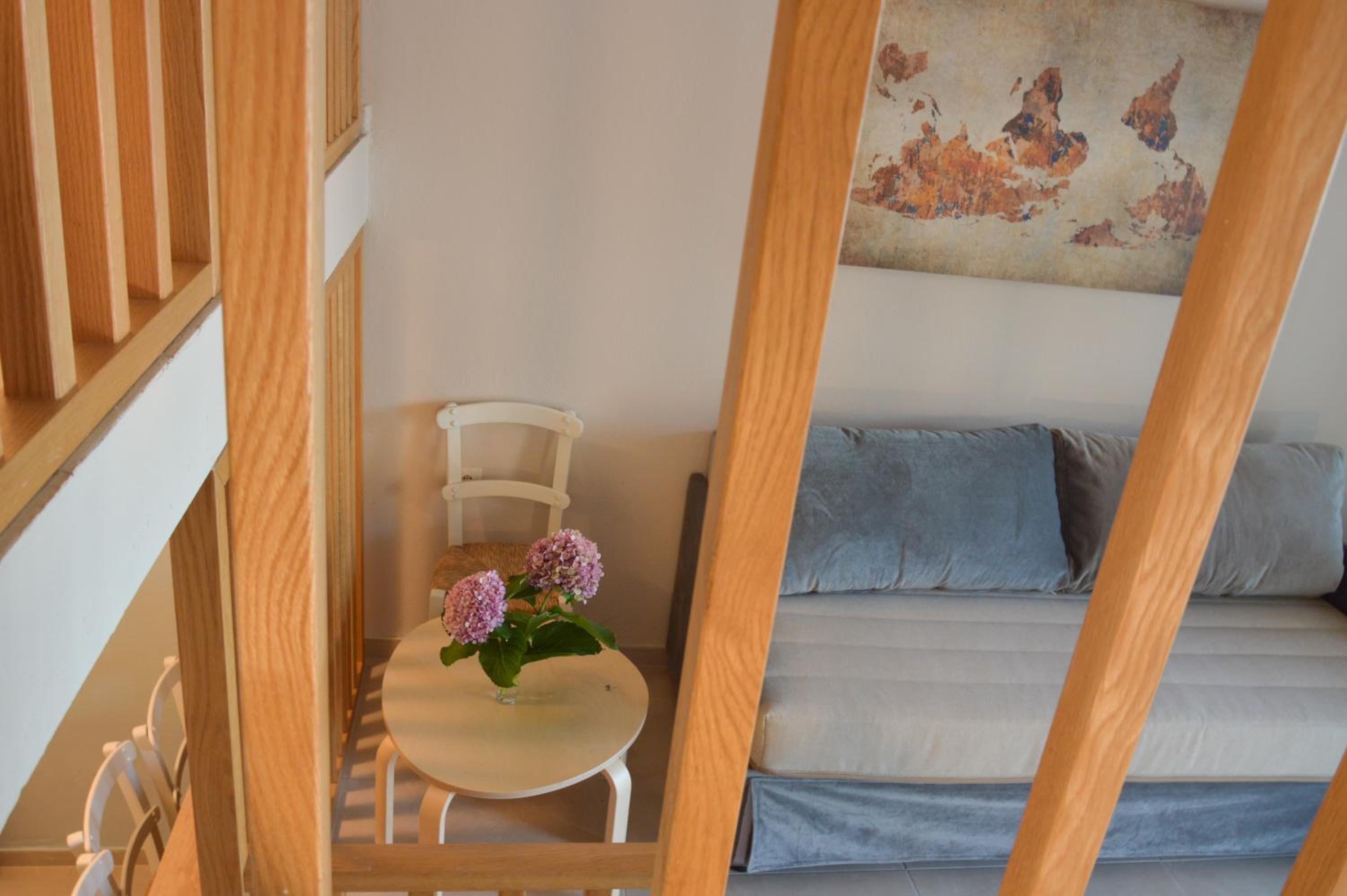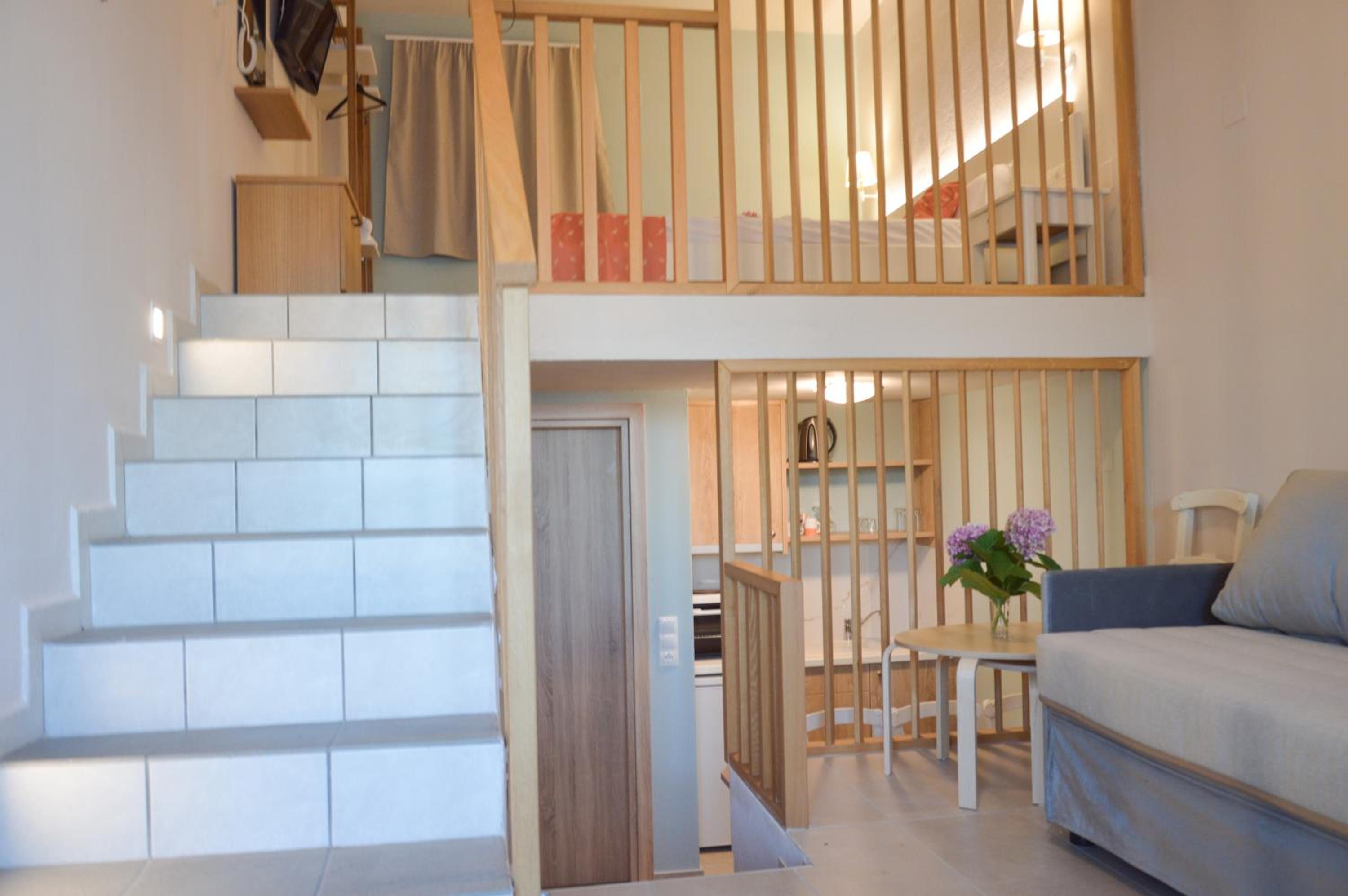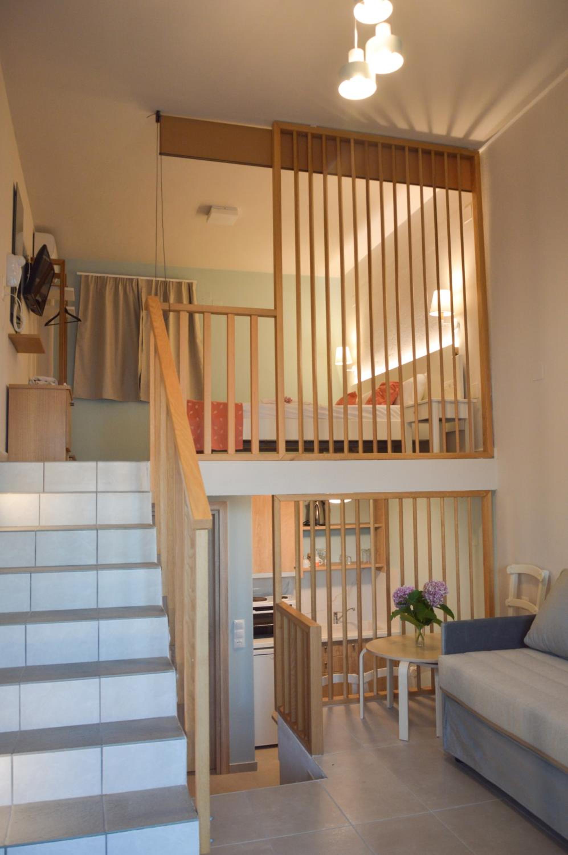 Номер двухуровневый. Наверху спальня. Внизу ванная и кухня со всем необходимым. Также большой диван.