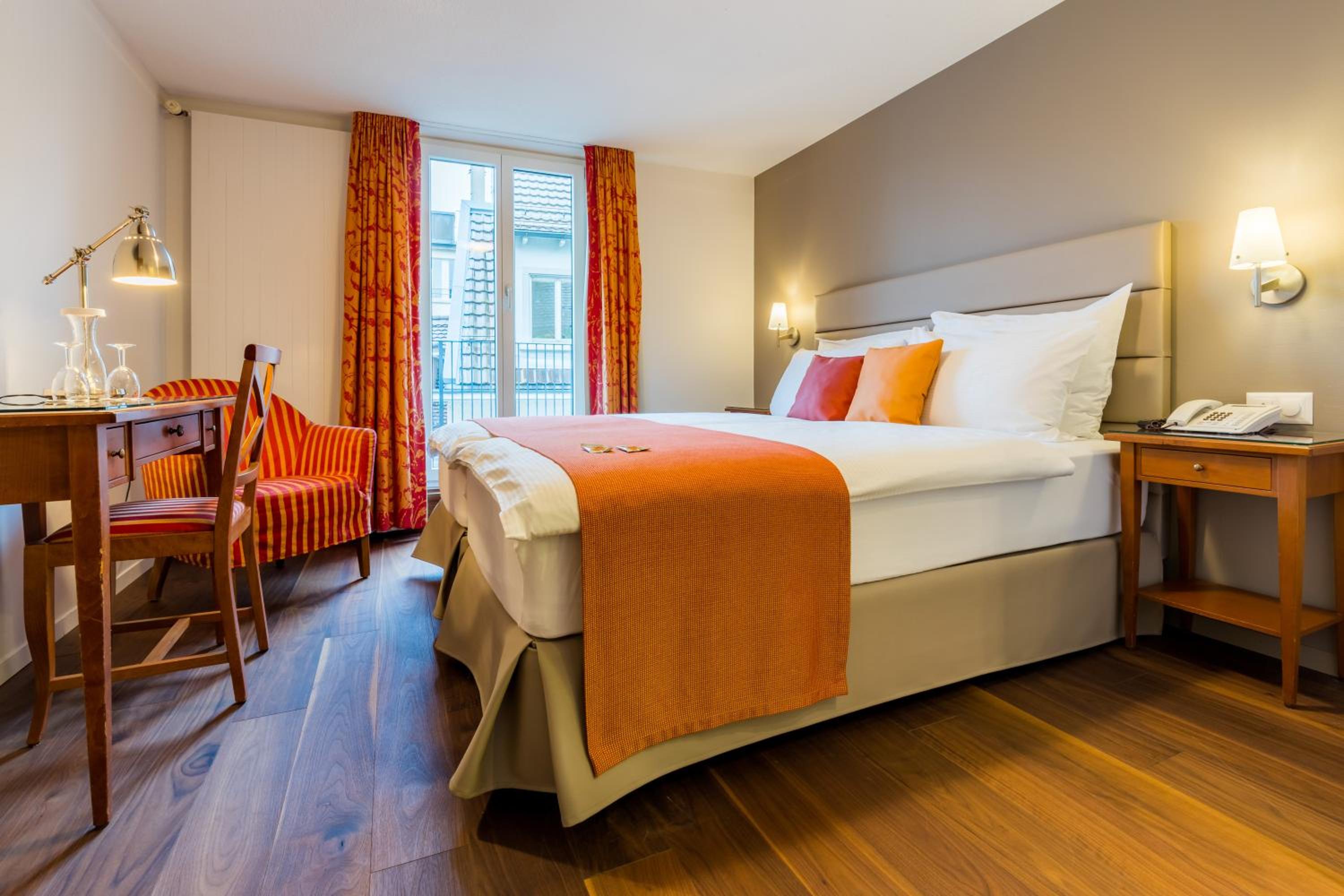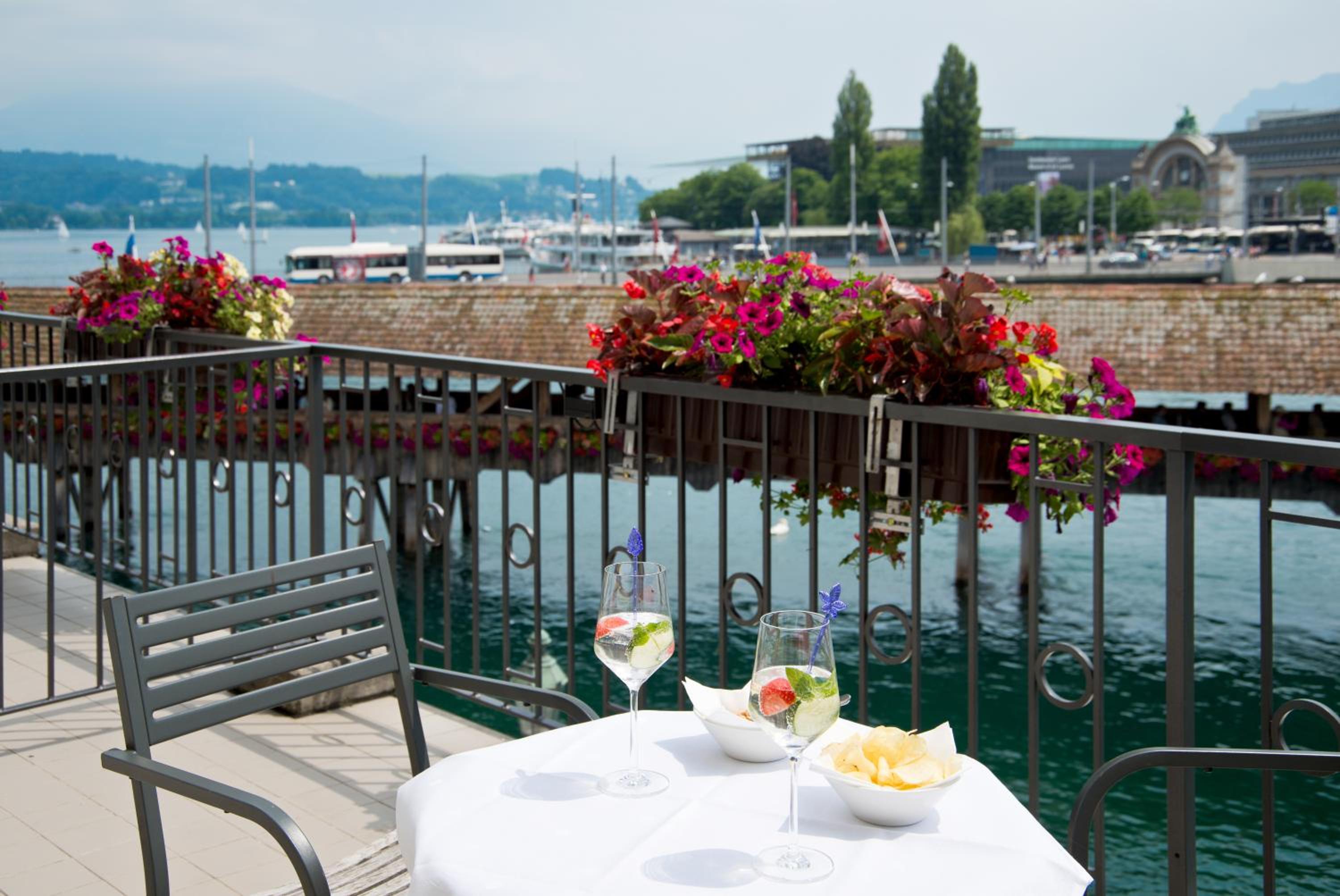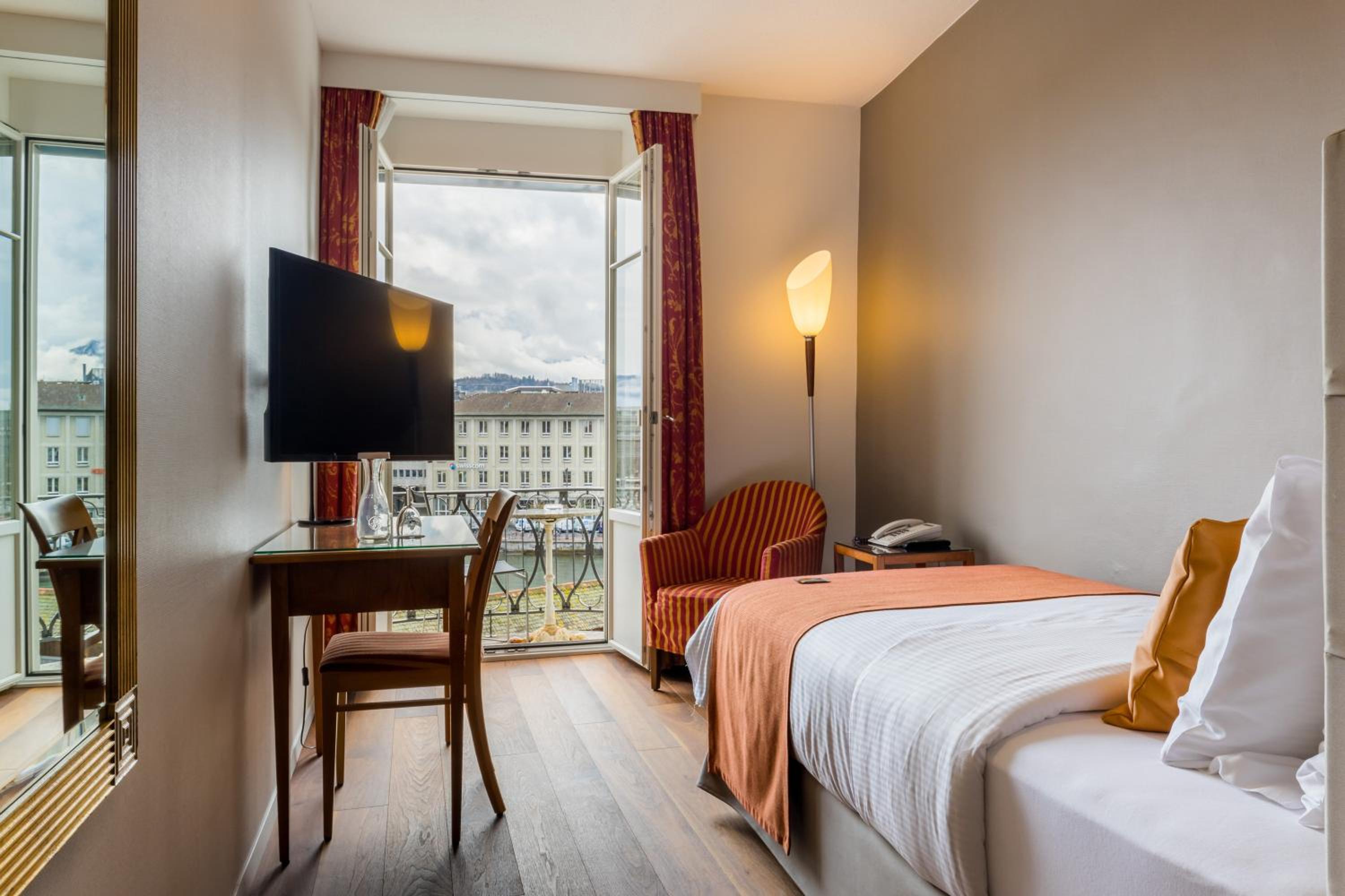 Wake up to stunning views of the lake, Chapel Bridge, and Mount Pilatus from your room at Hotel DES ALPES. Some rooms even offer a glimpse of the historic pedestrian zone. Each well-equipped room ensures a comfortable stay, with some featuring balconies for an extra touch of relaxation.