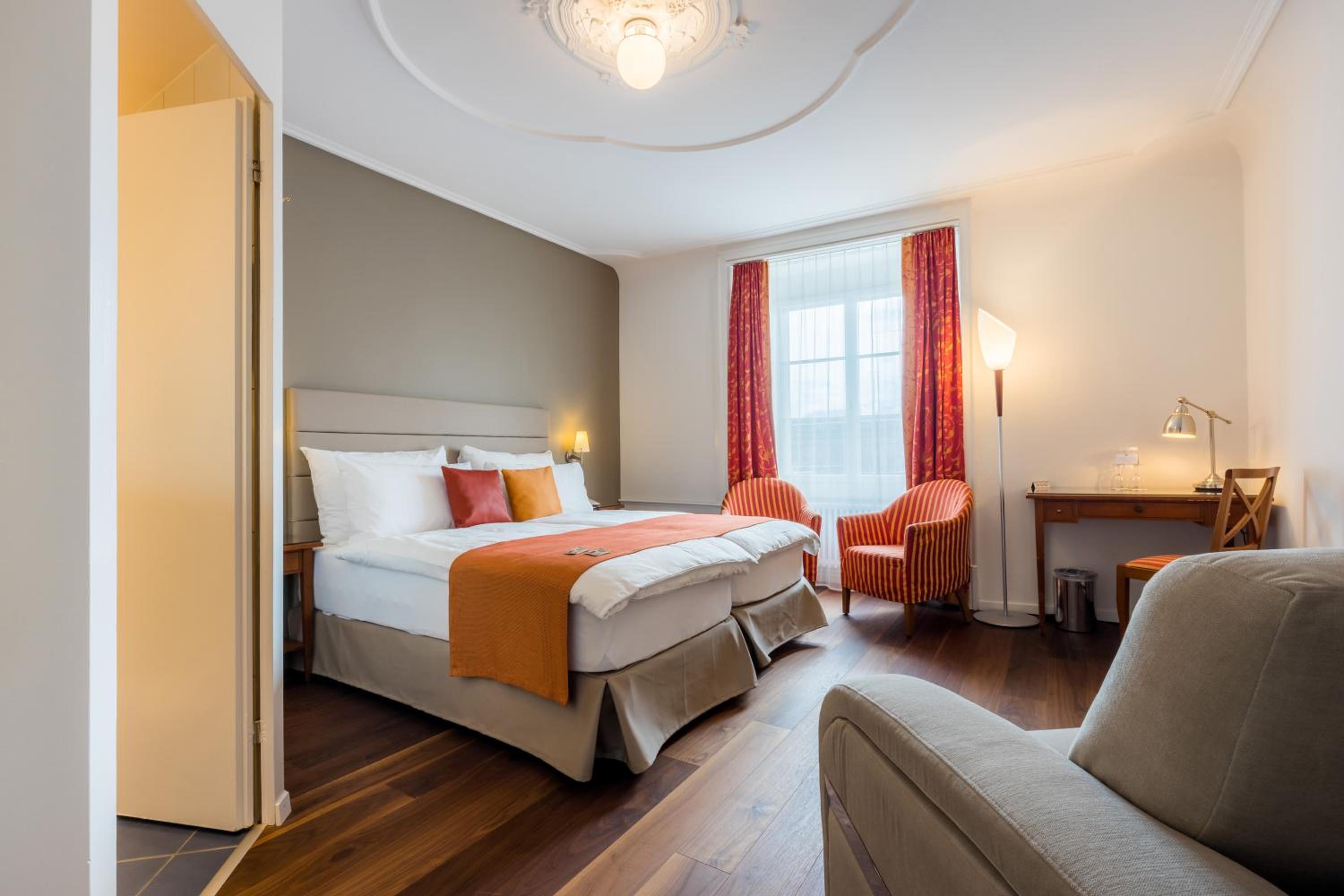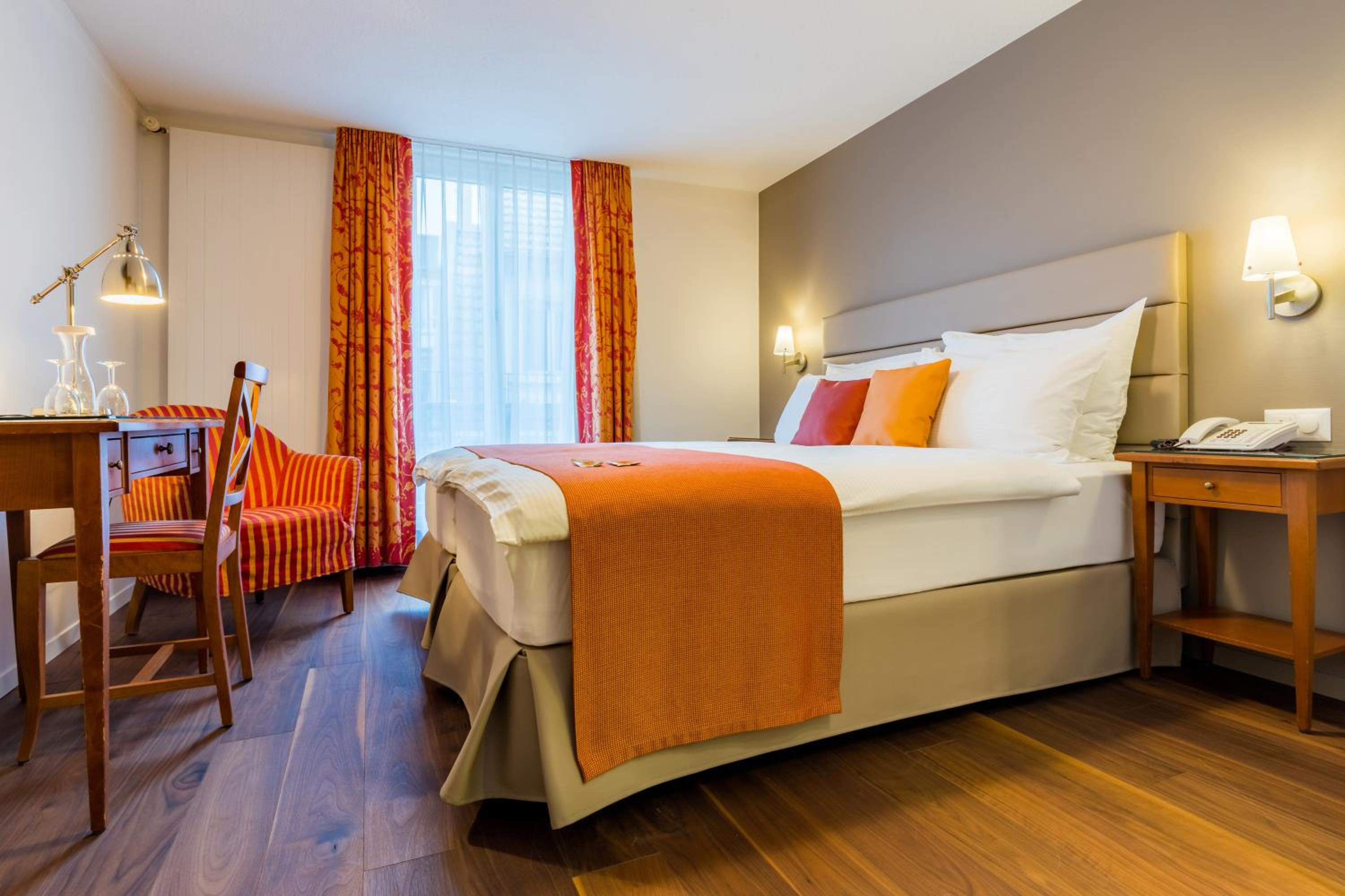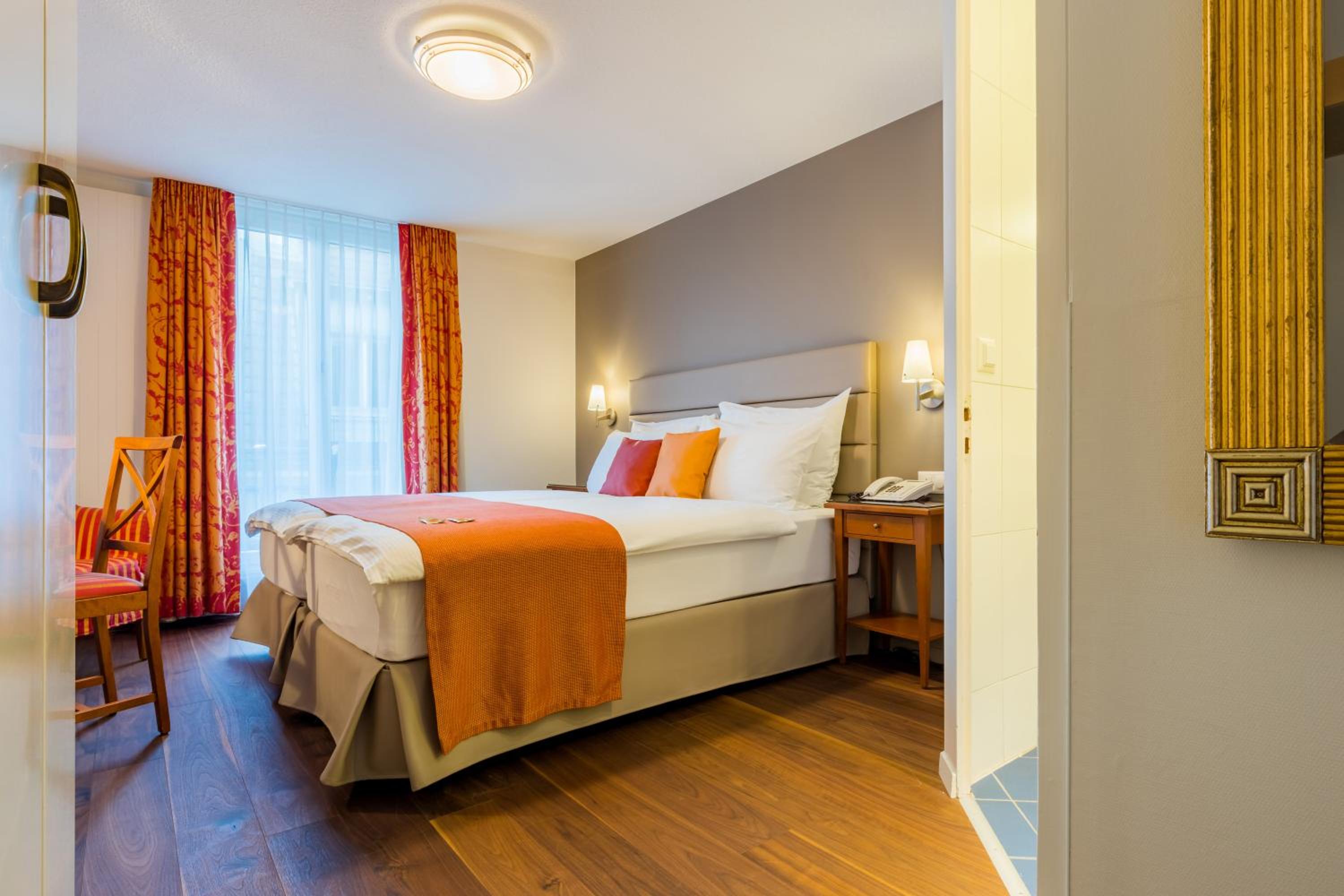 Wake up to stunning views of the lake, Chapel Bridge, and Mount Pilatus from your room at Hotel DES ALPES. Some rooms even offer a glimpse of the historic pedestrian zone. Each well-equipped room ensures a comfortable stay, with some featuring balconies for an extra touch of relaxation.