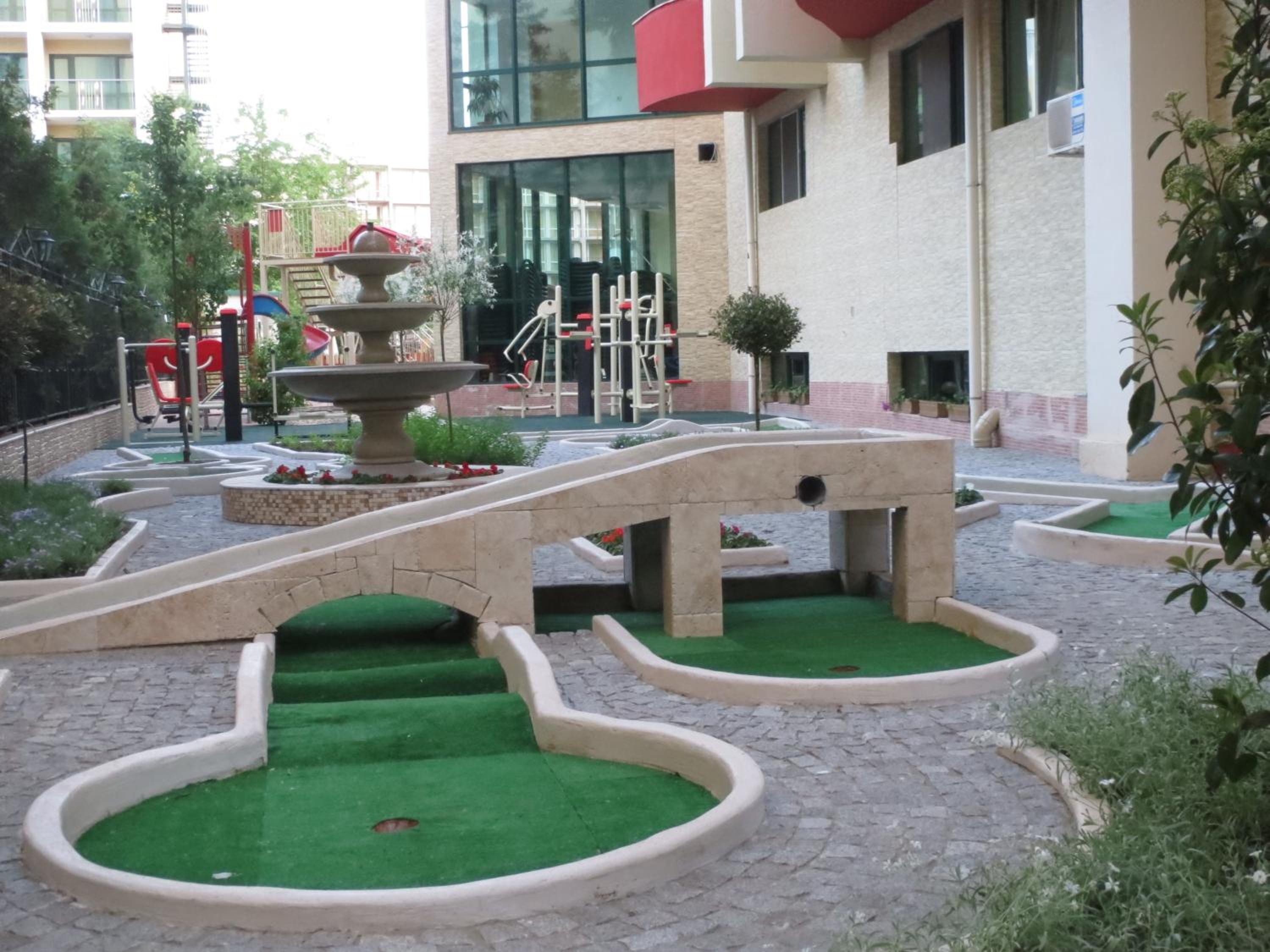 Unwind at the indoor pool with a water slide or the outdoor pool with free lounge chairs. The hotel offers a variety of activities including a fitness center, mini-golf, sauna, and massage studio, all free of charge.