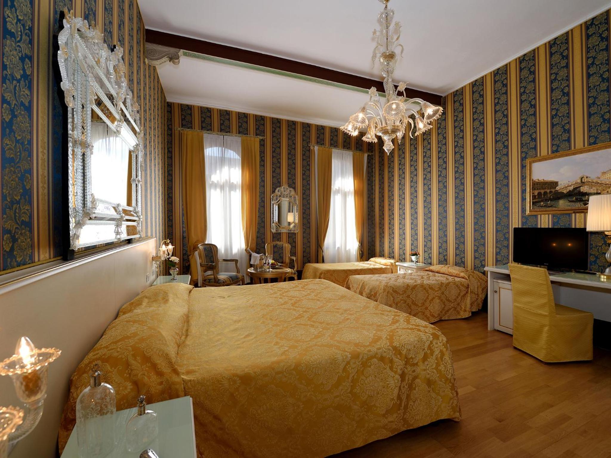 The elegant Hotel Corte dei Greci, a 3-minute walk from St. Mark's Square, seamlessly blends historic charm with modern comforts. Rooms and common areas feature 18th-century Venetian décor, frescoes, and Murano glass alongside LCD TVs and Wi-Fi access. Some rooms offer picturesque canal views, while others overlook the garden or Venetian rooftops.