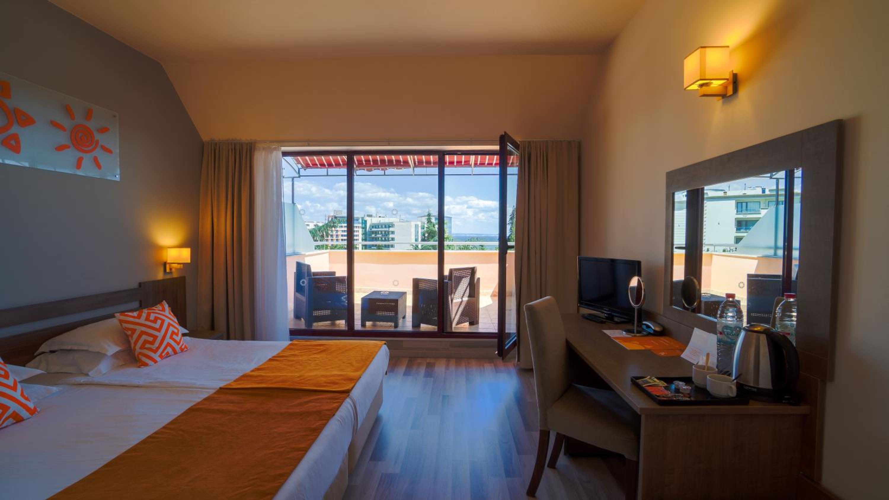 The room has the basics available, and it also has a spacious balcony (with a sea and pool view, as promised). The room also can be well aired thanks to the balcony. Bed is reasonably comfortable (once you arrange the pillows in shapes which fit your neck and all that). Generally, everything is convenient enough.