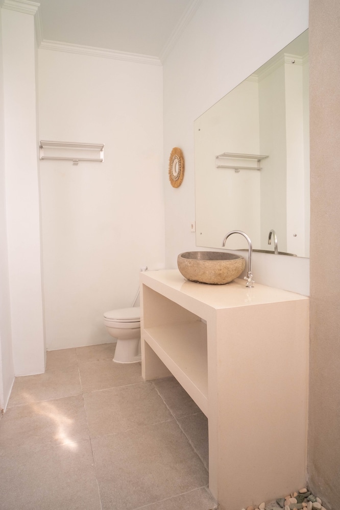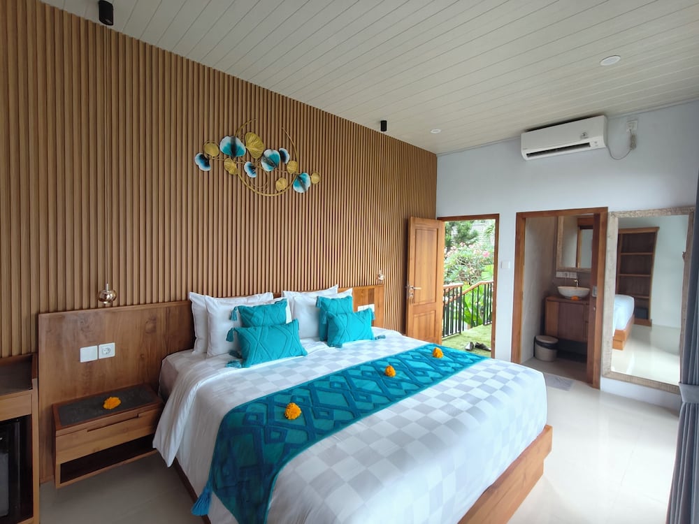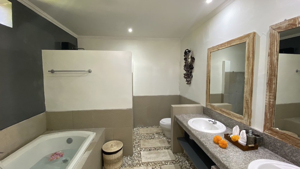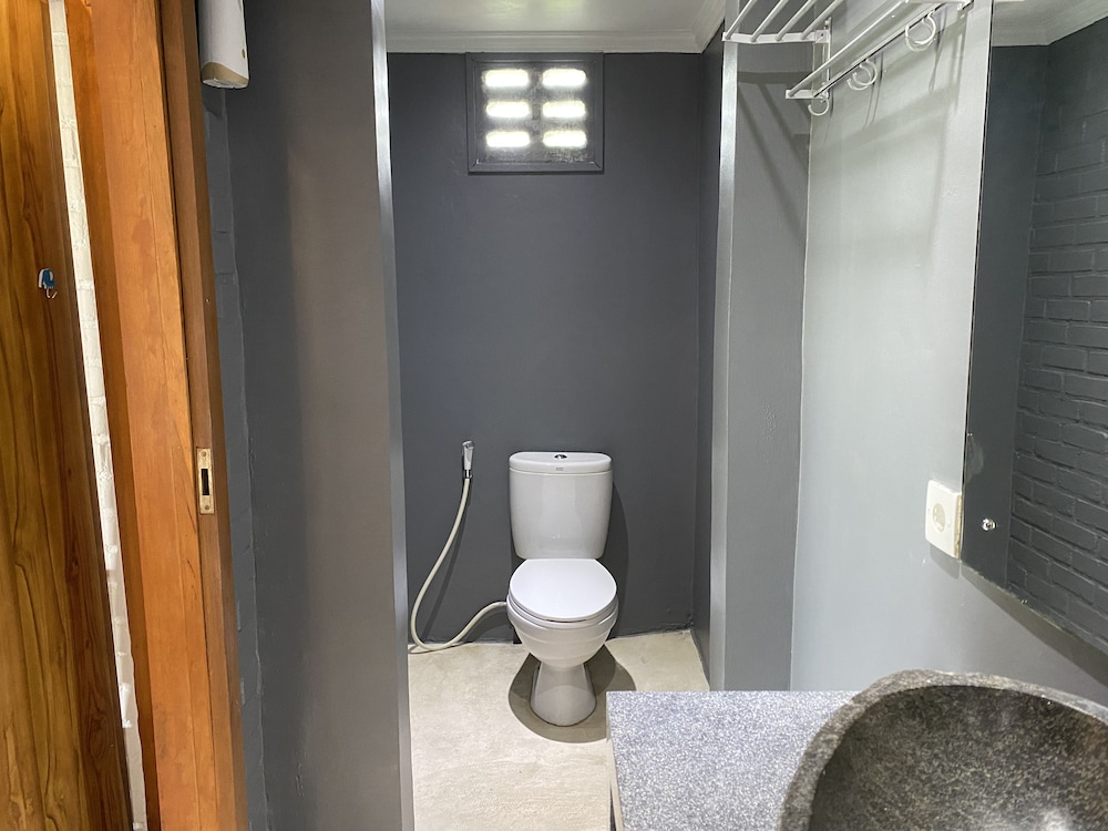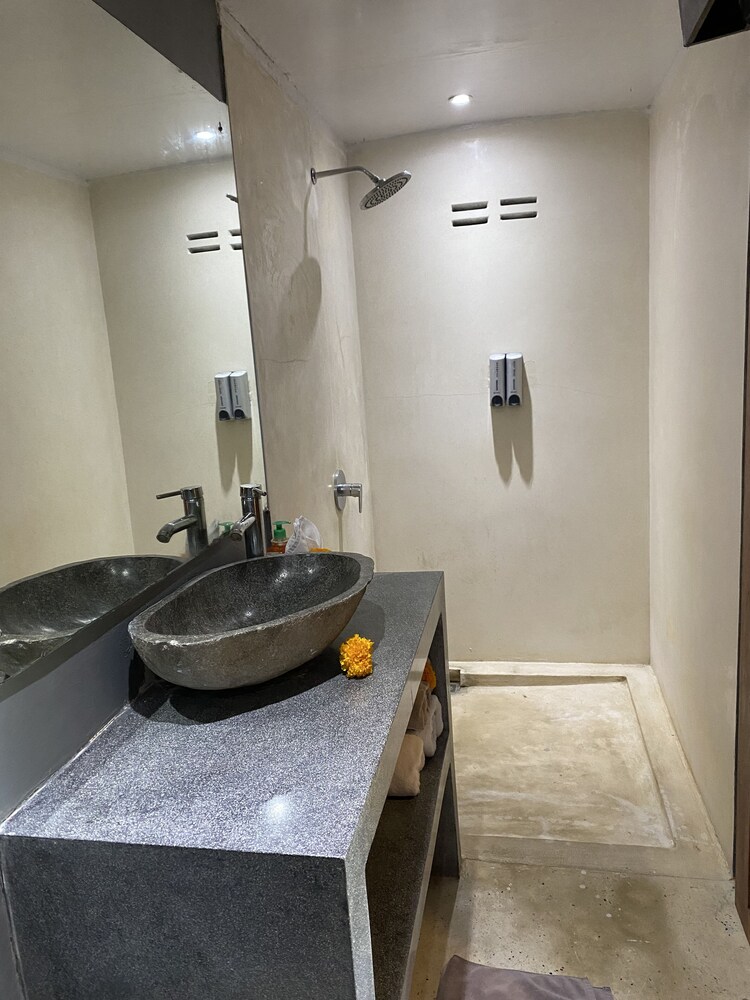 Fenced-in property that required room key to enter, which made us feel safe & secure, especially considering the dilapidated and unlit surroundings. Check-in was smooth and fast, rooms were large & sufficiently appointed with a larger than standard queen bed, integrated desk/closet system, night stands, airconditioning, humidifier, safe, mini fridge, electric flask to make complimentary tea/coffee, sheers and black-out curtains as well as attached bathroom with large shower space. We appreciated the daily cookies, flowers, aromatherapy (fragrance burner?) and complimentary fruits by the pool. We took advantage of the communal kitchen to make lunch one day. We wished they had provided two rooms next to one another, requested many times through Agoda and directly to the property instead of one unit on the ground floor and the second unit on the 2nd floor. Also, there is no TV in the rooms (only in communal social area), glass sliding door to the room was tricky to open/close, the whole bathroom gets wet everywhere because there is no door or partition in shower area and we could not hang wet towels or clothes in the shower area bec of lack of hanging bars or hooks. Overall, we loved the property because the staff/people were phenomenal, it felt like an oasis among the chaos of speeding, noisy traffic that seems to afflict the whole of Bali and it provided us accommodation, amenities and ambience that are beautiful and calming, exactly what we were looking for in a vacation.