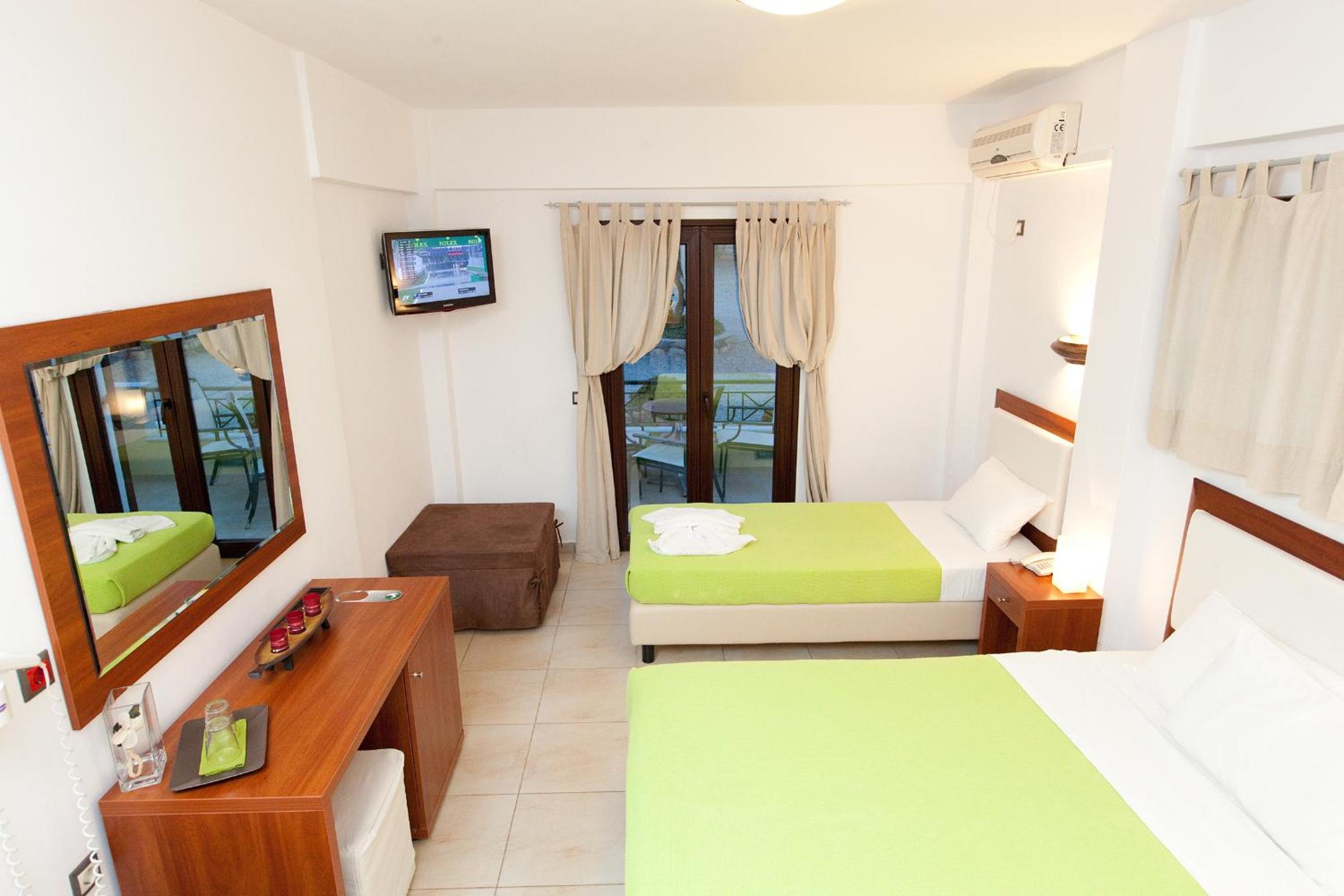 Stylish Rooms and Suites: Berdoussis Hotel offers tastefully furnished rooms and suites with free Wi-Fi, private balconies, plasma TV, and safety box. The bright and air-conditioned accommodations feature colorful splashes for a vibrant touch.