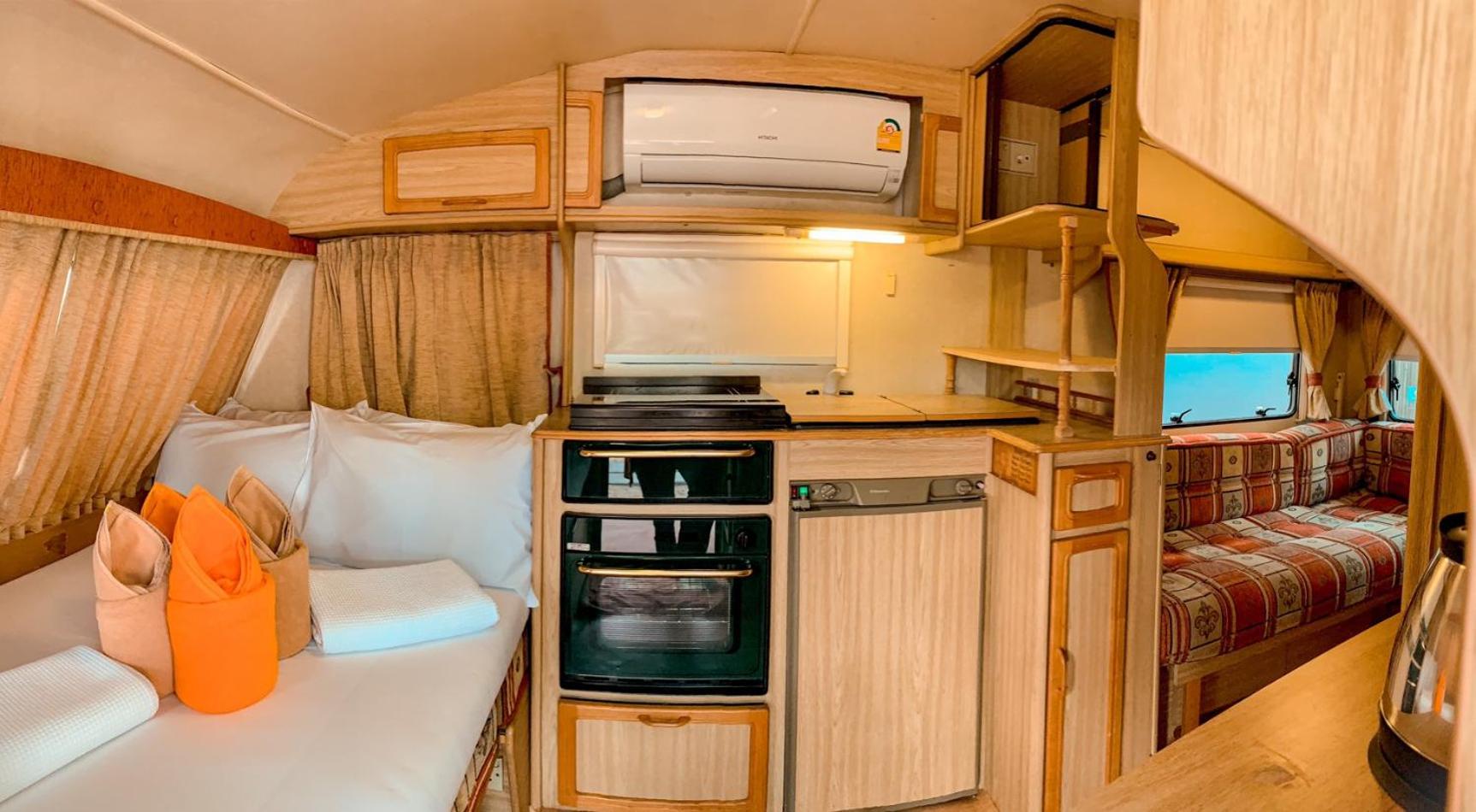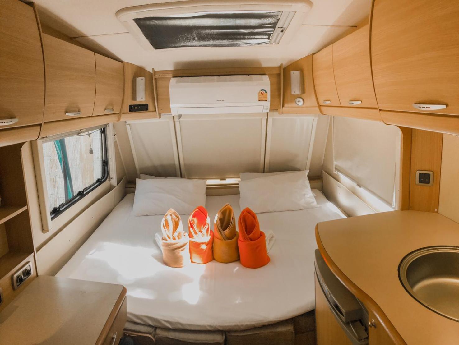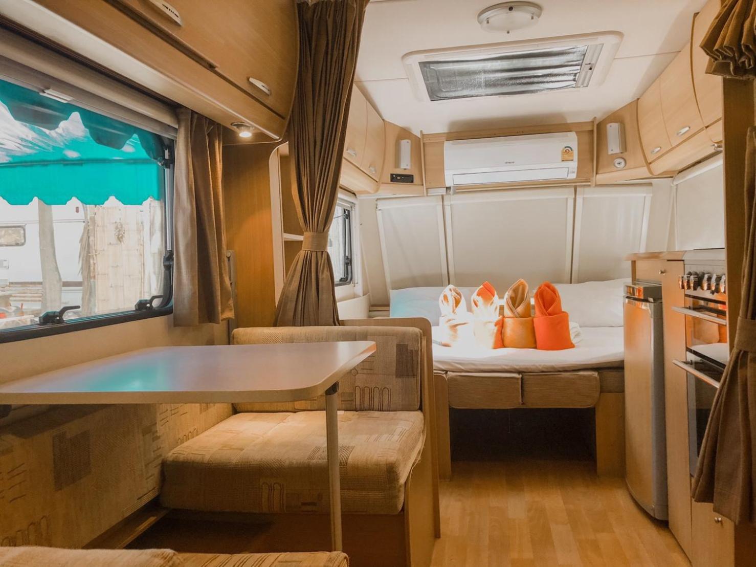 Unique place. Sleeping in RV camper/Caravan. Next to a restaurant and within walking distance of other restaurants.