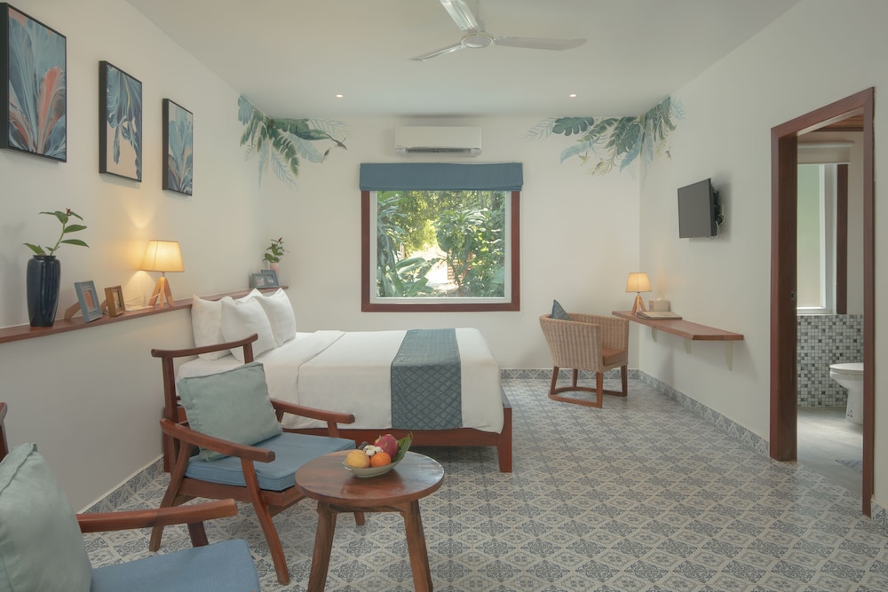 Slightly reminded me of my visits to club med without the noise , sport options and go’s . Spread over a large piece of land some rooms are close to the main bldg others not , we were just 2 minutes away . Nice swimming pool with view on a nice beach . Rooms are large as is bathroom and pretty . Tv in room without any channels but YouTube is available . Breakfast is good but repetitive no or hardly anything changed at the food served during our stay .