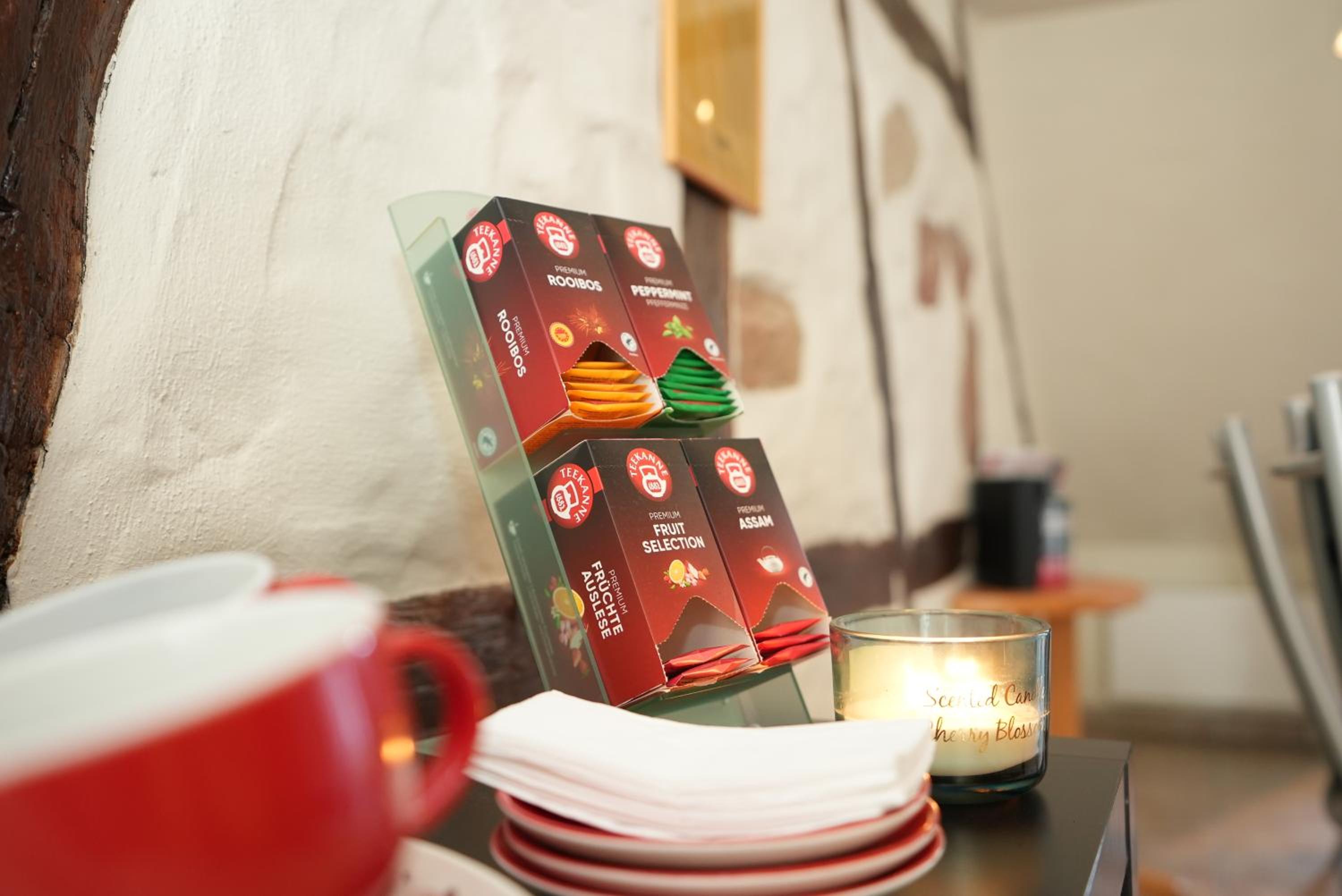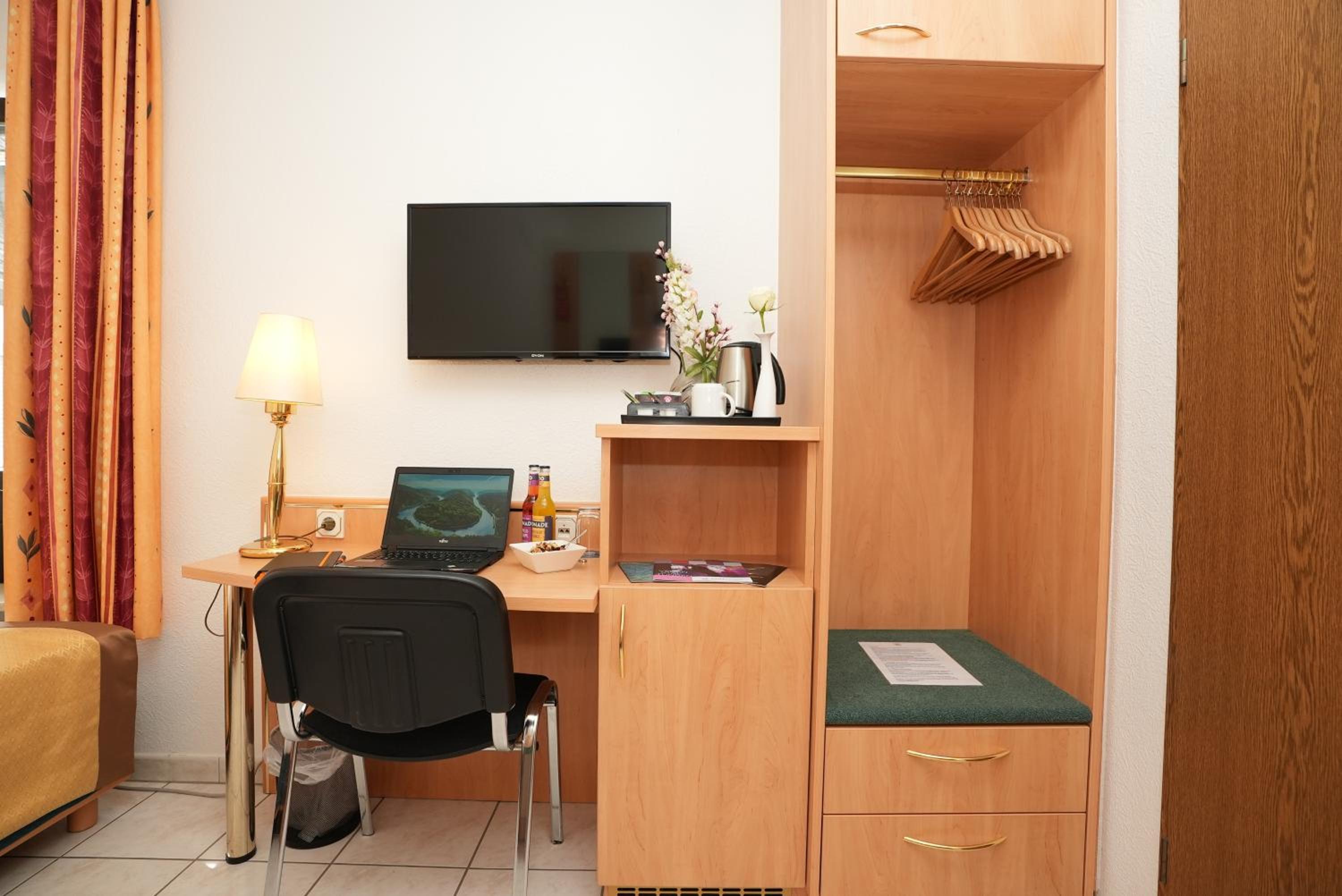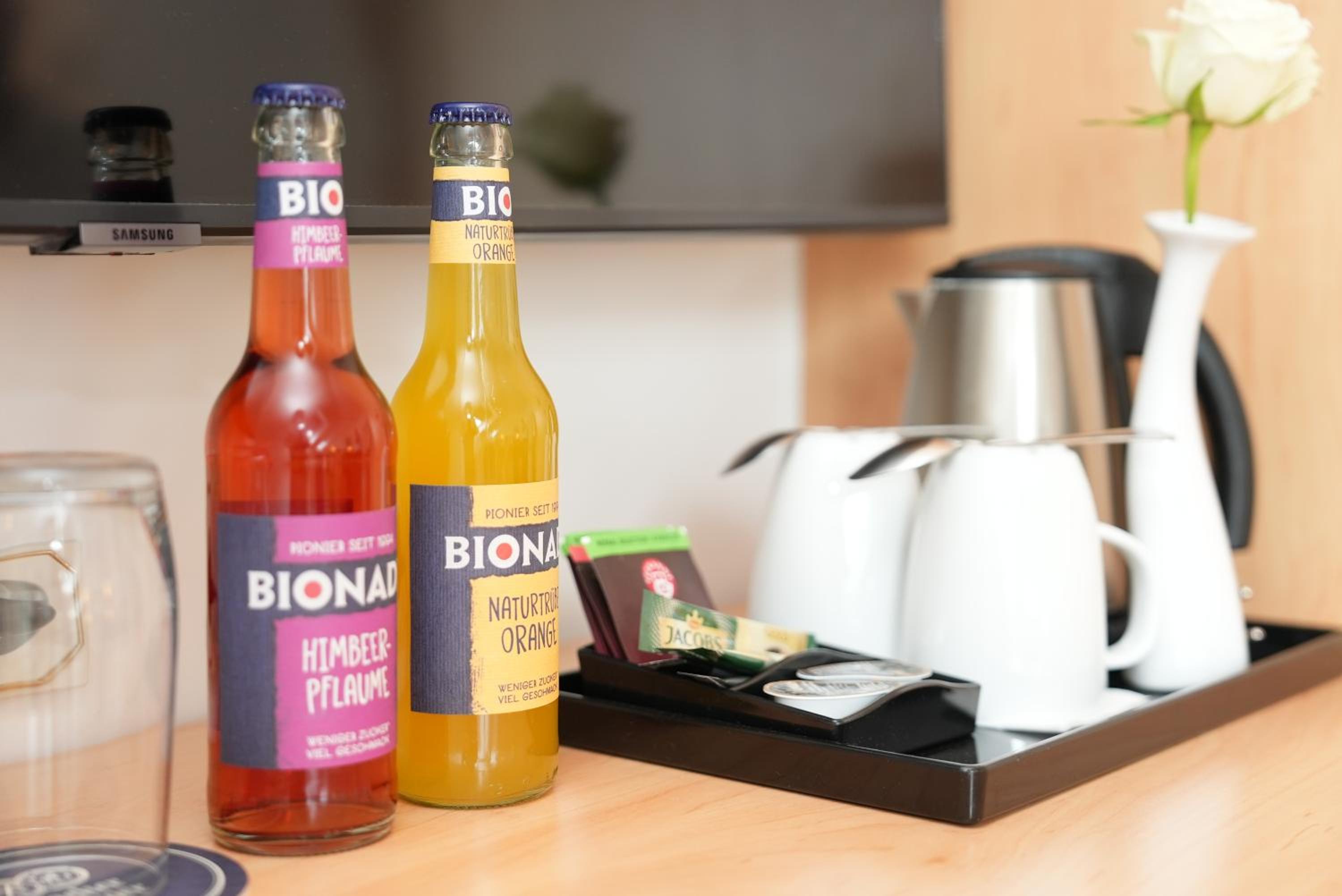 Tee, Wasserkocher und Kühlschrank im Zimmer