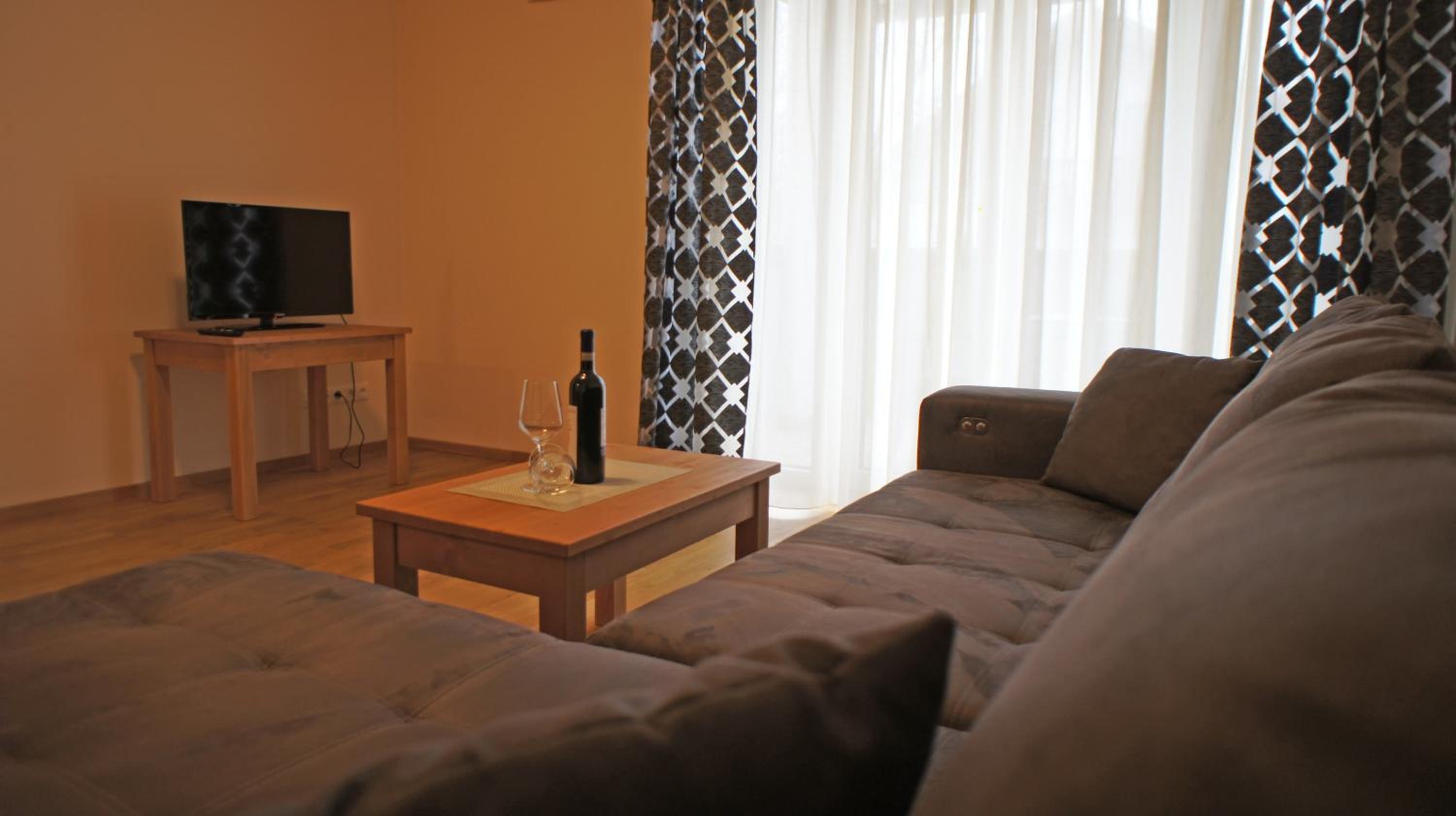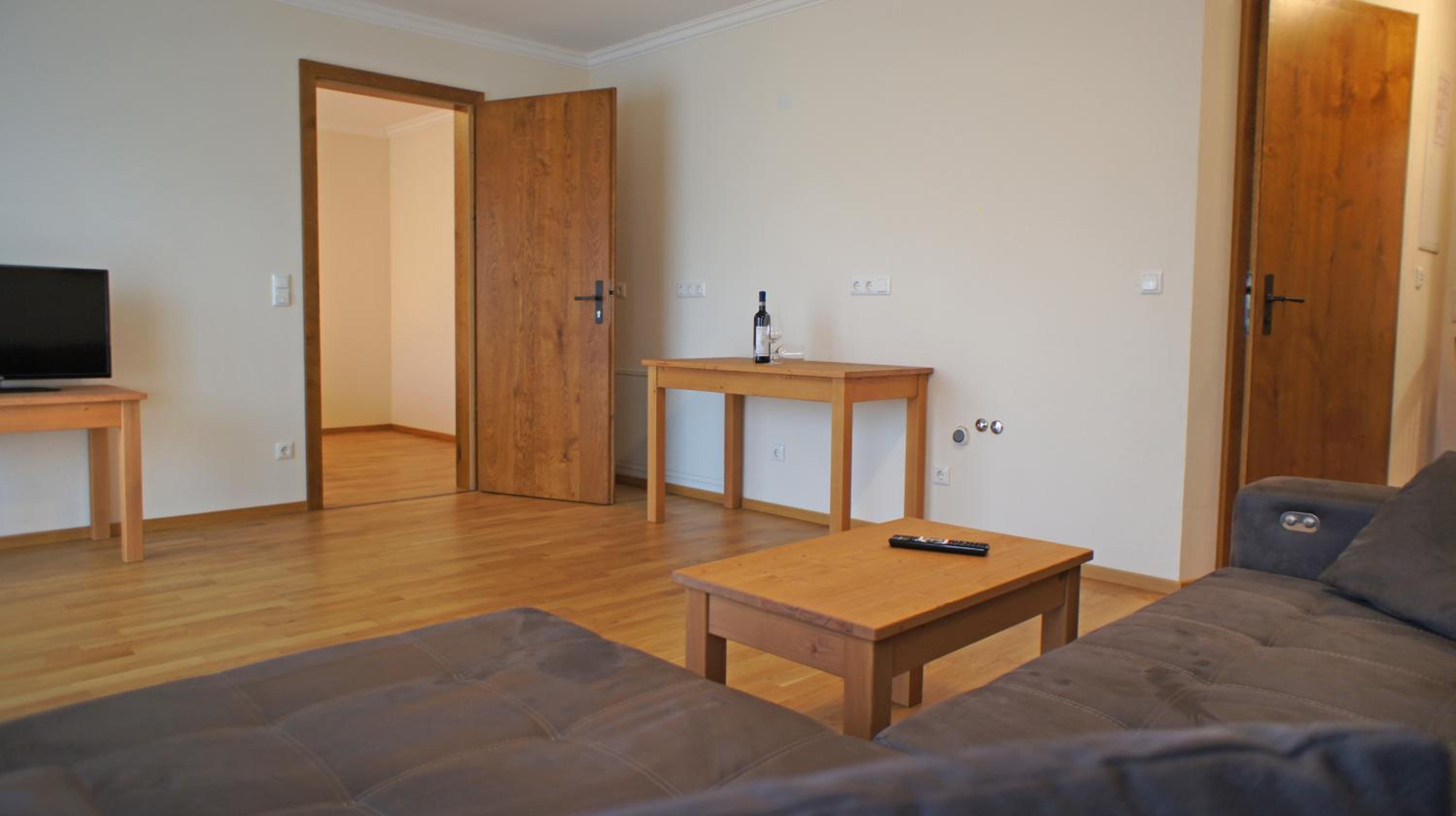 Стены голые, только телевизор. Не хватало уюта. Можно купит пару баварский пейзажей на барахолке..