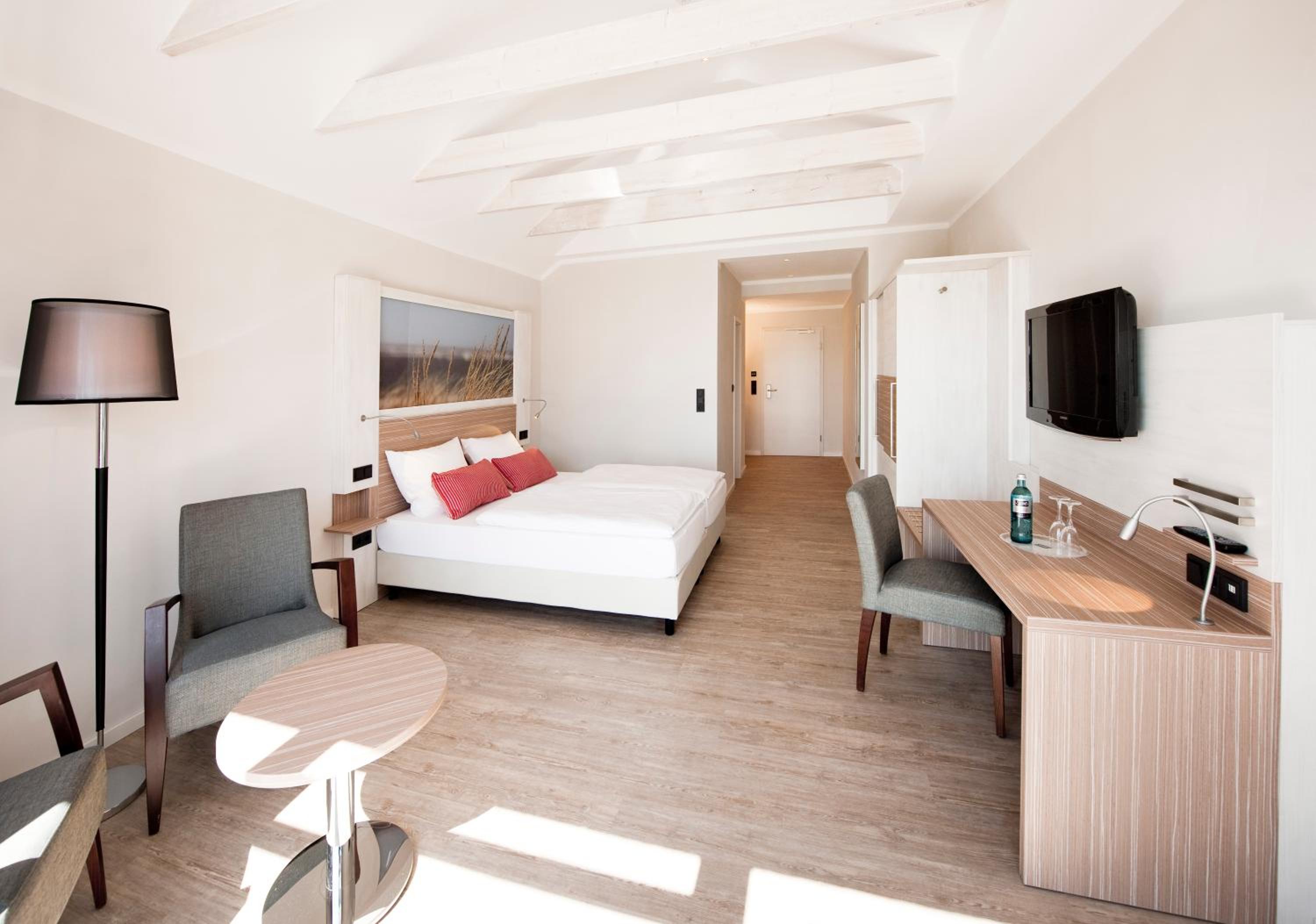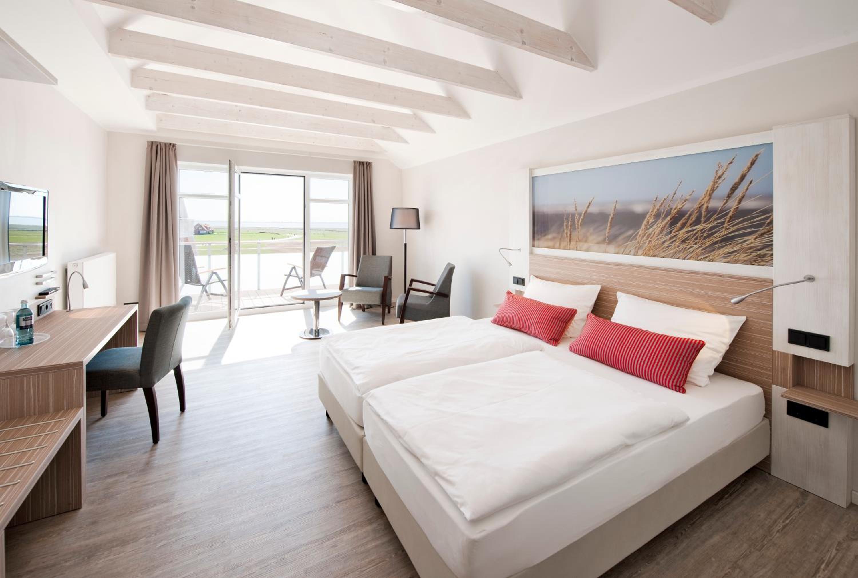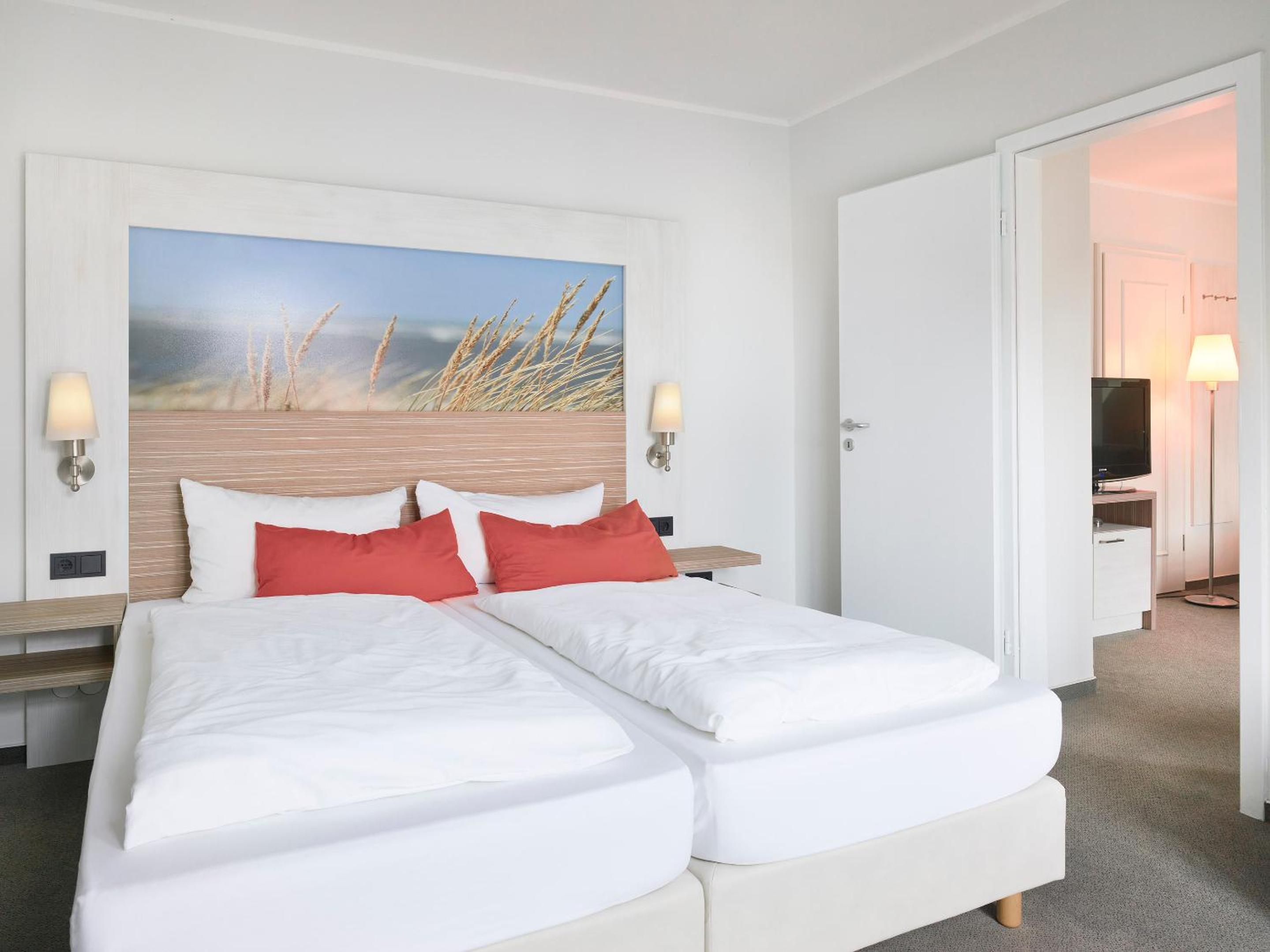 Relax in our bright and elegant rooms equipped with satellite TV, free WiFi, and modern furniture. Some rooms even feature balconies with picturesque views of the North Sea and Baltrum Dunes. Our wheelchair-accessible rooms ensure comfort and convenience for all guests.
