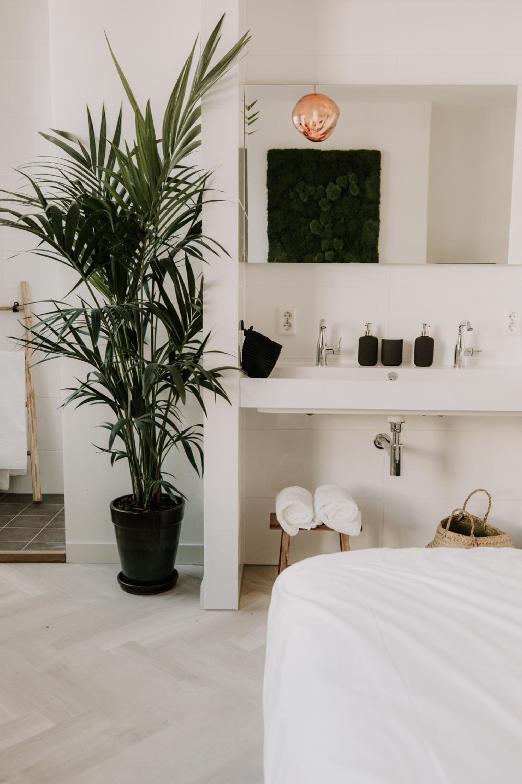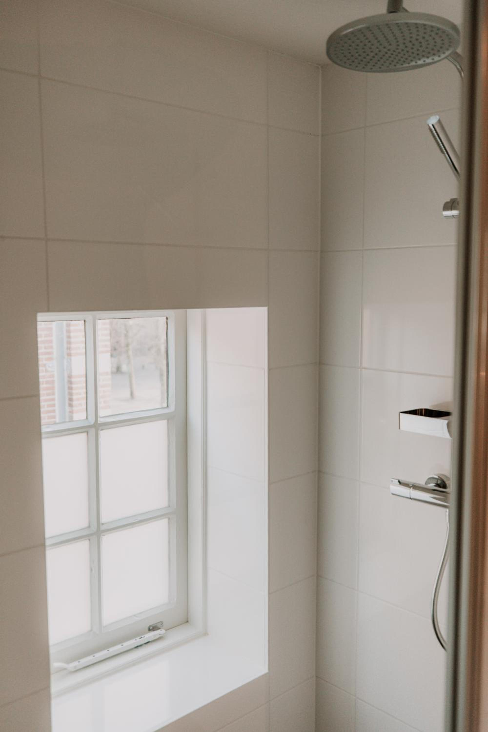 Sfeervolle kamer met heerlijke regendouche en een comfortabel bed.
