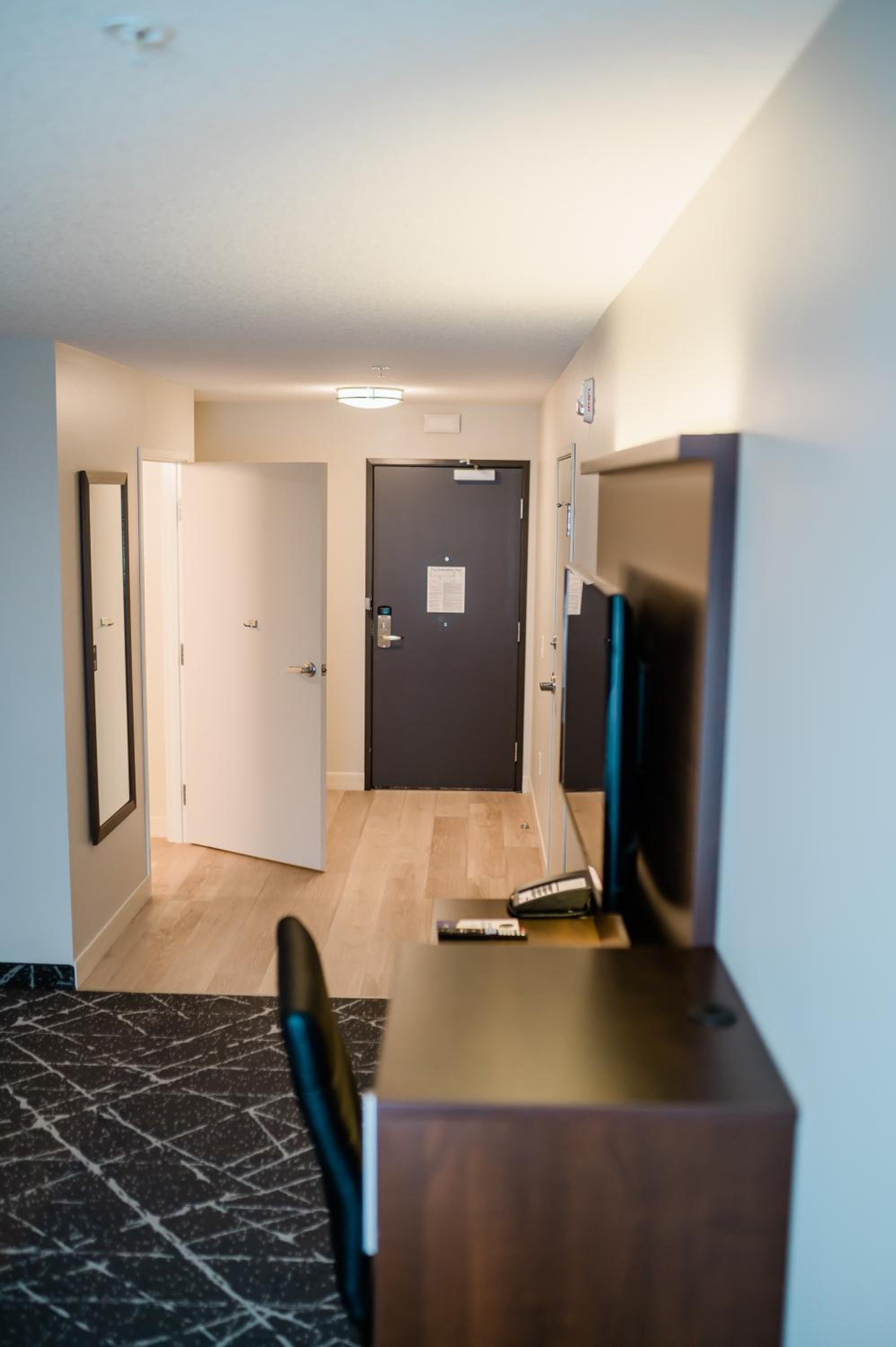 The room was spacious and clean. T.V. was a decent size. Breakfast was good and 24hr. coffee station was nice to have. Also the bathroom and shower were a good size as well.