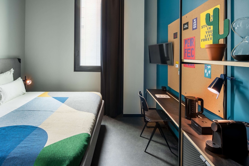 Estuve alojada un día. Me interesaba el hotel por su cercanía a la estación de tren ya que iba realizar un viaje por Italia. El personal del hotel fue muy amable, la habitación muy grande y cómoda ( al llegar nos dieron una habitación mejor a la solicitada). El hotel es un hotel especial, con un ambiente joven, un diseño muy original. Desayunamos en la cafetería. ademas una cosa a remarcar es el interés del hotel por la sostenibilidad y el medio ambiente.