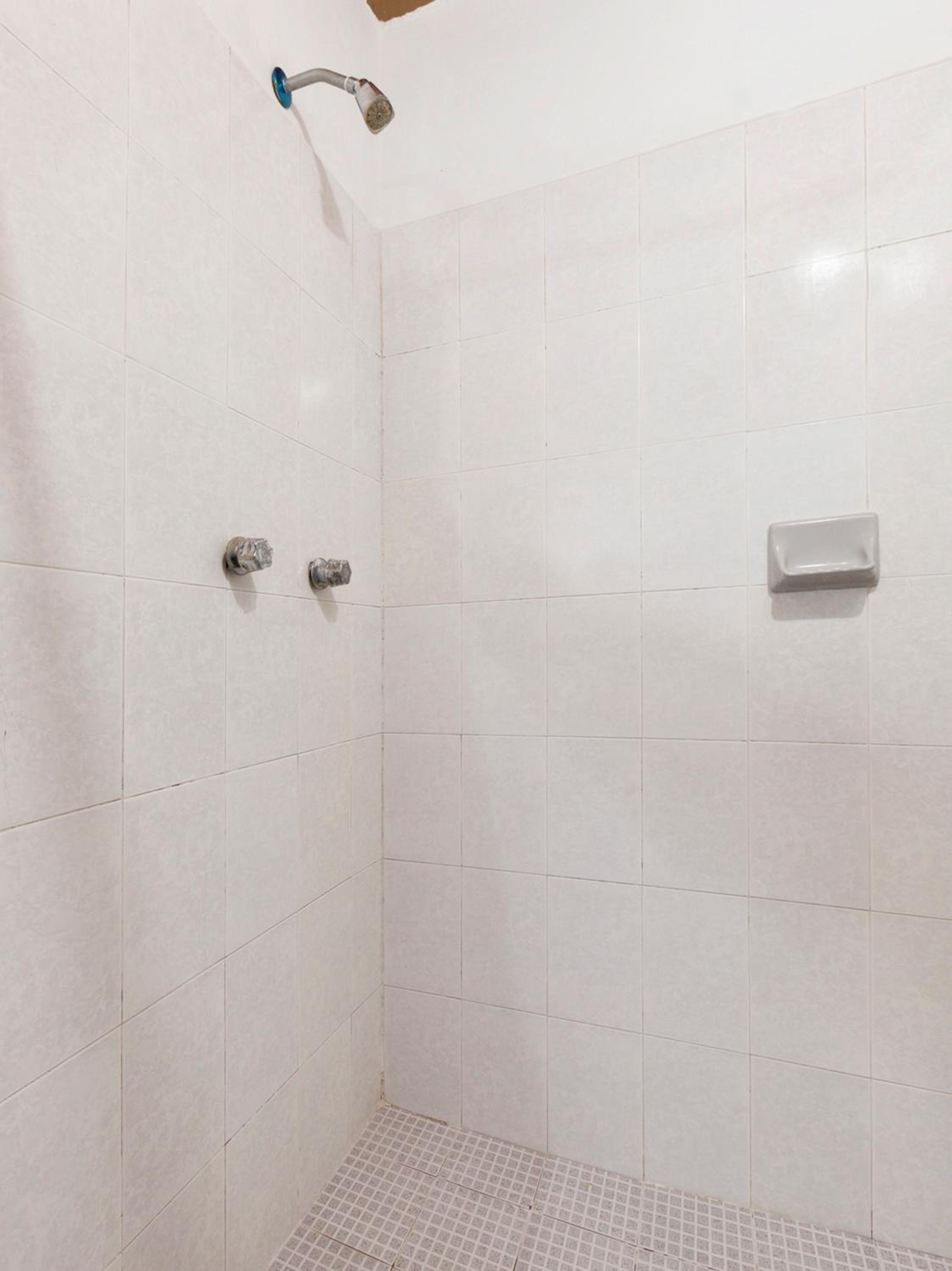 The shower head needed cleaning as water sprayed everywhere.