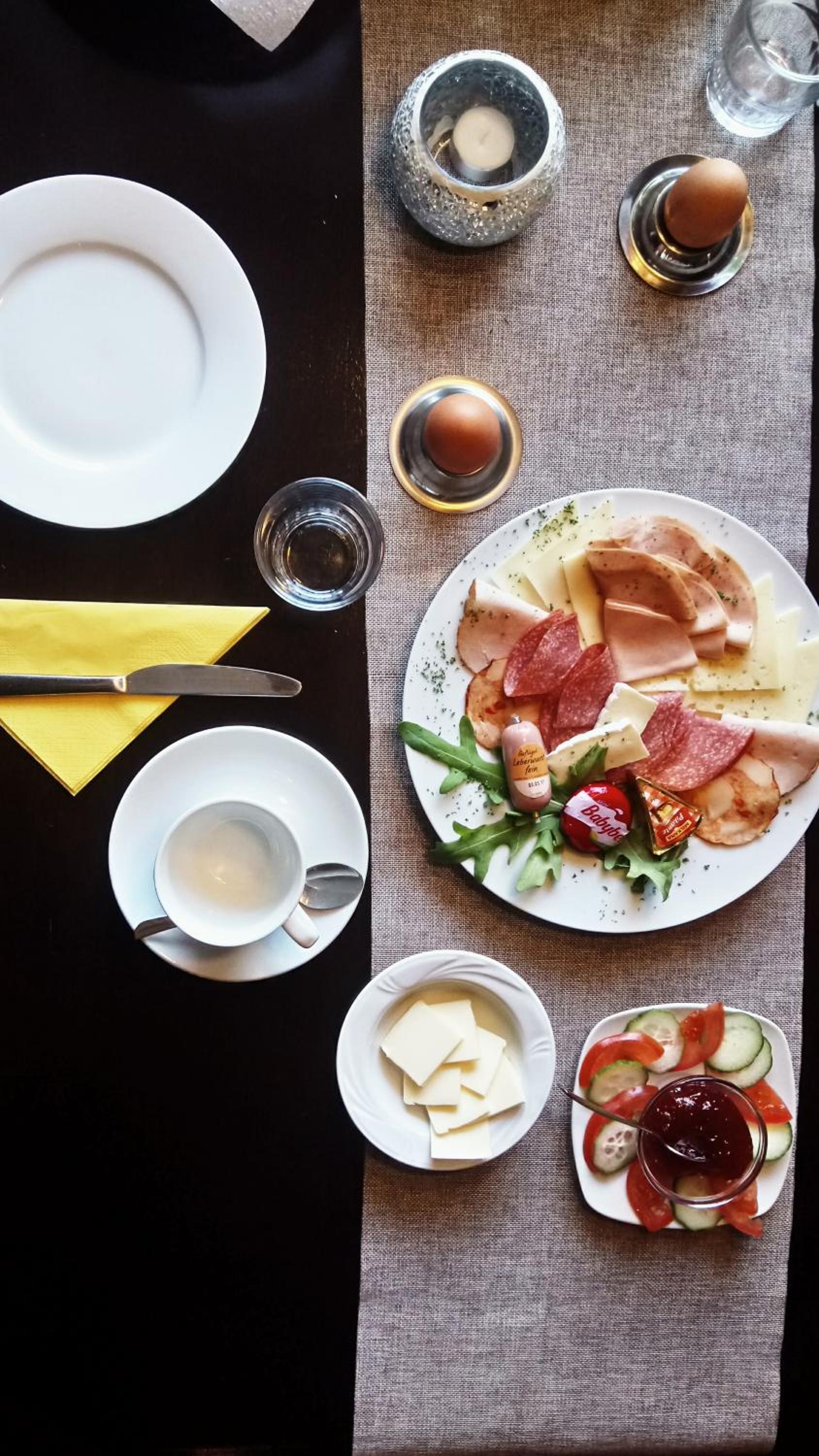 Gebucht haben wir ein einfaches Doppelzimmer für 2 Personen. Bekommen haben wir - ich kann es nicht anders nennen - eine kleine Suite mit Küchenzeile, Wohnbereich, Badezimmer und separatem Schlafzimmer. Darüber hinaus war das Zimmer klimatisiert, was bei den 33°C, die wir an diesem Sommerlichen Wochenende hatten, eine ziemliche Erleichterung war. Das Frühstück war außerdem auch ausladend und sehr gut für den Preis - sollte man sich allerdings Vegan ernähren würde ich empfehlen das vorher bekannt zu machen. Bei uns war das nicht der Fall, daher kein Abzug :).