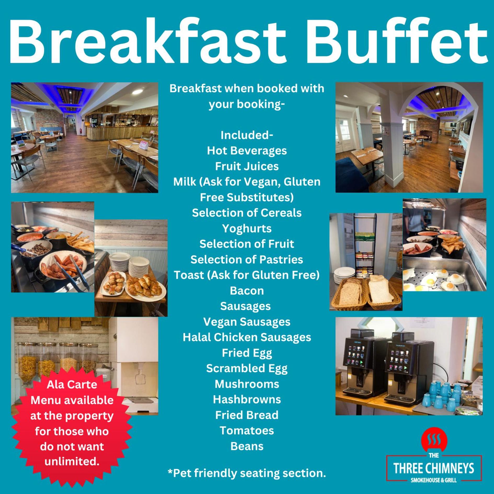 • Breakfast- is served as a Buffet and consists of Toast, Cereals, Juice, Hot Drinks, Pastries, Fruit and Yogurts, Bacon, Sausages, Fried Eggs or Scrambled Egg, Tomatoes, and Beans. Hashed Browns, Mushrooms, and Fried Bread. We also have Gluten Free and Vegan options. (Occasionally Breakfast may be cooked to order instead of the Buffet, but you will still be able to choose to have whatever you want). Children under the age of 2 are free with a paying adult.