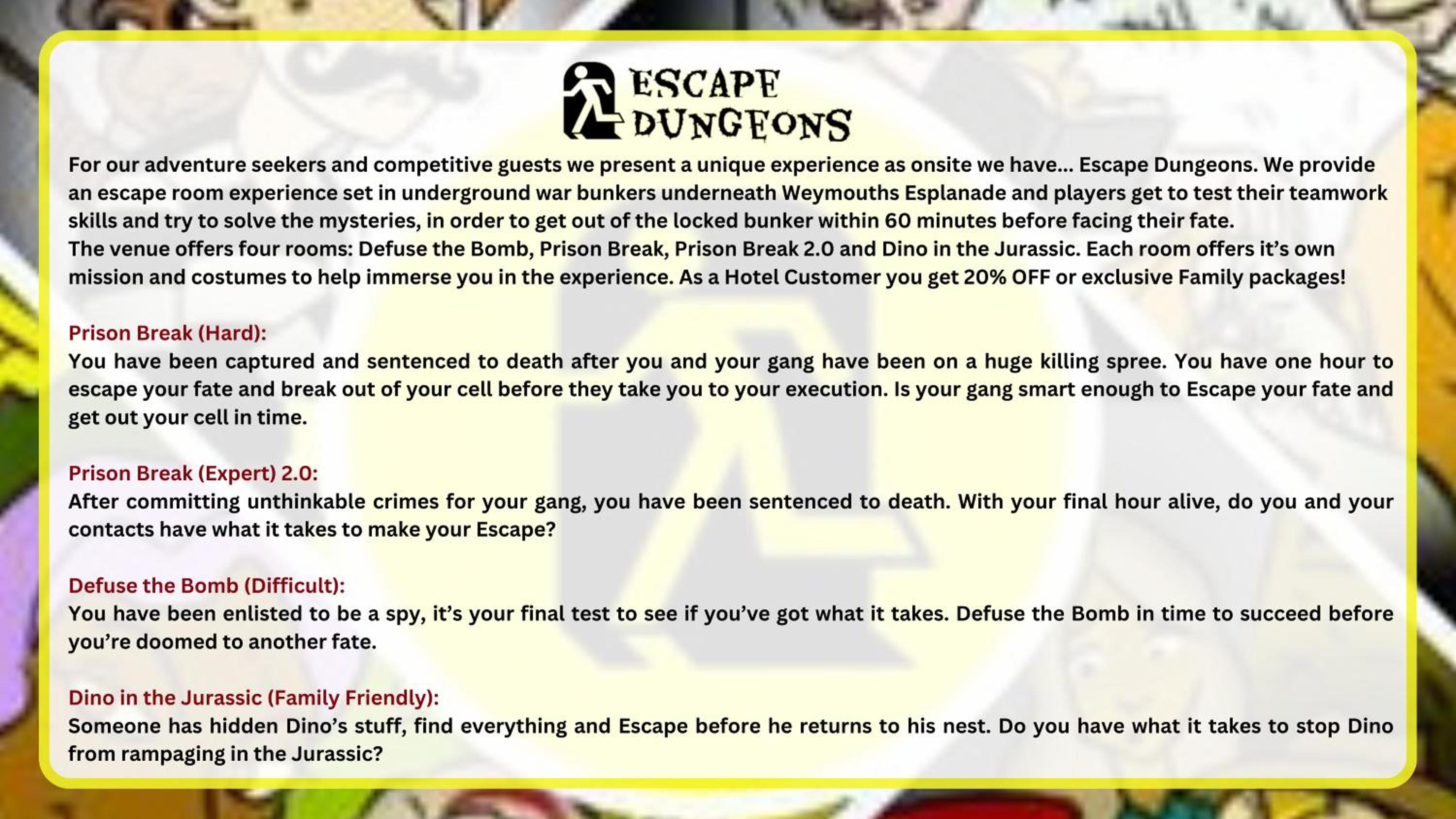 • We have onsite extra facilities such as elevators, a Spa, Hot Tub Garden, Escape Rooms, Car Parks, Function Rooms and Restaurant and Bar. The price of your booking covers the accommodations of your room, any meal plans attached and any extra services you booked. It does not include our Facilities some of which are free and some of which cost you extra to book. As such when you arrive if a Facility is fully booked, undergoing maintenance or unavailable no compensation will be offered