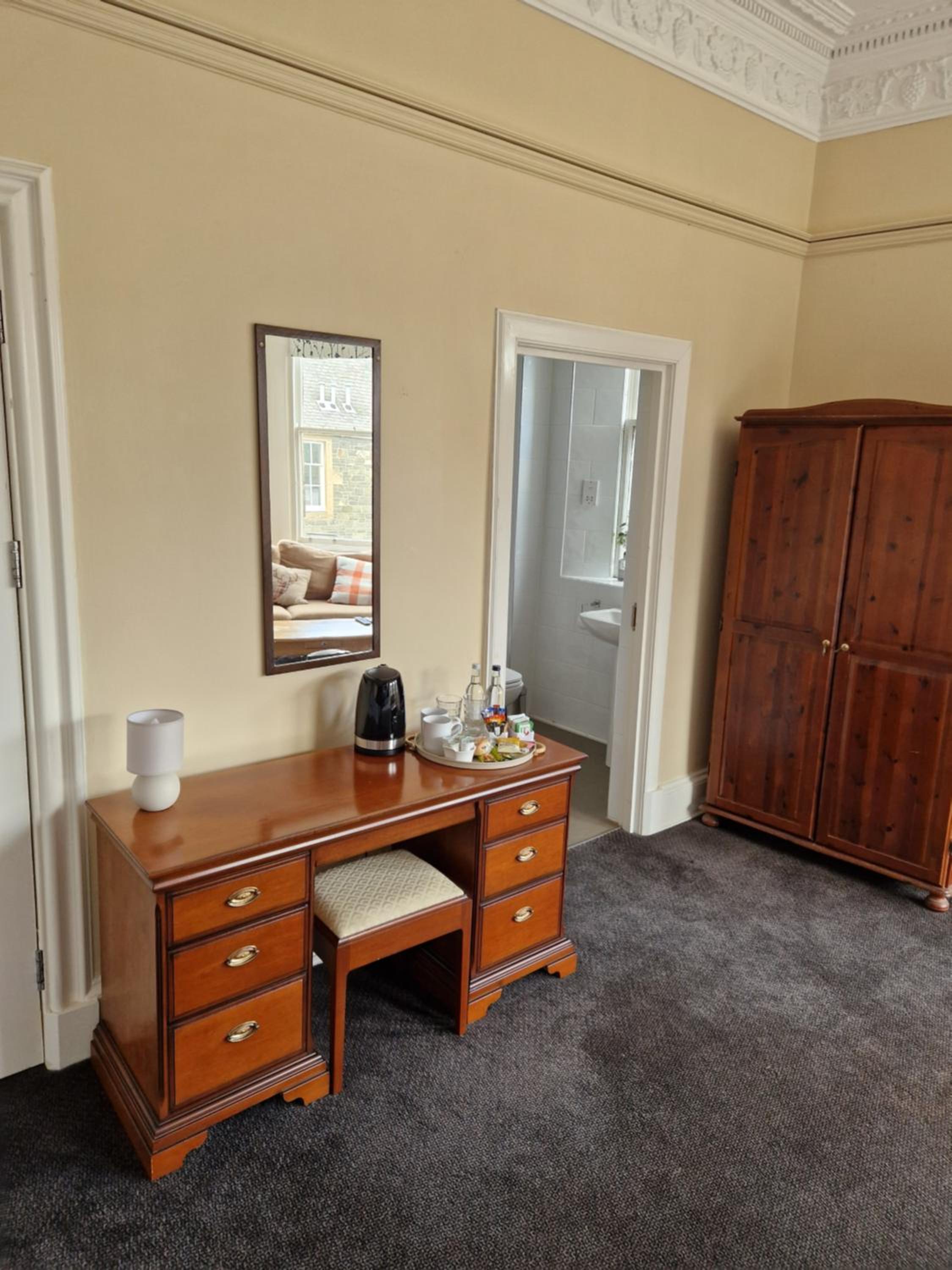 Small and friendly and very convenient for Peebles High Street. Hassle free booking and nice to have a range of biscuits and bottled water etc alongside the tea, coffee and hot chocolate on the tray in the room. Amazon fire stick in TV was a bonus even if TV screen itself was a little on the small side. Peebles is a charming town so being in the centre was great. Public car park just behind the main street was convenient and (for me on a Sunday) free.