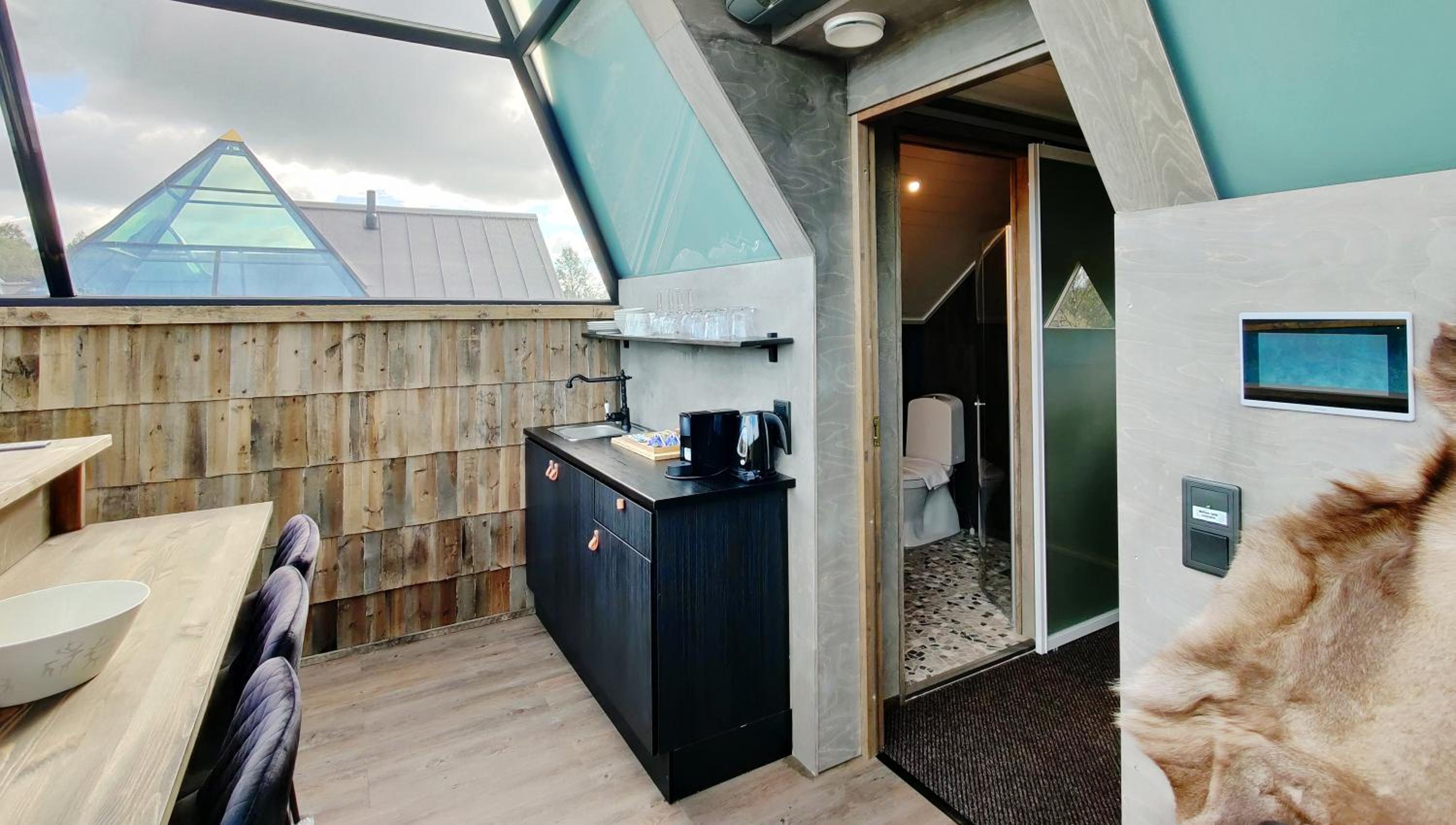 Die Pyramide an sich war ein tolles Erlebnis und wir hatten das Glück, dass die Nordlichter an dem Abend gut sichtbar waren. Die Pyramide ist eher klein bemessen, aber sehr stilvoll eingerichtet mit Wasserkocher und Nespresso Kaffeemaschine. Die Betten waren sehr bequem.