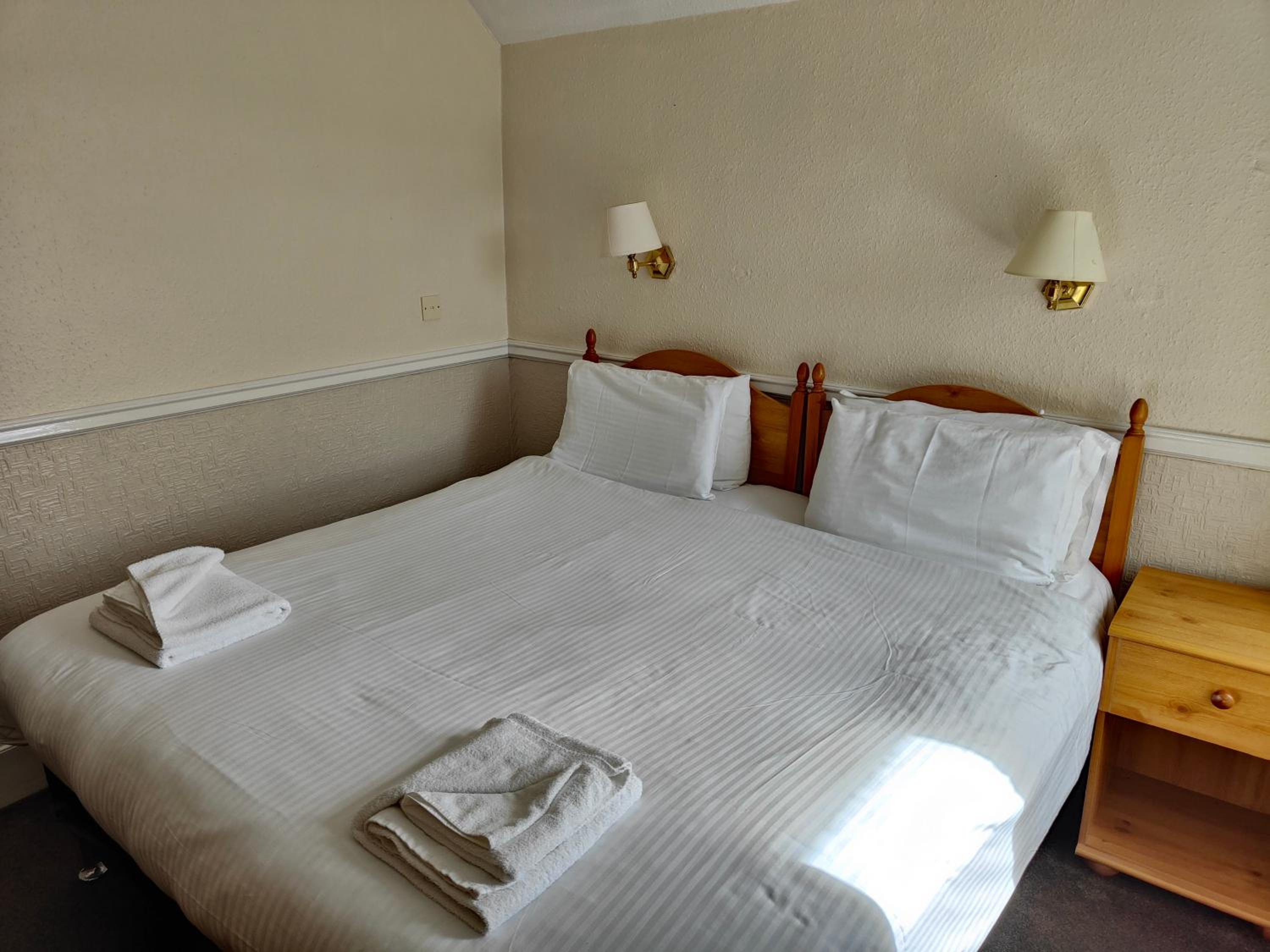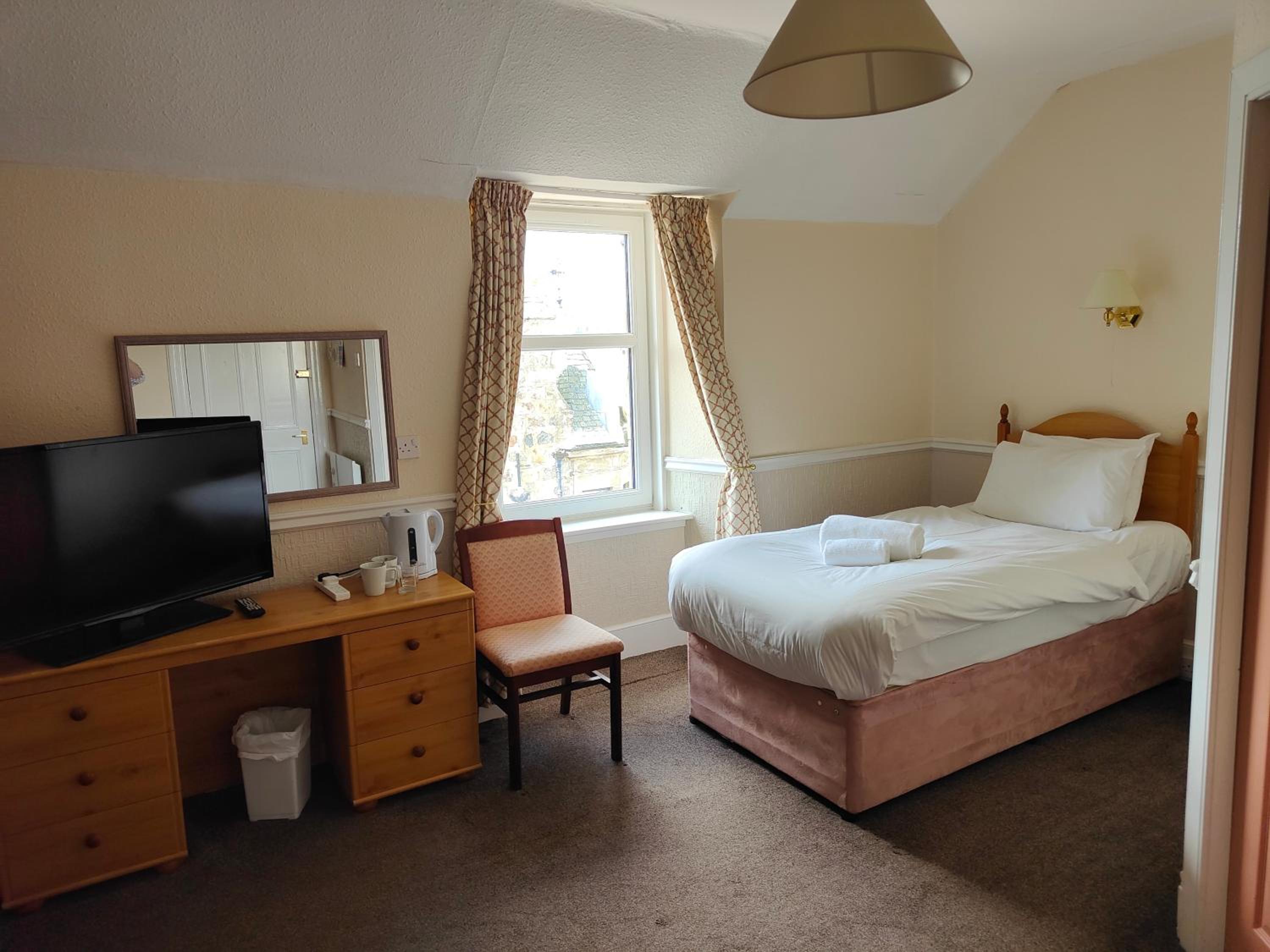 Chambre restée "dans son jus" depuis quelques décennies. L'hôtel vieilli et les chambres ne semblent pas faire l'objet de travaux de rénovation, surtout la salle de bain. Mon matelas avait dû également traverser les âges et donnait l'impression d'un matelas à eau. L’accueil pourrait être amélioré car il semble qu'il y ait du personnel mais la présence d'un pub au rdc monopolise la main d'oeuvre !