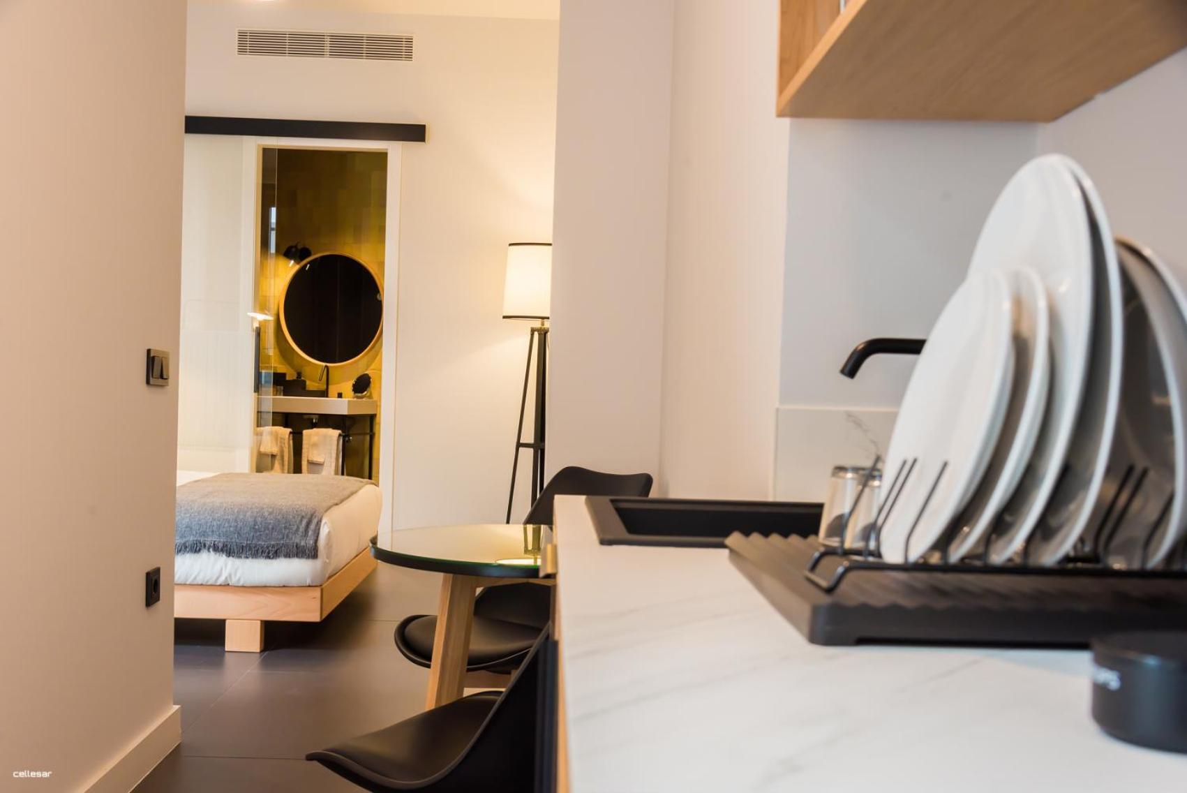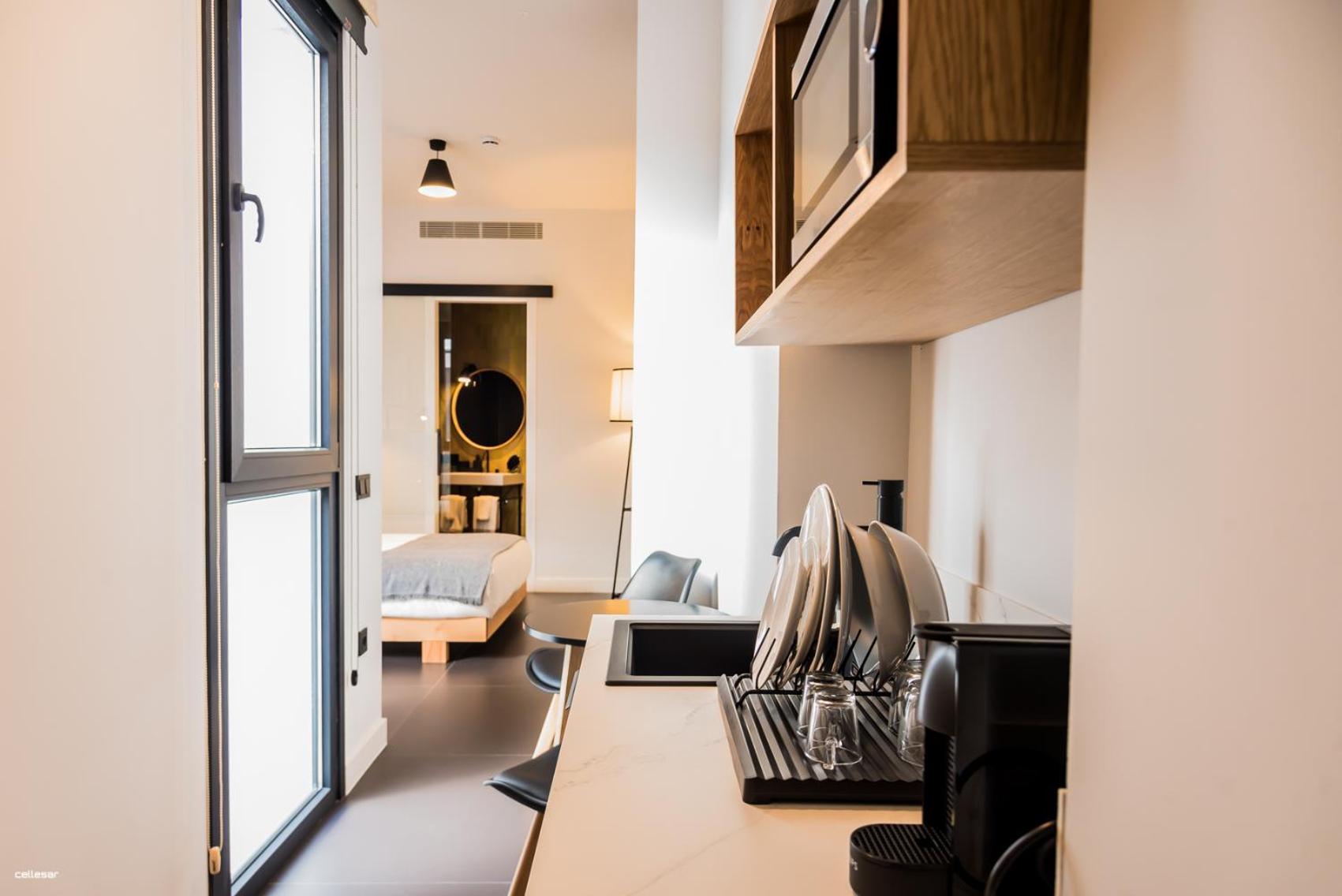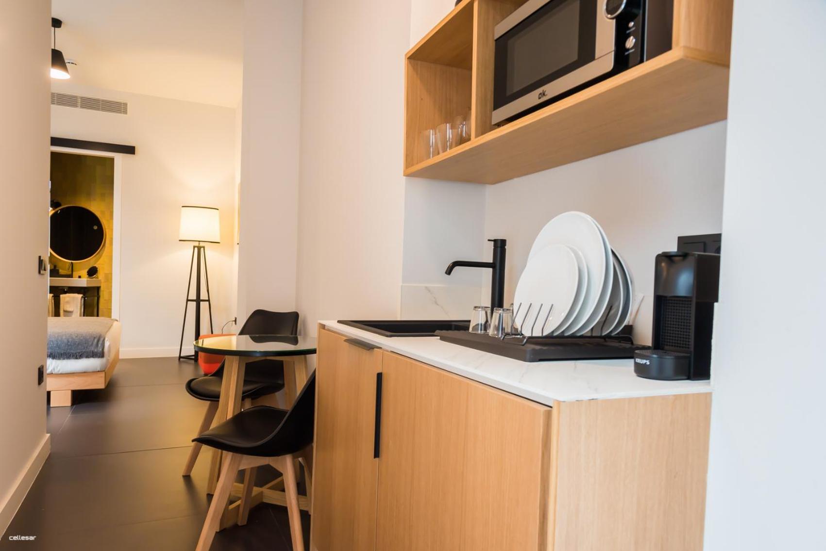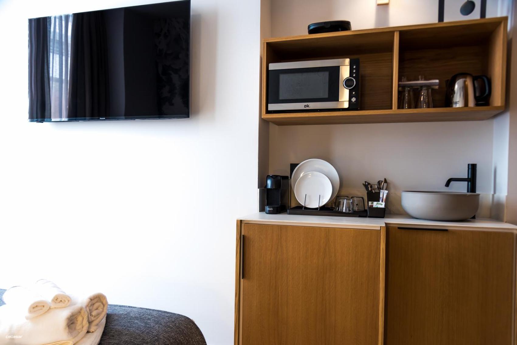 El pequeño office con café, nevera, platos, sandwichera, microondas. Fantástico si vas por unos días o quieres desayunar en la habitación.