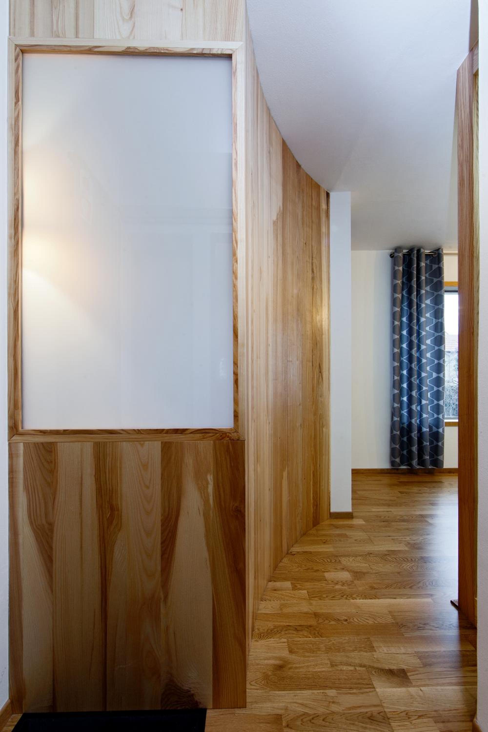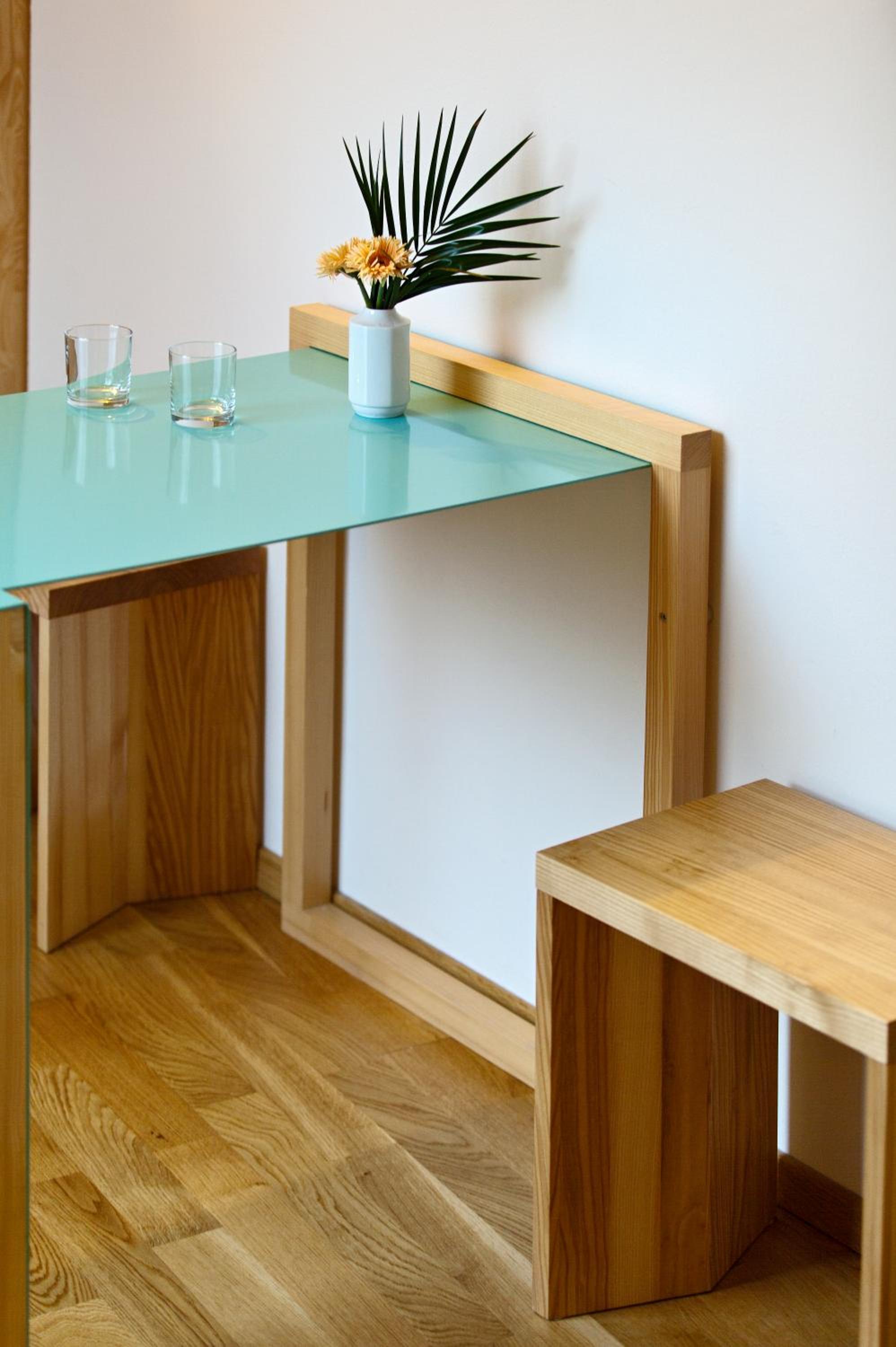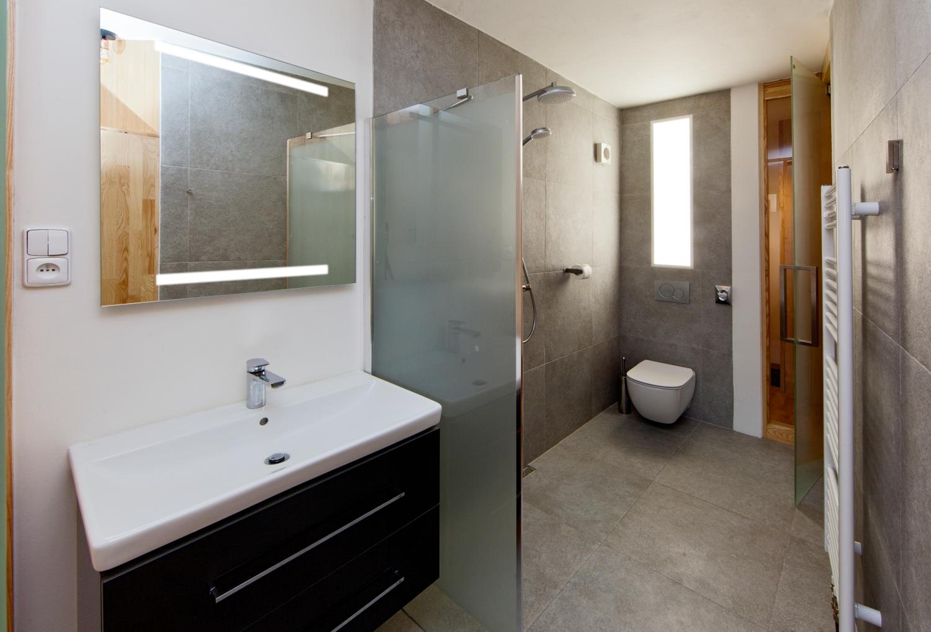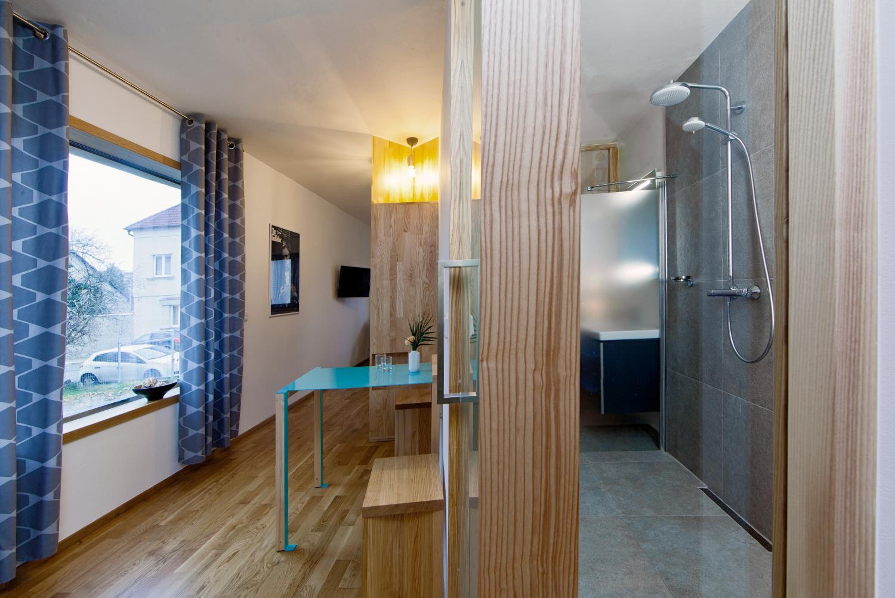 Absence kuchyňského koutu, nešikovně řešená koupelna - průchozí místnost, oddělená dvěmi celoskleněnými dveřmi, při sprchování byla voda všude.