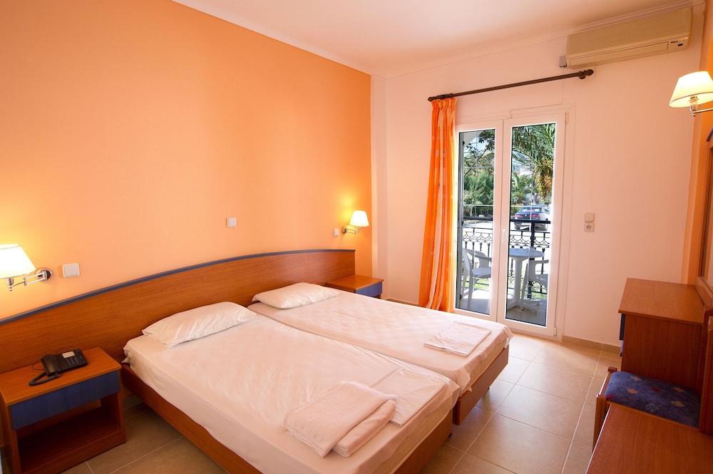 Hôtel familial, charmant, simple et fleuri. Le personnel est adorable et la très belle baie de Kalamaki -Laganas vous font oublier la proximité de l'aéroport.