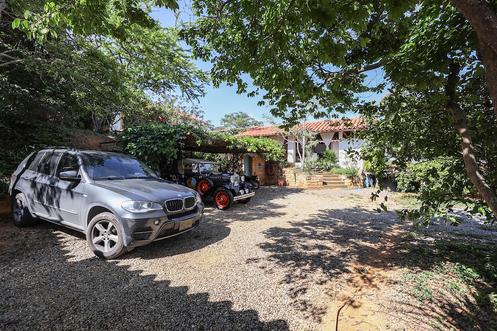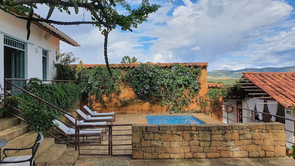 El hotel es precioso, a 4 cuadras arriba de la plaza principal, no hay nada de tráfico por allí Entonces no se oye el ruido de motos o carros habituales de cualquier municipio de Colombia, Barichara es muy tranquilo y el hotel más aún. tiene una ventaja que tiene parqueadero propio dentro del hotel (muy pequeño pero no se necesita más). Es una casa tradicional de barichara espectacular con todas las amenidades, flores y jardines preciosos, una pequeña piscina (no es climatizada) muy agradable, terrazas y mesas para desayunar o tomarse un trago bajo los arboles. Es sumamente pacifico y silencioso, seguramente no es el hotel para alguien que le guste la rumba o unas vacaciones movidas, por el contrario es súper tranquilo, se puede uno sentar a leer o recostarse en una asoleadora y lo único que se oye son los pájaros, nada más (al menos así es entre semana). Perfecto para relajarse y descansar. Están pendientes las personas del hotel de uno, llevan con frecuencia agua de cortesía con pequeños Pasabocas deliciosos a la piscina, y aparte venden unos mojitos inigualables.